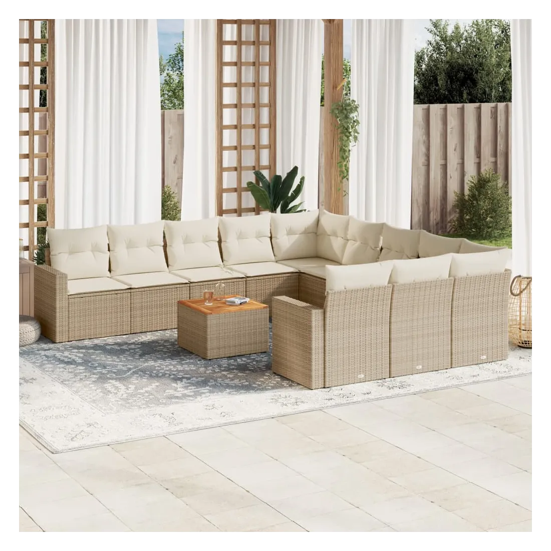 Cet ensemble de canapés de jardin est le complément parfait de votre arrière-cour, terrasse ou patio, offrant un espace confortable et accueillant pour discuter avec la famille et les amis ou simplement se détendre et profiter de l'extérieur. Matériau durable : la résine tressée, également connue sous le nom de poly rotin, est un matériau synthétique solide et nécessitant peu d'entretien qui ressemble au rotin naturel. Il est léger, facile à nettoyer et couramment utilisé pour les meubles d'extérieur en raison de sa durabilité et de ses propriétés de résistance aux intempéries.Dessus stable et facile à nettoyer : cette table de jardin a un dessus en bois d'acacia robuste, durable et facile à nettoyer avec un chiffon humide.Expérience d'assise confortable : ce mobilier d'extérieur, doté de coussins épais, offre une expérience d'assise confortable.Housse amovible et lavable : ces coussins de siège sont dotés de housses amovibles pour un lavage et un entretien faciles.Conception modulaire : cet ensemble de meubles d'extérieur a une conception modulaire, ce qui le rend complètement flexible et facile à déplacer, afin que vous puissiez créer un agencement de meubles d'extérieur personnalisé. Bon à savoir :Pour que vos meubles d'extérieur restent beaux, nous vous recommandons de les protéger avec une housse imperméable.