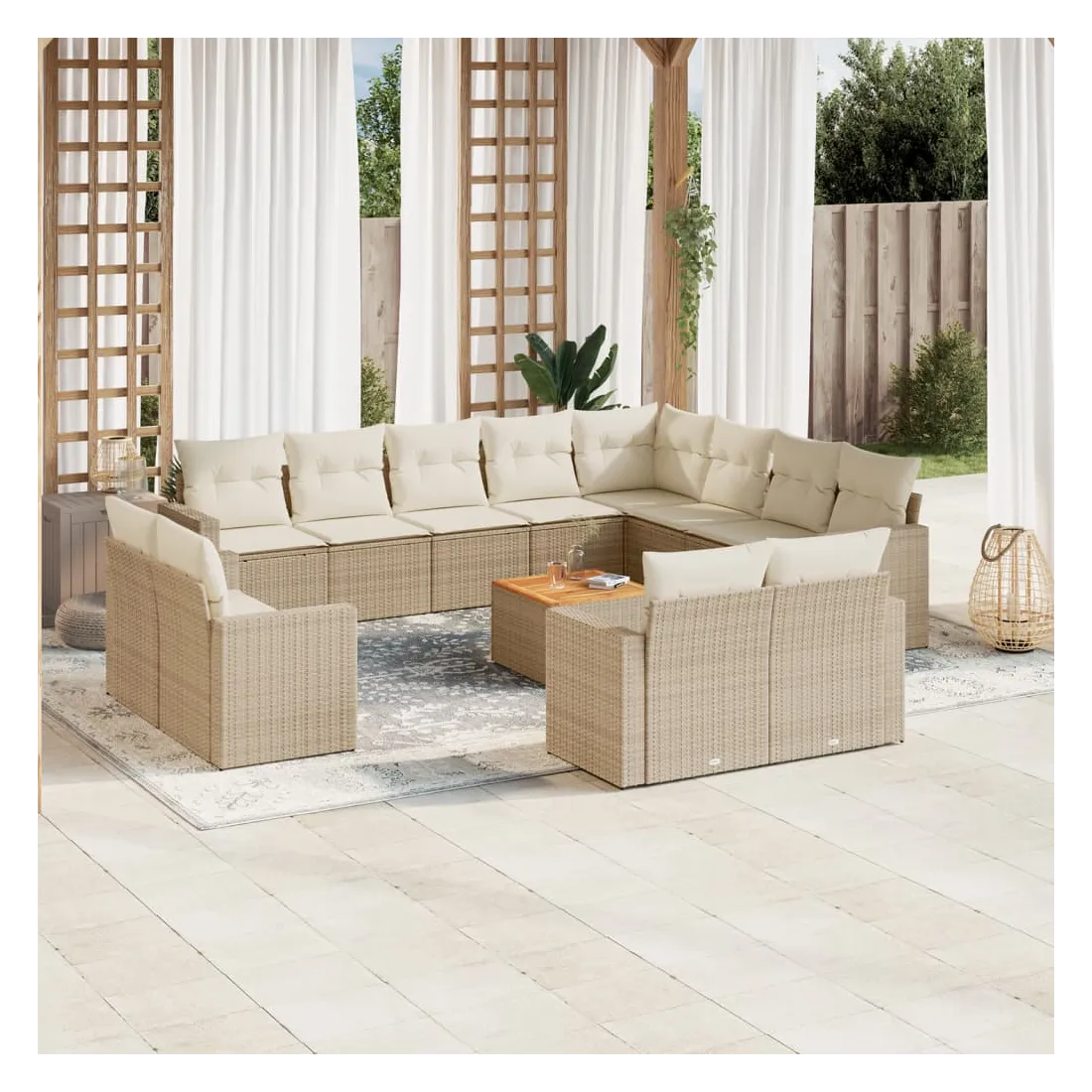 Cet ensemble de canapés de jardin est le complément parfait de votre arrière-cour, terrasse ou patio, offrant un espace confortable et accueillant pour discuter avec la famille et les amis ou simplement se détendre et profiter de l'extérieur. Matériau durable : la résine tressée, également connue sous le nom de poly rotin, est un matériau synthétique solide et nécessitant peu d'entretien qui ressemble au rotin naturel. Il est léger, facile à nettoyer et couramment utilisé pour les meubles d'extérieur en raison de sa durabilité et de ses propriétés de résistance aux intempéries.Dessus stable et facile à nettoyer : cette table de jardin a un dessus en bois d'acacia robuste, durable et facile à nettoyer avec un chiffon humide.Expérience d'assise confortable : ce mobilier d'extérieur, doté de coussins épais, offre une expérience d'assise confortable.Housse amovible et lavable : ces coussins de siège sont dotés de housses amovibles pour un lavage et un entretien faciles.Conception modulaire : cet ensemble de meubles d'extérieur a une conception modulaire, ce qui le rend complètement flexible et facile à déplacer, afin que vous puissiez créer un agencement de meubles d'extérieur personnalisé. Bon à savoir :Pour que vos meubles d'extérieur restent beaux, nous vous recommandons de les protéger avec une housse imperméable.