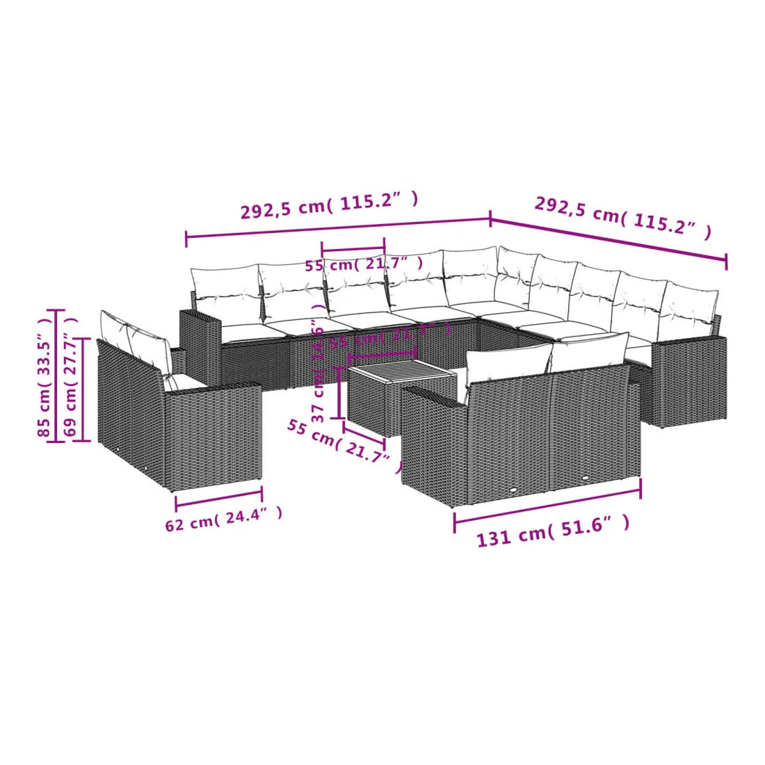 - Dimensions du coussin de siège : 55 x 55 x 3 cm (l x P x é)