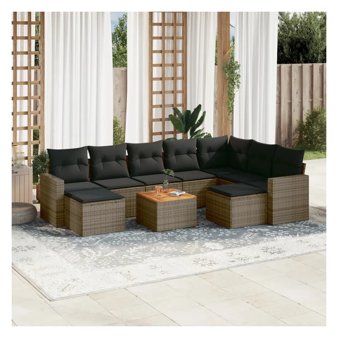 Cet ensemble de canapés de jardin est le complément parfait de votre arrière-cour, terrasse ou patio, offrant un espace confortable et accueillant pour discuter avec la famille et les amis ou simplement se détendre et profiter de l'extérieur. Matériau durable : la résine tressée, également connue sous le nom de poly rotin, est un matériau synthétique solide et nécessitant peu d'entretien qui ressemble au rotin naturel. Il est léger, facile à nettoyer et couramment utilisé pour les meubles d'extérieur en raison de sa durabilité et de ses propriétés de résistance aux intempéries.Dessus stable et facile à nettoyer : cette table de jardin a un dessus en bois d'acacia robuste, durable et facile à nettoyer avec un chiffon humide.Expérience d'assise confortable : ce mobilier d'extérieur, doté de coussins épais, offre une expérience d'assise confortable.Housse amovible et lavable : ces coussins de siège sont dotés de housses amovibles pour un lavage et un entretien faciles.Conception modulaire : cet ensemble de meubles d'extérieur a une conception modulaire, ce qui le rend complètement flexible et facile à déplacer, afin que vous puissiez créer un agencement de meubles d'extérieur personnalisé. Bon à savoir :Pour que vos meubles d'extérieur restent beaux, nous vous recommandons de les protéger avec une housse imperméable.