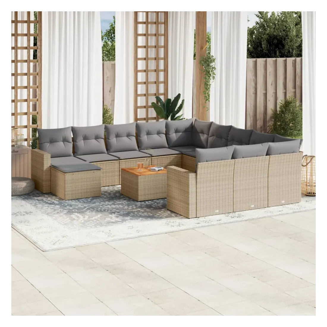 Cet ensemble de canapés de jardin est le complément parfait de votre arrière-cour, terrasse ou patio, offrant un espace confortable et accueillant pour discuter avec la famille et les amis ou simplement se détendre et profiter de l'extérieur. Matériau durable : la résine tressée, également connue sous le nom de poly rotin, est un matériau synthétique solide et nécessitant peu d'entretien qui ressemble au rotin naturel. Il est léger, facile à nettoyer et couramment utilisé pour les meubles d'extérieur en raison de sa durabilité et de ses propriétés de résistance aux intempéries.Dessus stable et facile à nettoyer : cette table de jardin a un dessus en bois d'acacia robuste, durable et facile à nettoyer avec un chiffon humide.Expérience d'assise confortable : ce mobilier d'extérieur, doté de coussins épais, offre une expérience d'assise confortable.Housse amovible et lavable : ces coussins de siège sont dotés de housses amovibles pour un lavage et un entretien faciles.Conception modulaire : cet ensemble de meubles d'extérieur a une conception modulaire, ce qui le rend complètement flexible et facile à déplacer, afin que vous puissiez créer un agencement de meubles d'extérieur personnalisé. Bon à savoir :Pour que vos meubles d'extérieur restent beaux, nous vous recommandons de les protéger avec une housse imperméable.