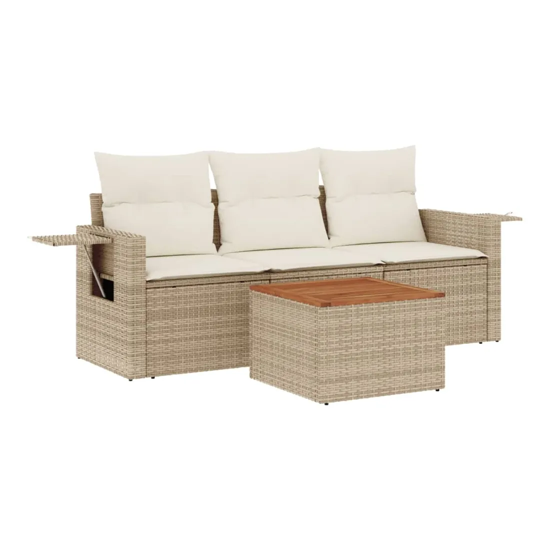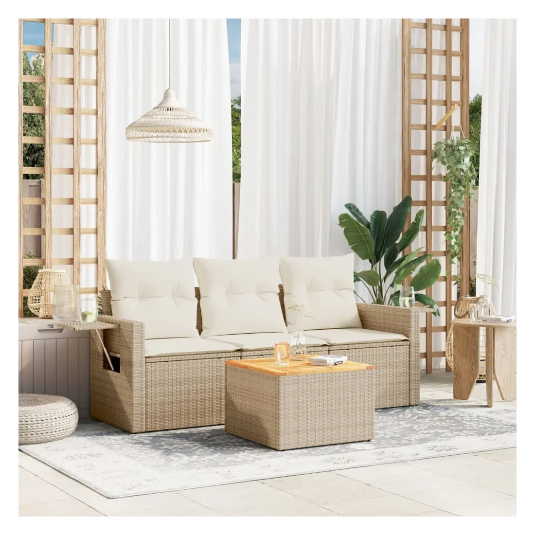 Cet ensemble de canapés de jardin est le complément parfait de votre arrière-cour, terrasse ou patio, offrant un espace confortable et accueillant pour discuter avec la famille et les amis ou simplement se détendre et profiter de l'extérieur. Matériau durable : la résine tressée, également connue sous le nom de poly rotin, est un matériau synthétique solide et nécessitant peu d'entretien qui ressemble au rotin naturel. Il est léger, facile à nettoyer et couramment utilisé pour les meubles d'extérieur en raison de sa durabilité et de ses propriétés de résistance aux intempéries.Table d'appoint pratique : ce mobilier d'extérieur comprend une table d'appoint pliable avec un ressort à gaz sur les accoudoirs, offrant un endroit pratique pour garder vos essentiels à portée de main.Dessus stable et facile à nettoyer : cette table de jardin a un dessus en bois d'acacia robuste, durable et facile à nettoyer avec un chiffon humide.Housse amovible et lavable : ces coussins de siège sont dotés de housses amovibles pour un lavage et un entretien faciles.Conception modulaire : cet ensemble de meubles d'extérieur a une conception modulaire, ce qui le rend complètement flexible et facile à déplacer, afin que vous puissiez créer un agencement de meubles d'extérieur personnalisé. Bon à savoir :Pour que vos meubles d'extérieur restent beaux, nous vous recommandons de les protéger avec une housse imperméable.