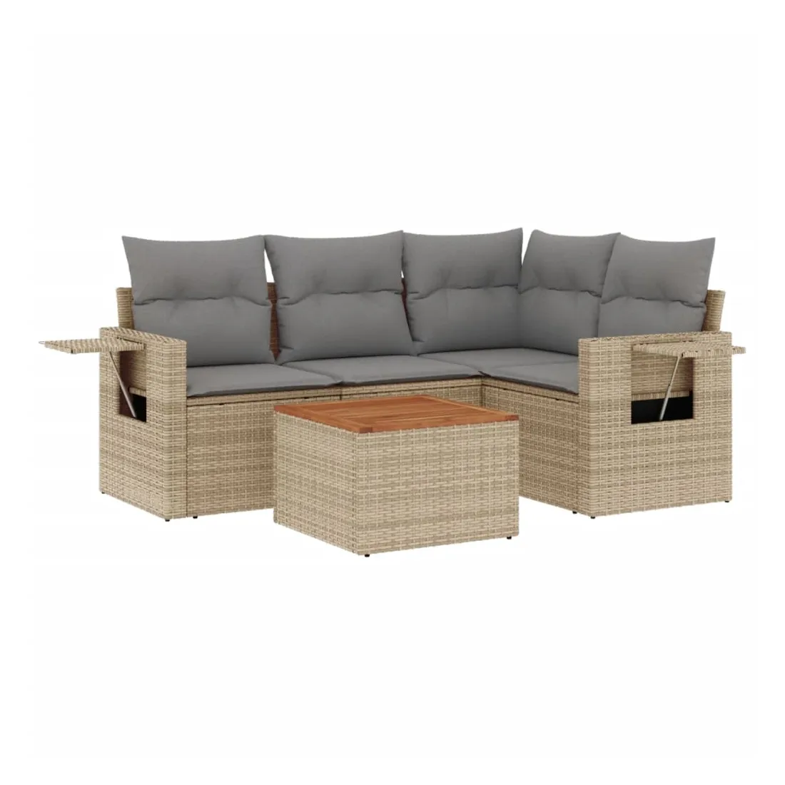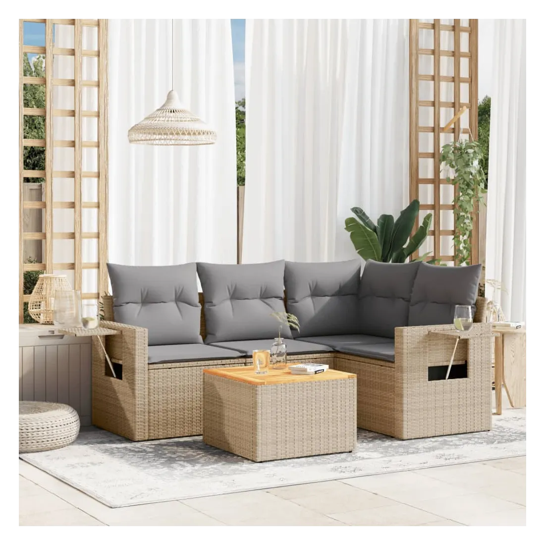 Cet ensemble de canapés de jardin est le complément parfait de votre arrière-cour, terrasse ou patio, offrant un espace confortable et accueillant pour discuter avec la famille et les amis ou simplement se détendre et profiter de l'extérieur. Matériau durable : la résine tressée, également connue sous le nom de poly rotin, est un matériau synthétique solide et nécessitant peu d'entretien qui ressemble au rotin naturel. Il est léger, facile à nettoyer et couramment utilisé pour les meubles d'extérieur en raison de sa durabilité et de ses propriétés de résistance aux intempéries.Table d'appoint pratique : ce mobilier d'extérieur comprend une table d'appoint pliable avec un ressort à gaz sur les accoudoirs, offrant un endroit pratique pour garder vos essentiels à portée de main.Dessus stable et facile à nettoyer : cette table de jardin a un dessus en bois d'acacia robuste, durable et facile à nettoyer avec un chiffon humide.Housse amovible et lavable : ces coussins de siège sont dotés de housses amovibles pour un lavage et un entretien faciles.Conception modulaire : cet ensemble de meubles d'extérieur a une conception modulaire, ce qui le rend complètement flexible et facile à déplacer, afin que vous puissiez créer un agencement de meubles d'extérieur personnalisé. Bon à savoir :Pour que vos meubles d'extérieur restent beaux, nous vous recommandons de les protéger avec une housse imperméable.