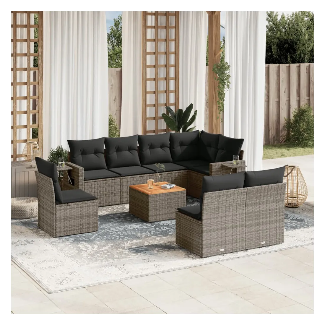 Cet ensemble de canapés de jardin est le complément parfait de votre arrière-cour, terrasse ou patio, offrant un espace confortable et accueillant pour discuter avec la famille et les amis ou simplement se détendre et profiter de l'extérieur. Matériau durable : la résine tressée, également connue sous le nom de poly rotin, est un matériau synthétique solide et nécessitant peu d'entretien qui ressemble au rotin naturel. Il est léger, facile à nettoyer et couramment utilisé pour les meubles d'extérieur en raison de sa durabilité et de ses propriétés de résistance aux intempéries.Table d'appoint pratique : ce mobilier d'extérieur comprend une table d'appoint pliable avec un ressort à gaz sur les accoudoirs, offrant un endroit pratique pour garder vos essentiels à portée de main.Dessus stable et facile à nettoyer : cette table de jardin a un dessus en bois d'acacia robuste, durable et facile à nettoyer avec un chiffon humide.Housse amovible et lavable : ces coussins de siège sont dotés de housses amovibles pour un lavage et un entretien faciles.Conception modulaire : cet ensemble de meubles d'extérieur a une conception modulaire, ce qui le rend complètement flexible et facile à déplacer, afin que vous puissiez créer un agencement de meubles d'extérieur personnalisé. Bon à savoir :Pour que vos meubles d'extérieur restent beaux, nous vous recommandons de les protéger avec une housse imperméable.