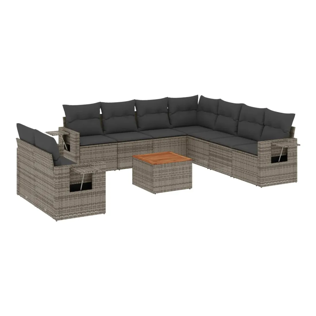 Cet ensemble de canapés de jardin est le complément parfait de votre arrière-cour, terrasse ou patio, offrant un espace confortable et accueillant pour discuter avec la famille et les amis ou simplement se détendre et profiter de l'extérieur. Matériau durable : la résine tressée, également connue sous le nom de poly rotin, est un matériau synthétique solide et nécessitant peu d'entretien qui ressemble au rotin naturel. Il est léger, facile à nettoyer et couramment utilisé pour les meubles d'extérieur en raison de sa durabilité et de ses propriétés de résistance aux intempéries.Table d'appoint pratique : ce mobilier d'extérieur comprend une table d'appoint pliable avec un ressort à gaz sur les accoudoirs, offrant un endroit pratique pour garder vos essentiels à portée de main.Dessus stable et facile à nettoyer : cette table de jardin a un dessus en bois d'acacia robuste, durable et facile à nettoyer avec un chiffon humide.Housse amovible et lavable : ces coussins de siège sont dotés de housses amovibles pour un lavage et un entretien faciles.Conception modulaire : cet ensemble de meubles d'extérieur a une conception modulaire, ce qui le rend complètement flexible et facile à déplacer, afin que vous puissiez créer un agencement de meubles d'extérieur personnalisé. Bon à savoir :Pour que vos meubles d'extérieur restent beaux, nous vous recommandons de les protéger avec une housse imperméable.
