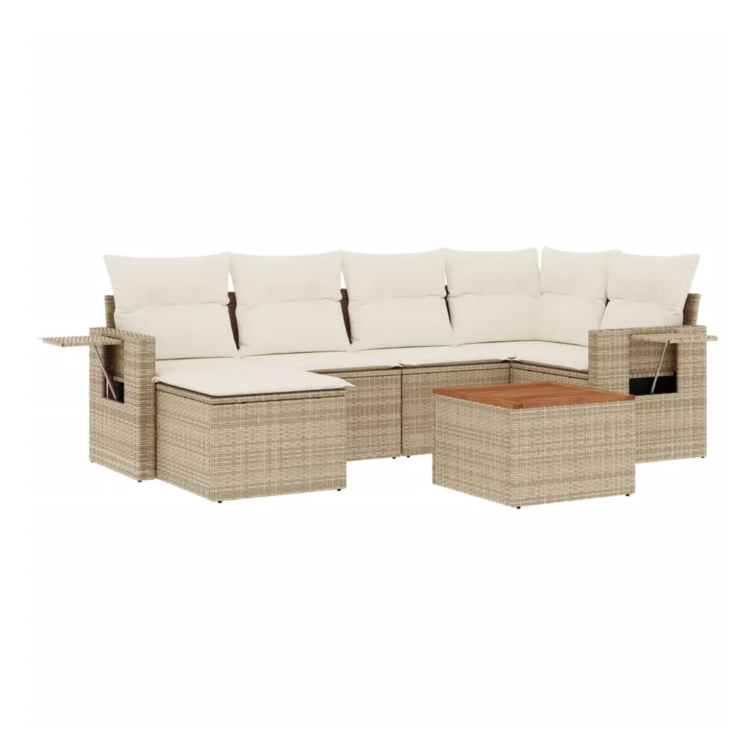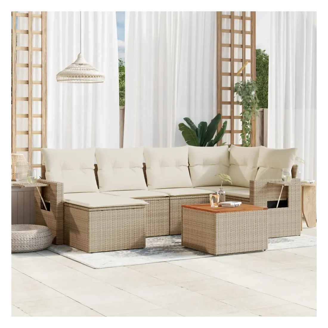Cet ensemble de canapés de jardin est le complément parfait de votre arrière-cour, terrasse ou patio, offrant un espace confortable et accueillant pour discuter avec la famille et les amis ou simplement se détendre et profiter de l'extérieur. Matériau durable : la résine tressée, également connue sous le nom de poly rotin, est un matériau synthétique solide et nécessitant peu d'entretien qui ressemble au rotin naturel. Il est léger, facile à nettoyer et couramment utilisé pour les meubles d'extérieur en raison de sa durabilité et de ses propriétés de résistance aux intempéries.Table d'appoint pratique : ce mobilier d'extérieur comprend une table d'appoint pliable avec un ressort à gaz sur les accoudoirs, offrant un endroit pratique pour garder vos essentiels à portée de main.Dessus stable et facile à nettoyer : cette table de jardin a un dessus en bois d'acacia robuste, durable et facile à nettoyer avec un chiffon humide.Housse amovible et lavable : ces coussins de siège sont dotés de housses amovibles pour un lavage et un entretien faciles.Conception modulaire : cet ensemble de meubles d'extérieur a une conception modulaire, ce qui le rend complètement flexible et facile à déplacer, afin que vous puissiez créer un agencement de meubles d'extérieur personnalisé. Bon à savoir :Pour que vos meubles d'extérieur restent beaux, nous vous recommandons de les protéger avec une housse imperméable.