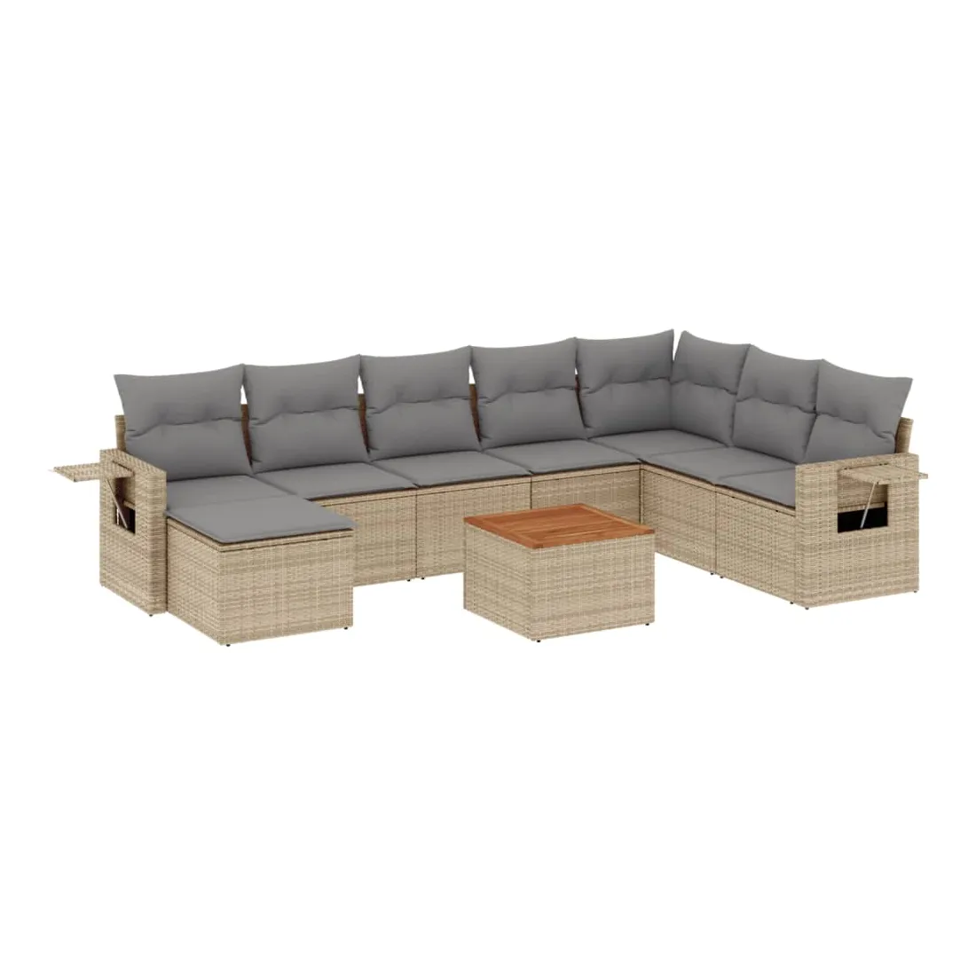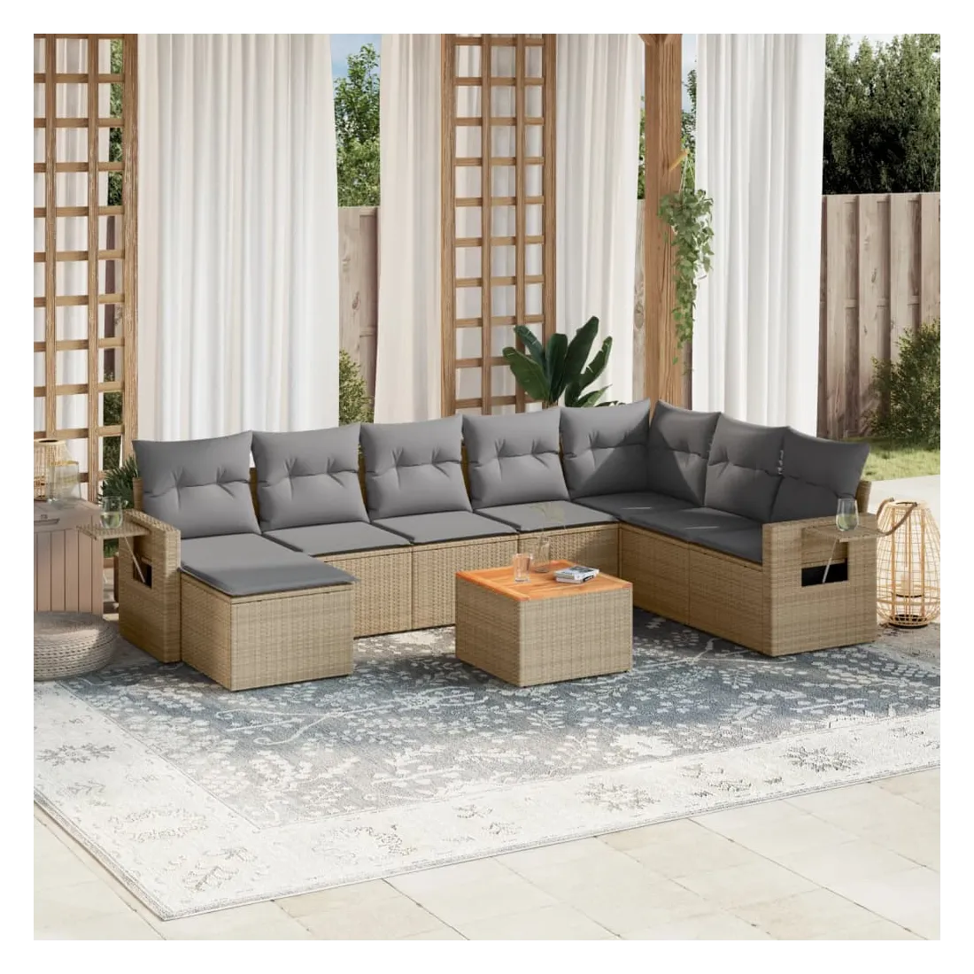 Cet ensemble de canapés de jardin est le complément parfait de votre arrière-cour, terrasse ou patio, offrant un espace confortable et accueillant pour discuter avec la famille et les amis ou simplement se détendre et profiter de l'extérieur. Matériau durable : la résine tressée, également connue sous le nom de poly rotin, est un matériau synthétique solide et nécessitant peu d'entretien qui ressemble au rotin naturel. Il est léger, facile à nettoyer et couramment utilisé pour les meubles d'extérieur en raison de sa durabilité et de ses propriétés de résistance aux intempéries.Table d'appoint pratique : ce mobilier d'extérieur comprend une table d'appoint pliable avec un ressort à gaz sur les accoudoirs, offrant un endroit pratique pour garder vos essentiels à portée de main.Dessus stable et facile à nettoyer : cette table de jardin a un dessus en bois d'acacia robuste, durable et facile à nettoyer avec un chiffon humide.Housse amovible et lavable : ces coussins de siège sont dotés de housses amovibles pour un lavage et un entretien faciles.Conception modulaire : cet ensemble de meubles d'extérieur a une conception modulaire, ce qui le rend complètement flexible et facile à déplacer, afin que vous puissiez créer un agencement de meubles d'extérieur personnalisé. Bon à savoir :Pour que vos meubles d'extérieur restent beaux, nous vous recommandons de les protéger avec une housse imperméable.