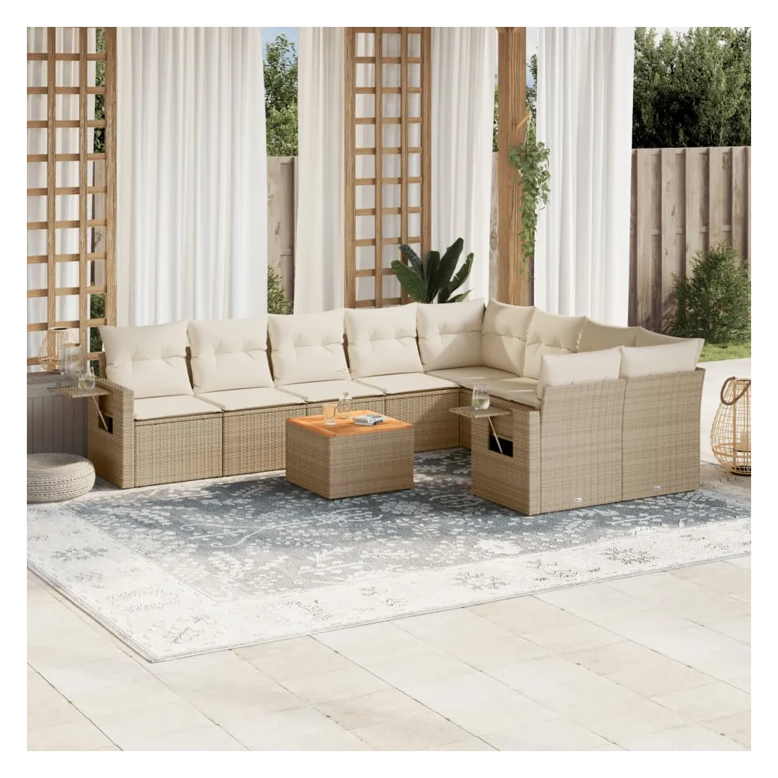 Cet ensemble de canapés de jardin est le complément parfait de votre arrière-cour, terrasse ou patio, offrant un espace confortable et accueillant pour discuter avec la famille et les amis ou simplement se détendre et profiter de l'extérieur. Matériau durable : la résine tressée, également connue sous le nom de poly rotin, est un matériau synthétique solide et nécessitant peu d'entretien qui ressemble au rotin naturel. Il est léger, facile à nettoyer et couramment utilisé pour les meubles d'extérieur en raison de sa durabilité et de ses propriétés de résistance aux intempéries.Table d'appoint pratique : ce mobilier d'extérieur comprend une table d'appoint pliable avec un ressort à gaz sur les accoudoirs, offrant un endroit pratique pour garder vos essentiels à portée de main.Dessus stable et facile à nettoyer : cette table de jardin a un dessus en bois d'acacia robuste, durable et facile à nettoyer avec un chiffon humide.Housse amovible et lavable : ces coussins de siège sont dotés de housses amovibles pour un lavage et un entretien faciles.Conception modulaire : cet ensemble de meubles d'extérieur a une conception modulaire, ce qui le rend complètement flexible et facile à déplacer, afin que vous puissiez créer un agencement de meubles d'extérieur personnalisé. Bon à savoir :Pour que vos meubles d'extérieur restent beaux, nous vous recommandons de les protéger avec une housse imperméable.