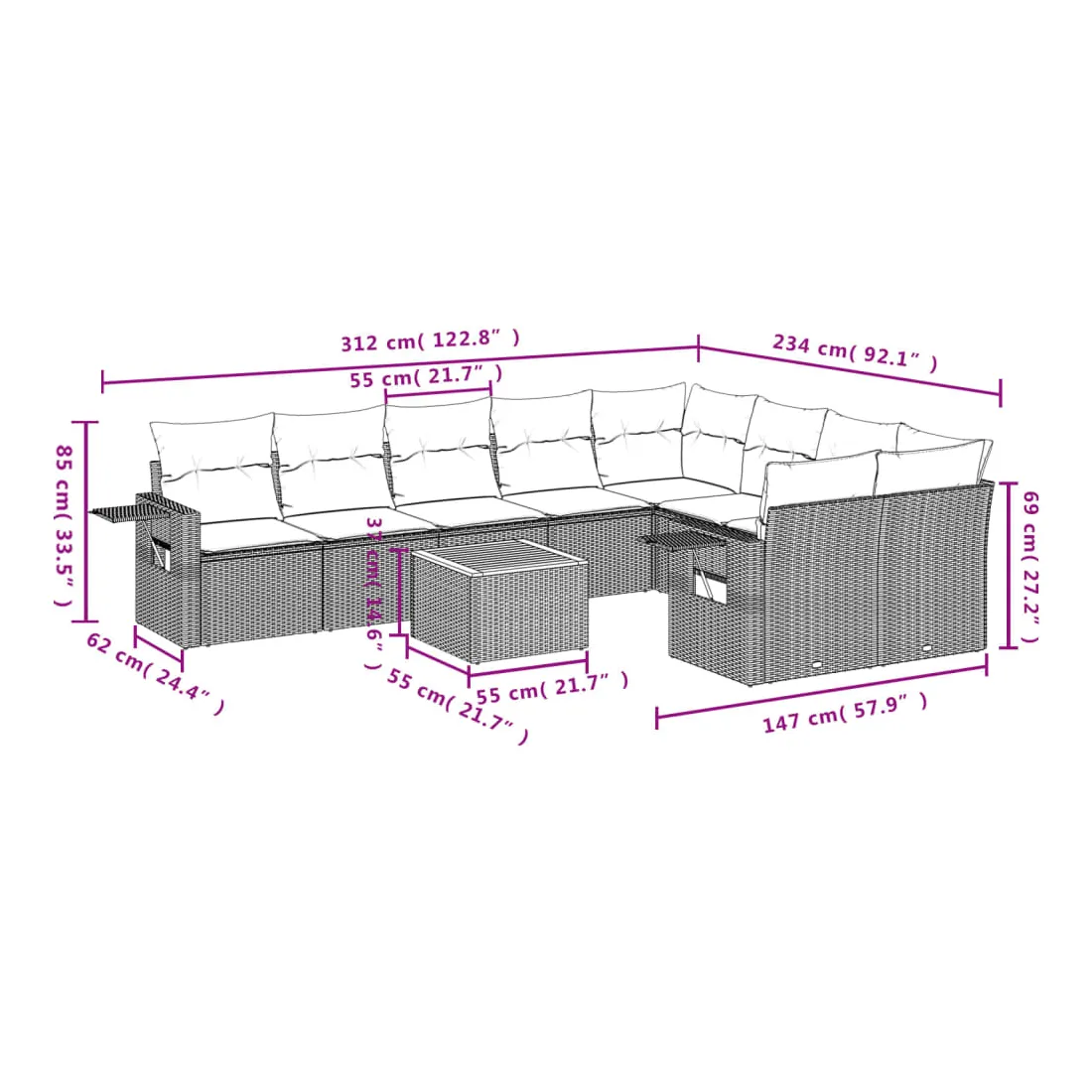 - 9 x coussin d'assise avec housse amovible et lavable