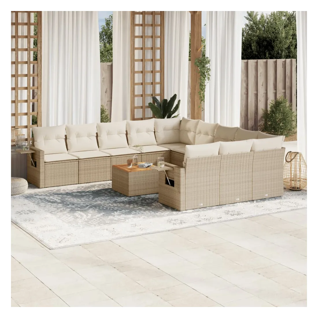 Cet ensemble de canapés de jardin est le complément parfait de votre arrière-cour, terrasse ou patio, offrant un espace confortable et accueillant pour discuter avec la famille et les amis ou simplement se détendre et profiter de l'extérieur. Matériau durable : la résine tressée, également connue sous le nom de poly rotin, est un matériau synthétique solide et nécessitant peu d'entretien qui ressemble au rotin naturel. Il est léger, facile à nettoyer et couramment utilisé pour les meubles d'extérieur en raison de sa durabilité et de ses propriétés de résistance aux intempéries.Table d'appoint pratique : ce mobilier d'extérieur comprend une table d'appoint pliable avec un ressort à gaz sur les accoudoirs, offrant un endroit pratique pour garder vos essentiels à portée de main.Dessus stable et facile à nettoyer : cette table de jardin a un dessus en bois d'acacia robuste, durable et facile à nettoyer avec un chiffon humide.Housse amovible et lavable : ces coussins de siège sont dotés de housses amovibles pour un lavage et un entretien faciles.Conception modulaire : cet ensemble de meubles d'extérieur a une conception modulaire, ce qui le rend complètement flexible et facile à déplacer, afin que vous puissiez créer un agencement de meubles d'extérieur personnalisé. Bon à savoir :Pour que vos meubles d'extérieur restent beaux, nous vous recommandons de les protéger avec une housse imperméable.