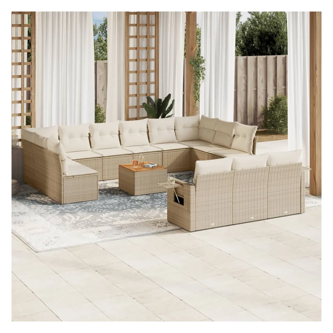 Cet ensemble de canapés de jardin est le complément parfait de votre arrière-cour, terrasse ou patio, offrant un espace confortable et accueillant pour discuter avec la famille et les amis ou simplement se détendre et profiter de l'extérieur. Matériau durable : la résine tressée, également connue sous le nom de poly rotin, est un matériau synthétique solide et nécessitant peu d'entretien qui ressemble au rotin naturel. Il est léger, facile à nettoyer et couramment utilisé pour les meubles d'extérieur en raison de sa durabilité et de ses propriétés de résistance aux intempéries.Table d'appoint pratique : ce mobilier d'extérieur comprend une table d'appoint pliable avec un ressort à gaz sur les accoudoirs, offrant un endroit pratique pour garder vos essentiels à portée de main.Dessus stable et facile à nettoyer : cette table de jardin a un dessus en bois d'acacia robuste, durable et facile à nettoyer avec un chiffon humide.Housse amovible et lavable : ces coussins de siège sont dotés de housses amovibles pour un lavage et un entretien faciles.Conception modulaire : cet ensemble de meubles d'extérieur a une conception modulaire, ce qui le rend complètement flexible et facile à déplacer, afin que vous puissiez créer un agencement de meubles d'extérieur personnalisé. Bon à savoir :Pour que vos meubles d'extérieur restent beaux, nous vous recommandons de les protéger avec une housse imperméable.