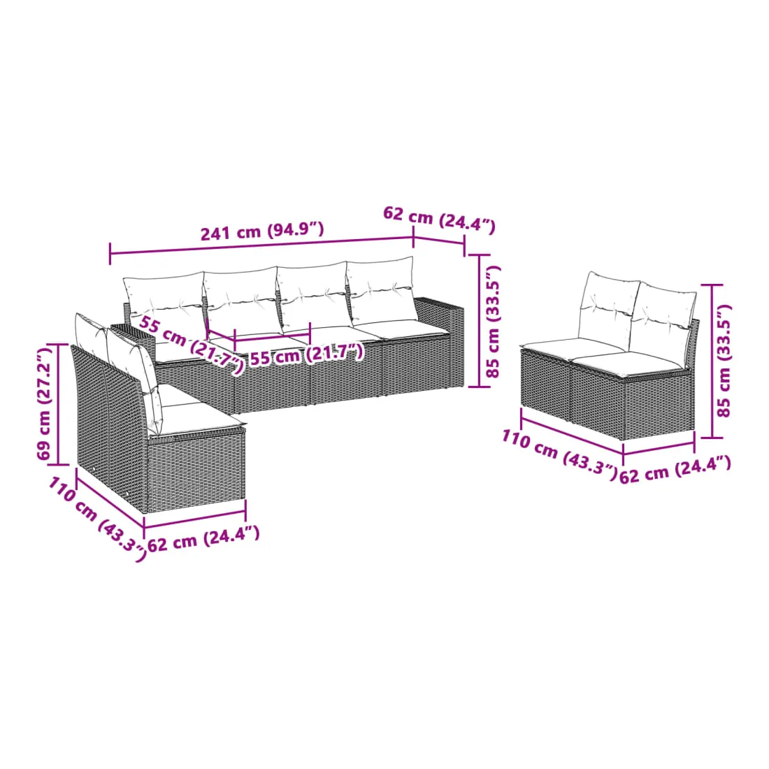 Cet ensemble de canapés de jardin est le complément parfait de votre arrière-cour, terrasse ou patio, offrant un espace confortable et accueillant pour discuter avec la famille et les amis ou simplement se détendre et profiter de l'extérieur. Matériau durable : la résine tressée, également connue sous le nom de poly rotin, est un matériau synthétique solide et nécessitant peu d'entretien qui ressemble au rotin naturel. Il est léger, facile à nettoyer et couramment utilisé pour les meubles d'extérieur en raison de sa durabilité et de ses propriétés de résistance aux intempéries.Fonction de rangement avec sac résistant à l'eau : chaque siège de jardin dispose d'un espace de rangement sous l'assise, complété par un sac résistant à l'eau pour ranger les coussins, les jouets et d'autres objets. Les sacs intérieurs sont dotés d'un couvercle et peuvent être solidement fixés aux sièges à l'aide de bandes auto-agrippantes pour plus de stabilité.Expérience d'assise confortable : ce mobilier d'extérieur, doté de coussins épais, offre une expérience d'assise confortable.Housse amovible et lavable : ces coussins de siège sont dotés de housses amovibles pour un lavage et un entretien faciles.Conception modulaire : cet ensemble de meubles d'extérieur a une conception modulaire, ce qui le rend complètement flexible et facile à déplacer, afin que vous puissiez créer un agencement de meubles d'extérieur personnalisé. Bon à savoir :Pour que vos meubles d'extérieur restent beaux, nous vous recommandons de les protéger avec une housse imperméable.