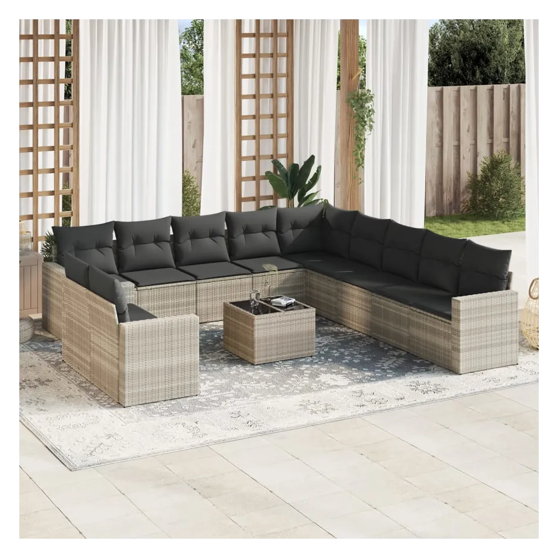 Cet ensemble de canapés de jardin est le complément parfait de votre arrière-cour, terrasse ou patio, offrant un espace confortable et accueillant pour discuter avec la famille et les amis ou simplement se détendre et profiter de l'extérieur. Matériau durable : la résine tressée, également connue sous le nom de poly rotin, est un matériau synthétique solide et nécessitant peu d'entretien qui ressemble au rotin naturel. Il est léger, facile à nettoyer et couramment utilisé pour les meubles d'extérieur en raison de sa durabilité et de ses propriétés de résistance aux intempéries.Fonction de rangement avec sac résistant à l'eau : chaque siège de jardin dispose d'un espace de rangement sous l'assise, complété par un sac résistant à l'eau pour ranger les coussins, les jouets et d'autres objets. Les sacs intérieurs sont dotés d'un couvercle et peuvent être solidement fixés aux sièges à l'aide de bandes auto-agrippantes pour plus de stabilité.Dessus en verre : le dessus de la table d'extérieur est fabriqué en verre trempé solide et durable, ce qui le rend facile à nettoyer avec un chiffon humide et ajoute une touche d'élégance à votre espace extérieur.Housse amovible et lavable : ces coussins de siège sont dotés de housses amovibles pour un lavage et un entretien faciles.Conception modulaire : cet ensemble de meubles d'extérieur a une conception modulaire, ce qui le rend complètement flexible et facile à déplacer, afin que vous puissiez créer un agencement de meubles d'extérieur personnalisé. Bon à savoir :Pour que vos meubles d'extérieur restent beaux, nous vous recommandons de les protéger avec une housse imperméable.