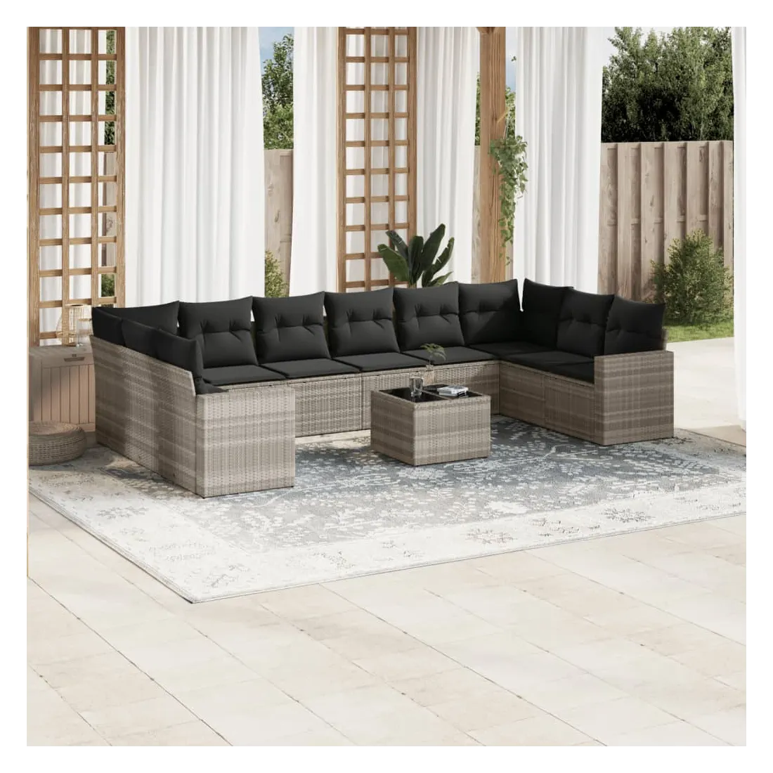 Cet ensemble de canapés de jardin est le complément parfait de votre arrière-cour, terrasse ou patio, offrant un espace confortable et accueillant pour discuter avec la famille et les amis ou simplement se détendre et profiter de l'extérieur. Matériau durable : la résine tressée, également connue sous le nom de poly rotin, est un matériau synthétique solide et nécessitant peu d'entretien qui ressemble au rotin naturel. Il est léger, facile à nettoyer et couramment utilisé pour les meubles d'extérieur en raison de sa durabilité et de ses propriétés de résistance aux intempéries.Fonction de rangement avec sac résistant à l'eau : chaque siège de jardin dispose d'un espace de rangement sous l'assise, complété par un sac résistant à l'eau pour ranger les coussins, les jouets et d'autres objets. Les sacs intérieurs sont dotés d'un couvercle et peuvent être solidement fixés aux sièges à l'aide de bandes auto-agrippantes pour plus de stabilité.Dessus en verre : le dessus de la table d'extérieur est fabriqué en verre trempé solide et durable, ce qui le rend facile à nettoyer avec un chiffon humide et ajoute une touche d'élégance à votre espace extérieur.Housse amovible et lavable : ces coussins de siège sont dotés de housses amovibles pour un lavage et un entretien faciles.Conception modulaire : cet ensemble de meubles d'extérieur a une conception modulaire, ce qui le rend complètement flexible et facile à déplacer, afin que vous puissiez créer un agencement de meubles d'extérieur personnalisé. Bon à savoir :Pour que vos meubles d'extérieur restent beaux, nous vous recommandons de les protéger avec une housse imperméable.
