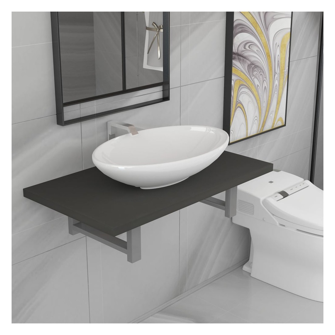 Notre ensemble de meubles de salle de bain pratique et intemporel se compose d'une étagère murale et d'un lavabo de forme ovale. Il fera un ajout élégant à toute salle de bain, salle d'eau ou toilette. Fabriquée dans un matériau solide, l'étagère murale de salle de bain est extrêmement stable et durable, ce qui en fait l'endroit idéal pour placer le lavabo en céramique inclus. Ce lavabo en céramique a une finition brillante et est facile à nettoyer avec un chiffon humide. De plus, les meubles de salle de bain peuvent être facilement installés sur le mur avec nos supports et matériaux de montage inclus. La combinaison parfaite de l'étagère murale et du lavabo sera le point d'attention de votre salle de bain ! Veuillez noter qu'aucun drain n'est inclus dans la livraison.