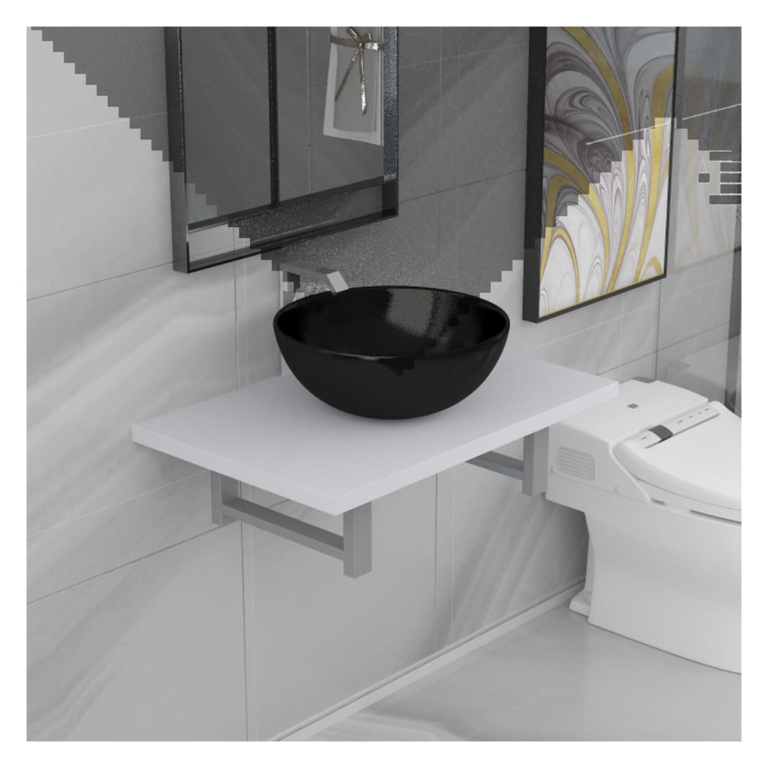 Notre ensemble de meubles de salle de bain pratique et intemporel se compose d'une étagère murale et d'un lavabo de forme ronde. Il fera un ajout élégant à toute salle de bain, salle d'eau ou toilette. Fabriquée dans un matériau solide, l'étagère murale de salle de bain est extrêmement stable et durable, ce qui en fait l'endroit idéal pour placer le lavabo en céramique inclus. Ce lavabo en céramique a une finition brillante et est facile à nettoyer avec un chiffon humide. De plus, les meubles de salle de bain peuvent être facilement installés sur le mur avec nos supports et matériaux de montage inclus. La combinaison parfaite de l'étagère murale et du lavabo sera le point d'attention de votre salle de bain ! Veuillez noter qu'aucun drain n'est inclus dans la livraison.