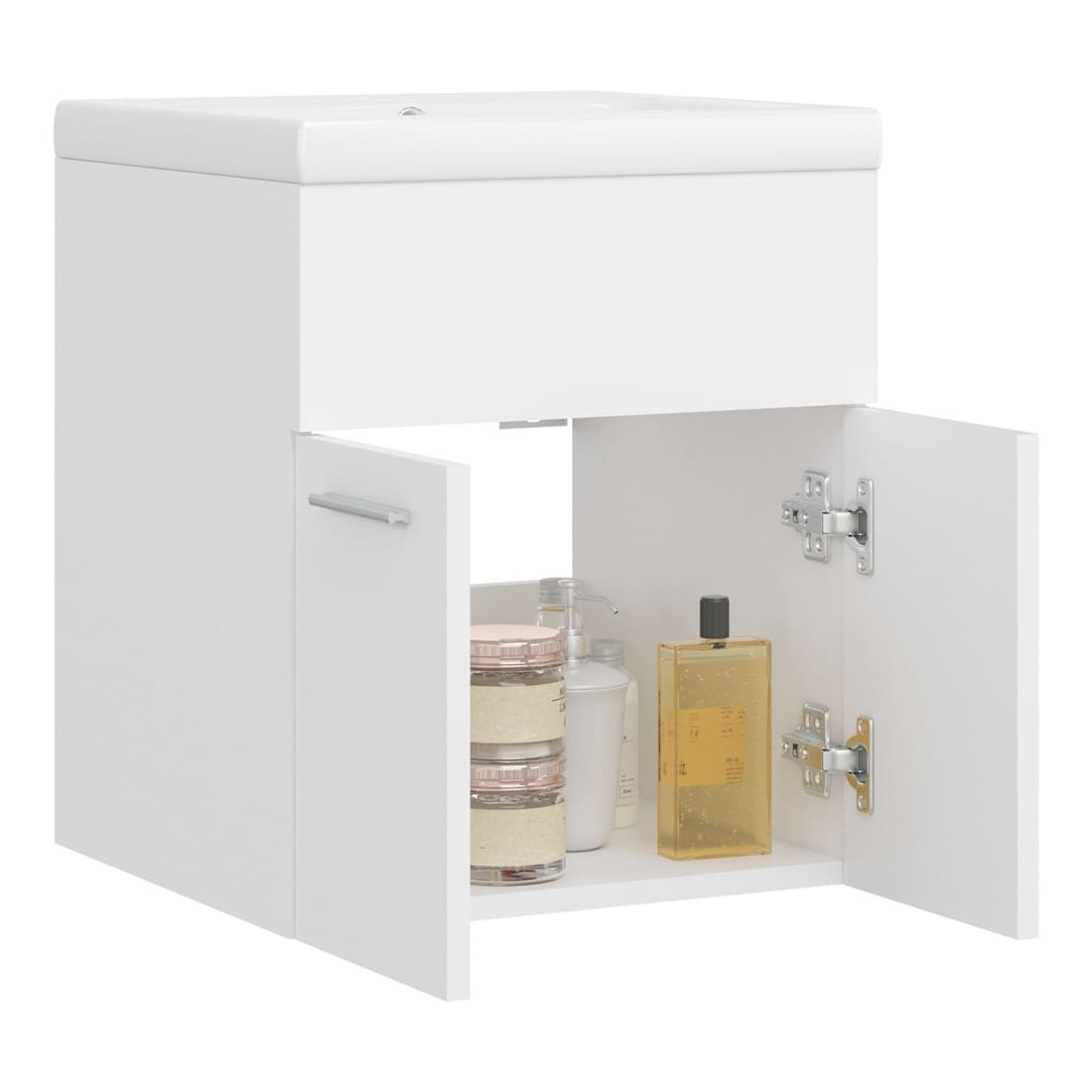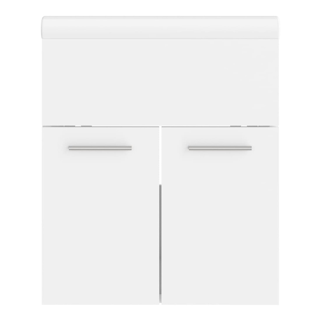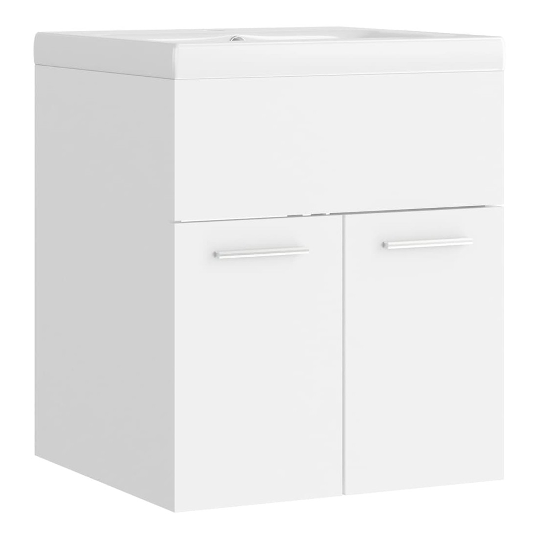 Cette armoire d'évier avec lavabo intégré s'agence parfaitement à votre salle de bain ou toilette avec un aspect saisissant et bien rangé. L'armoire est en aggloméré, ce qui la rend robuste et stable. L'armoire de rangement a 1 compartiment et 2 portes, offrant amplement d'espace pour ranger des objets. Elle s'intègre parfaitement sous l'évier et rend le rangement de la salle de bain très pratique. Fabriqué en céramique, le lavabo peut non seulement servir de récipient pour un usage quotidien, mais également d'ornement dans votre espace de vie. Grâce à son design avant-gardiste et contemporain, ce lavabo s'adaptera à n'importe quel décor. Un trop-plein est également équipé pour évacuer l'eau lorsqu'il est trop plein. Sa surface vitrée lui confère un design à la fois moderne et élégant. De plus, l'armoire et le lavabo sont faciles à nettoyer avec un chiffon humide. Veuillez noter que le robinet et le drain ne sont pas inclus dans la livraison.