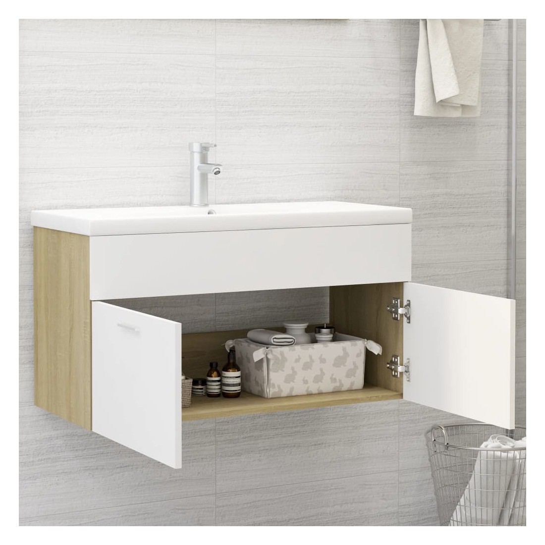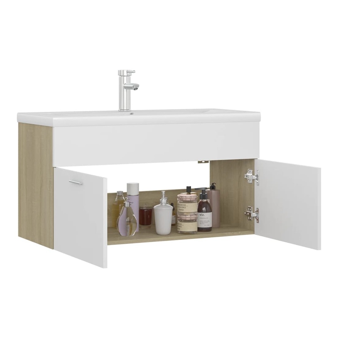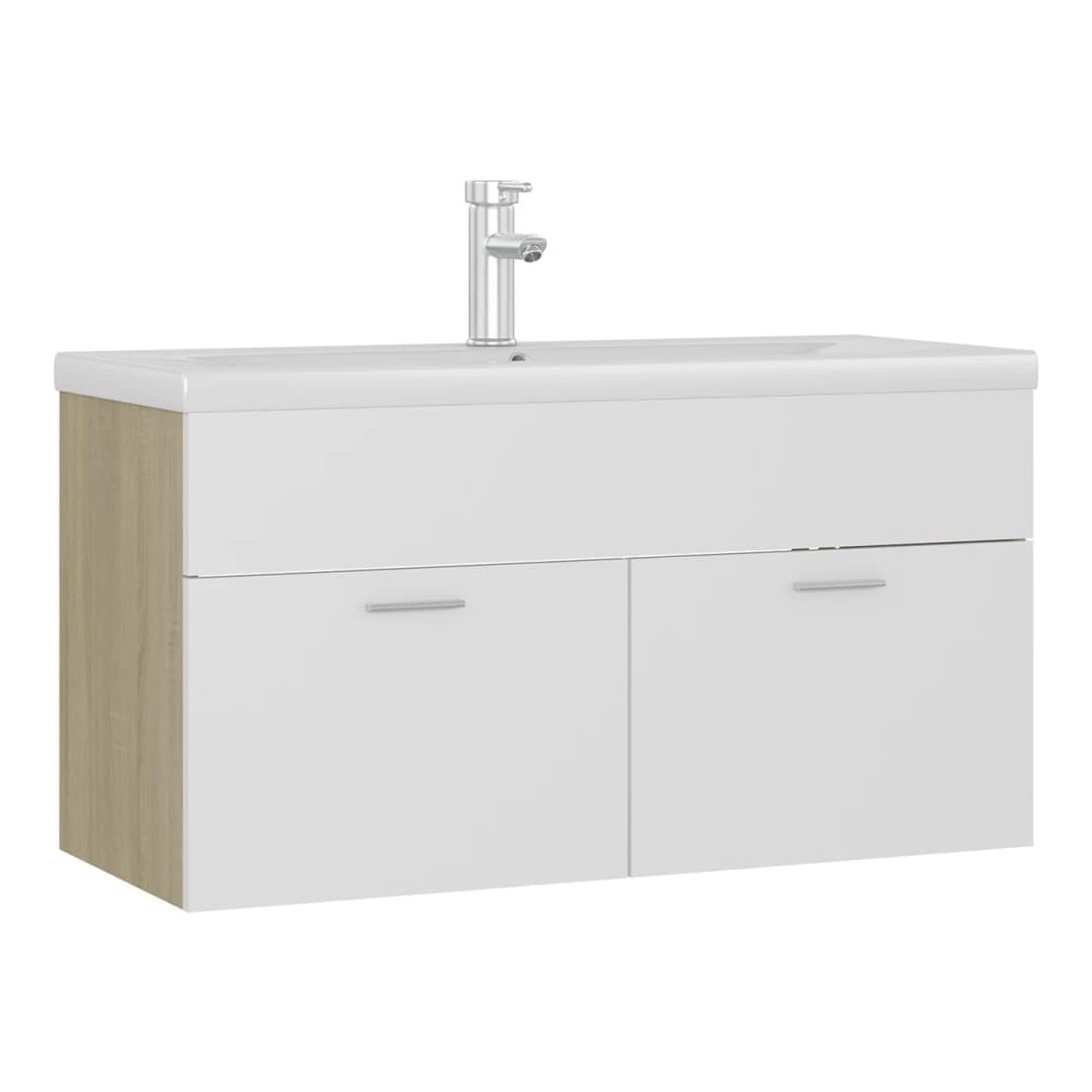 Cette armoire d'évier avec lavabo intégré s'agence parfaitement à votre salle de bain ou toilette avec un aspect saisissant et bien rangé. L'armoire est en aggloméré, ce qui la rend robuste et stable. L'armoire de rangement a 1 compartiment et 2 portes, offrant amplement d'espace pour ranger des objets. Elle s'intègre parfaitement sous l'évier et rend le rangement de la salle de bain très pratique. Fabriqué en céramique, le lavabo peut non seulement servir de récipient pour un usage quotidien, mais également d'ornement dans votre espace de vie. Grâce à son design avant-gardiste et contemporain, ce lavabo s'adaptera à n'importe quel décor. Un trop-plein est également équipé pour vidanger l'eau lorsqu'il est trop plein. Sa surface vitrée lui confère un design à la fois moderne et élégant. De plus, l'armoire et le lavabo sont faciles à nettoyer avec un chiffon humide. Remarque : le robinet et l'égouttoir à poussoir avec fonction de trop-plein sont inclus dans la livraison.