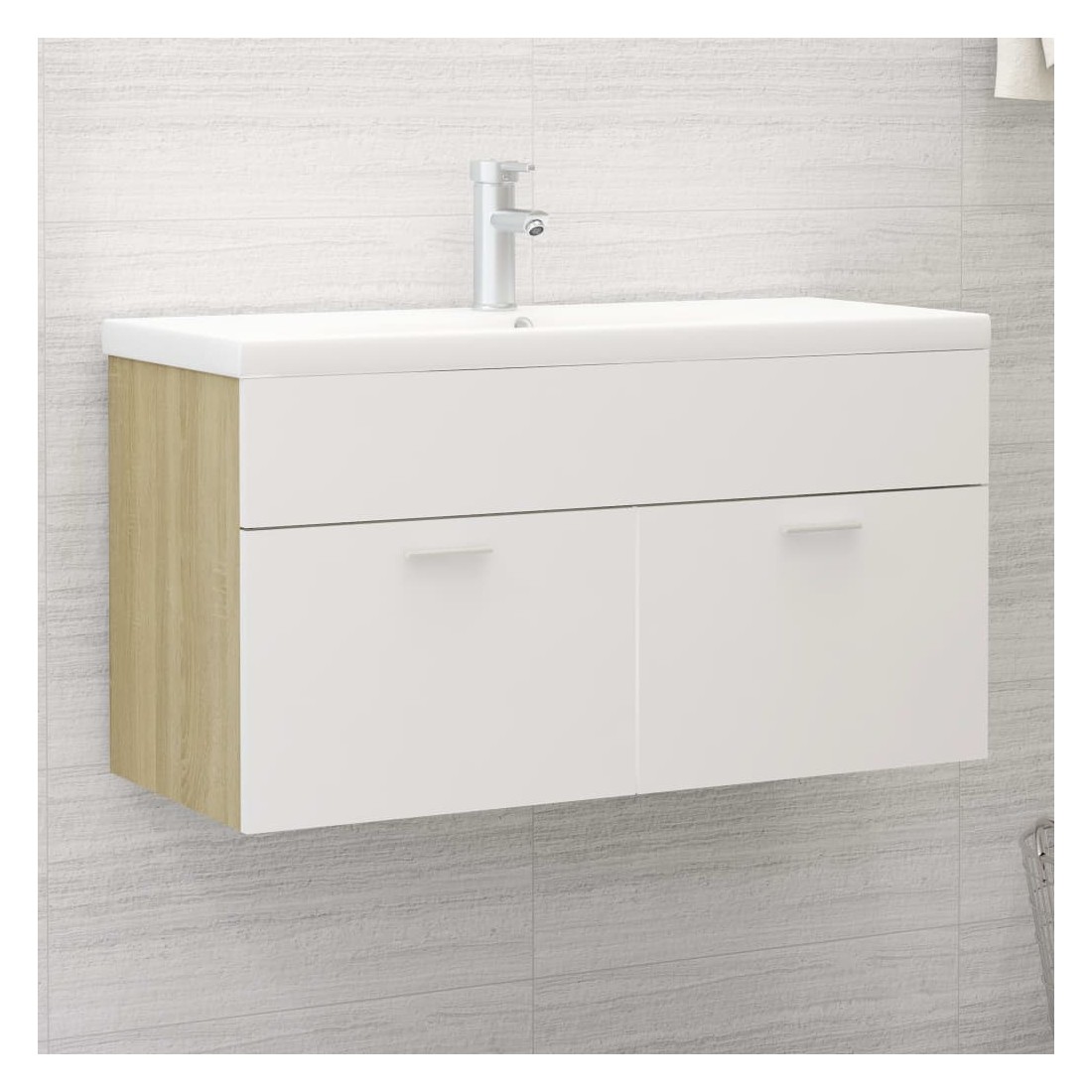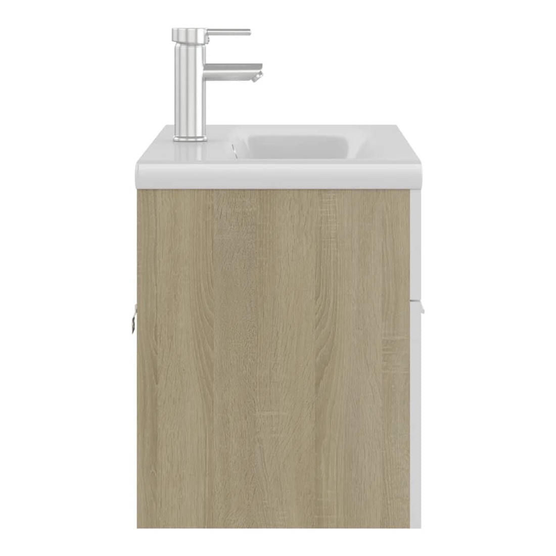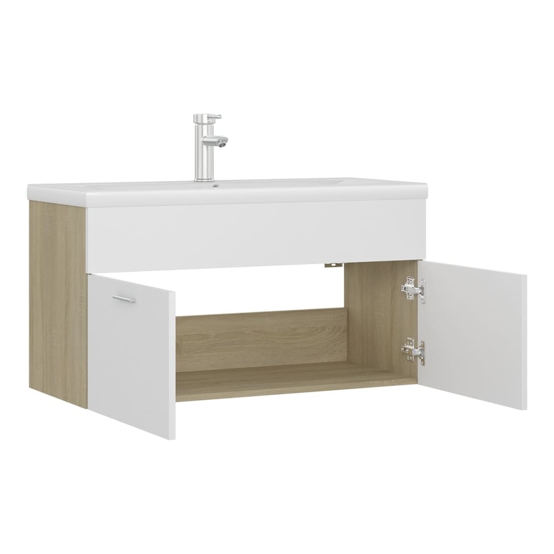 Cette armoire d'évier avec lavabo intégré s'agence parfaitement à votre salle de bain ou toilette avec un aspect saisissant et bien rangé. L'armoire est en aggloméré, ce qui la rend robuste et stable. L'armoire de rangement a 1 compartiment et 2 portes, offrant amplement d'espace pour ranger des objets. Elle s'intègre parfaitement sous l'évier et rend le rangement de la salle de bain très pratique. Fabriqué en céramique, le lavabo peut non seulement servir de récipient pour un usage quotidien, mais également d'ornement dans votre espace de vie. Grâce à son design avant-gardiste et contemporain, ce lavabo s'adaptera à n'importe quel décor. Un trop-plein est également équipé pour vidanger l'eau lorsqu'il est trop plein. Sa surface vitrée lui confère un design à la fois moderne et élégant. De plus, l'armoire et le lavabo sont faciles à nettoyer avec un chiffon humide. Remarque : le robinet et l'égouttoir à poussoir avec fonction de trop-plein sont inclus dans la livraison.