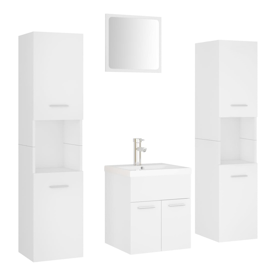 Avec cet élégant ensemble de meubles de salle de bain, vous pouvez créer un espace de rangement supplémentaire pour votre salle de bain avec un aspect remarquable et bien rangé. Les lignes épurées et le design élégant s'intègrent parfaitement à votre salle de bain. L’ensemble de meubles se compose d’une armoire de lavabo, de 2 armoires hautes, d’un lavabo encastré et d’un miroir. L’armoire de lavabo chic a 1 compartiment, et le dessus de celle-ci est idéal pour placer l’évier. Chaque armoire haute dispose d’un total de 5 compartiments et de 2 portes, offrant ainsi un espace suffisant pour ranger les objets de votre salle de bain. Fabriqué en céramique, ce lavabo peut non seulement servir de récipient pour une utilisation quotidienne, mais aussi comme ornement dans votre espace de vie. Grâce à son design tendance et contemporain, ce lavabo conviendra à tout décor. Un trop-plein est équipé pour vidanger l’eau quand il est trop plein. Le miroir ajoute également une excellente apparence à votre décoration intérieure. De plus, cet ensemble de salle de bain est facile à nettoyer avec un chiffon humide. Remarque : le robinet et l'égouttoir à poussoir avec fonction de trop-plein sont inclus dans la livraison.