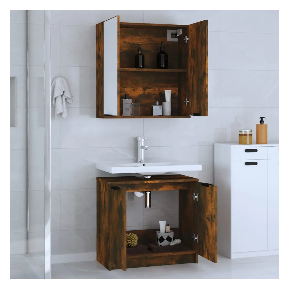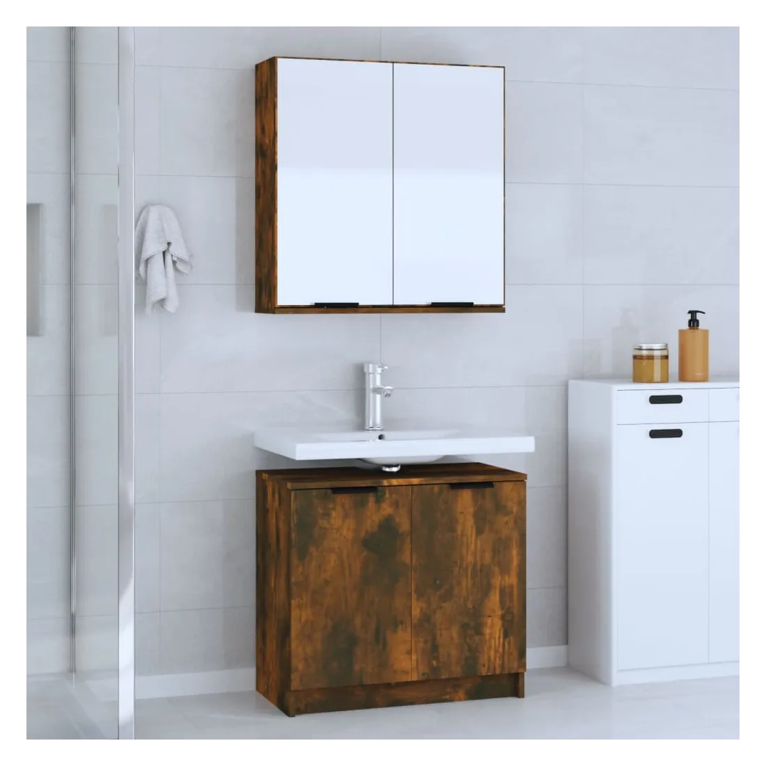 Cet ensemble d'armoires de salle de bain attrayant, avec un grand espace de rangement, présente un design élégant mais pratique. Matériau facile à nettoyer : le bois d'ingénierie est d'une qualité exceptionnelle avec une surface lisse et présente également résistance, stabilité et résistance à l'humidité. Grand espace de rangement : l'espace de rangement facilite l'organisation des articles dans ces meubles de salle de bain. Design élégant : les lignes épurées et le design élégant se fondent parfaitement dans votre salle de bain. Remarque :Les vis et les chevilles pour l'intérieur du mur ne sont pas incluses. Recherchez et utilisez des vis et des chevilles adaptées à vos murs. Si vous n'êtes pas sûr, demandez conseil à un professionnel. Lisez et suivez attentivement chaque étape des instructions. Chaque produit est livré avec un manuel de montage dans la boîte pour un montage facile. Attention :Afin d'éviter qu'il ne bascule, ce produit doit être utilisé avec le dispositif de fixation murale fourni.