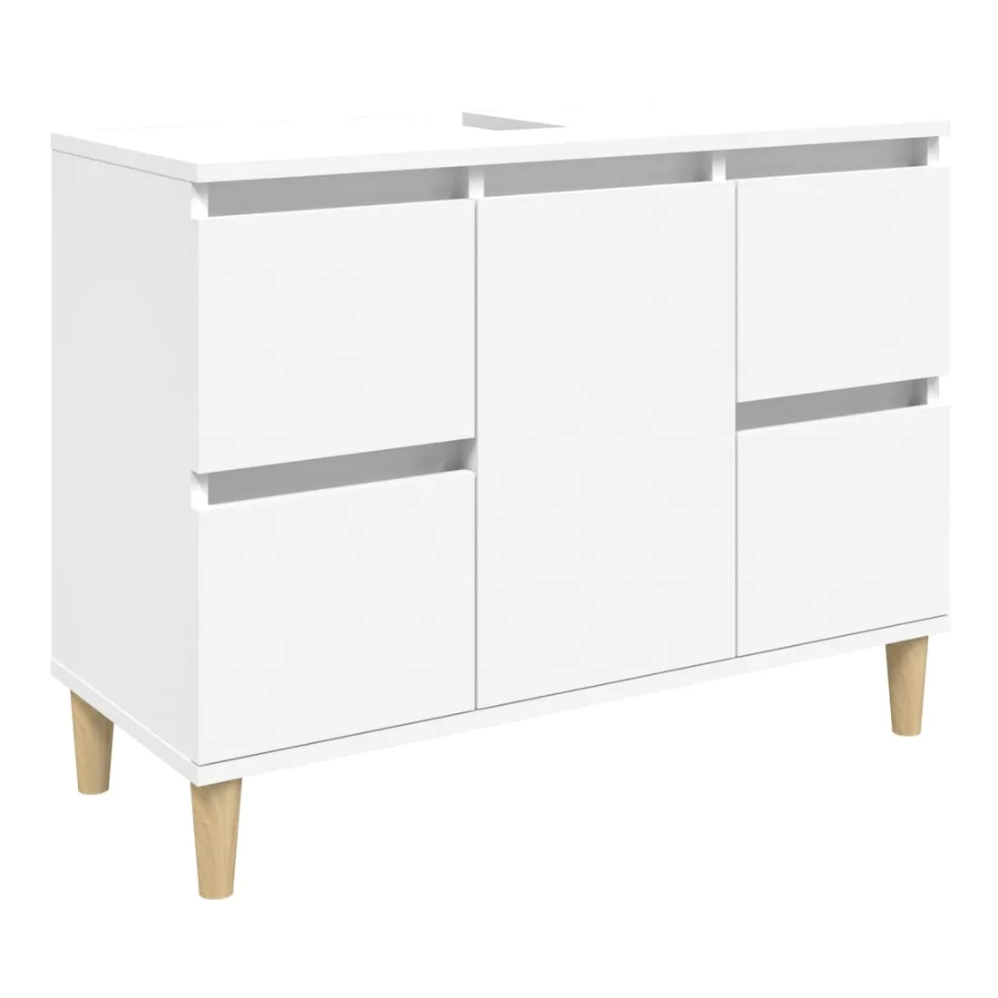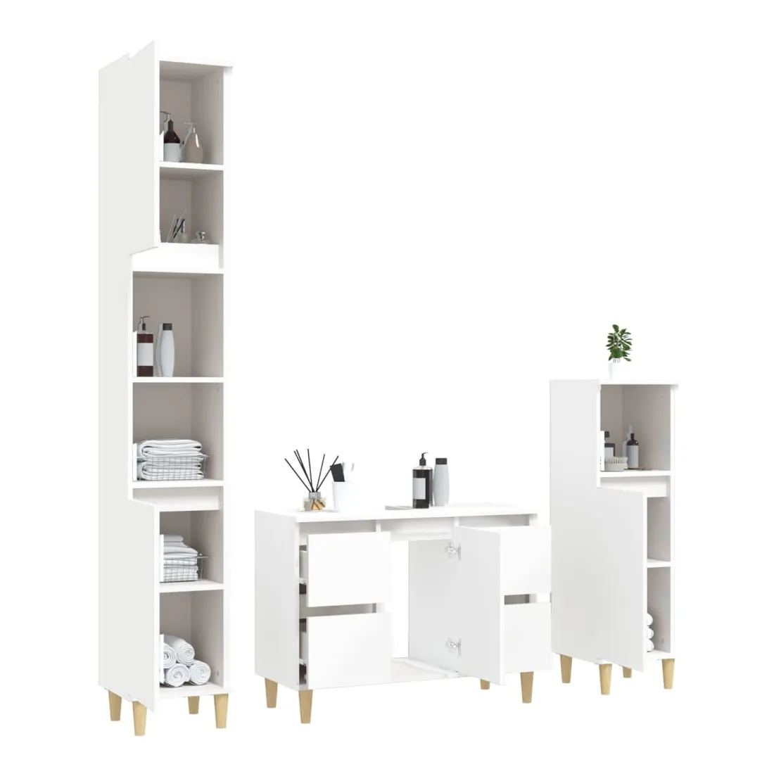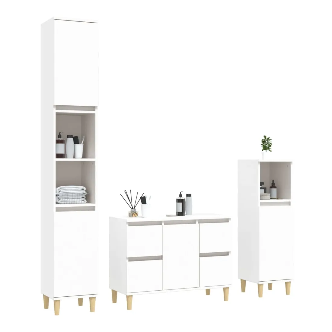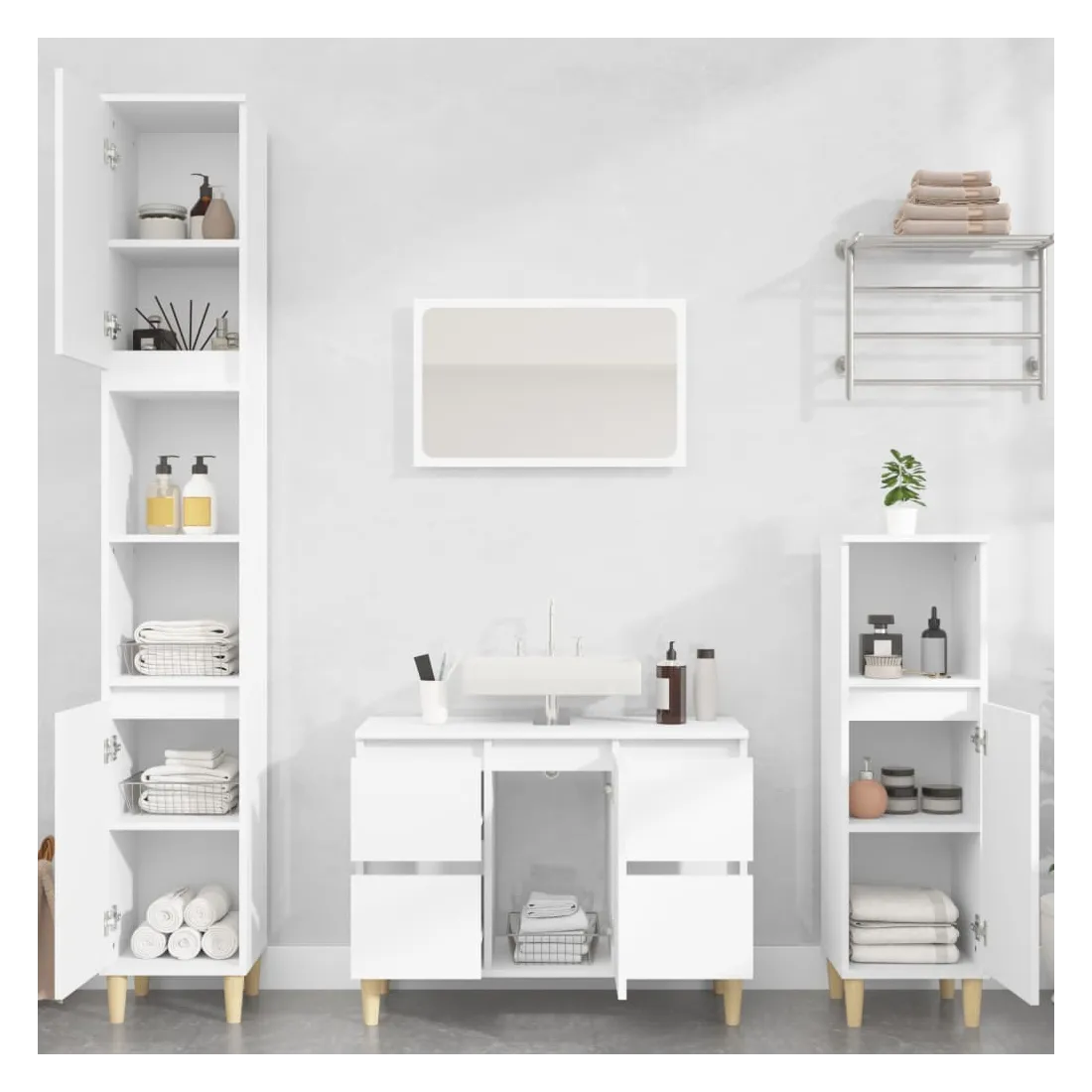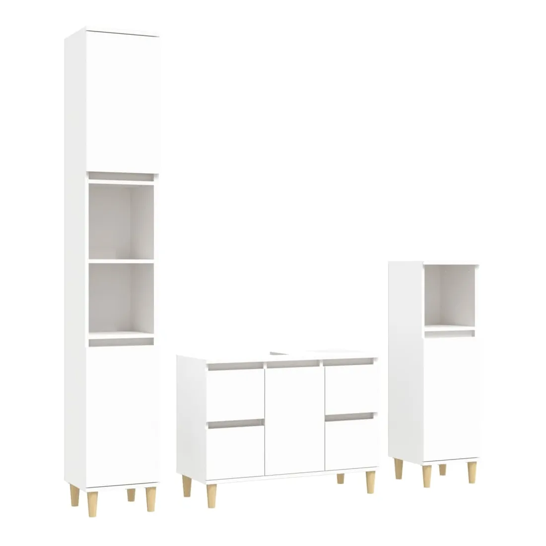 Cet ensemble de meubles de salle de bain, avec un espace de rangement spacieux, est un excellent supplément à votre salle de bain, ce qui lui donne une apparence ordonnée et saisissante ! Matériau durable : le bois d'ingénierie est d'une qualité exceptionnelle avec une surface lisse et présente également résistance, stabilité et résistance à l'humidité.Grand espace de rangement : ces armoires de salle de bain offrent un grand espace de rangement pour garder vos fournitures de salle de bain bien organisées.Pieds en bois : les pieds en bois d'eucalyptus massif donnent au meuble de salle de bain un aspect naturel et agréable tout en assurant la stabilité.Surface facile à nettoyer : l'ensemble de salle de bain est facile à nettoyer avec un chiffon humide.Design élégant : les lignes épurées et le design élégant se fondent parfaitement dans votre salle de bain. Attention :Pour éviter qu'il ne soit renversé, ce produit doit être utilisé avec le dispositif de fixation au mur fourni. Bon à savoir :Les vis et les chevilles pour l'intérieur du mur ne sont pas incluses. Nous vous conseillons de trouver et d'utiliser des vis et des chevilles adaptées spécifiquement à vos murs. Si vous n'êtes pas sûr, vous pouvez consulter un professionnel. Veuillez lire et suivre chaque étape des instructions.