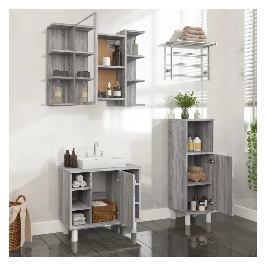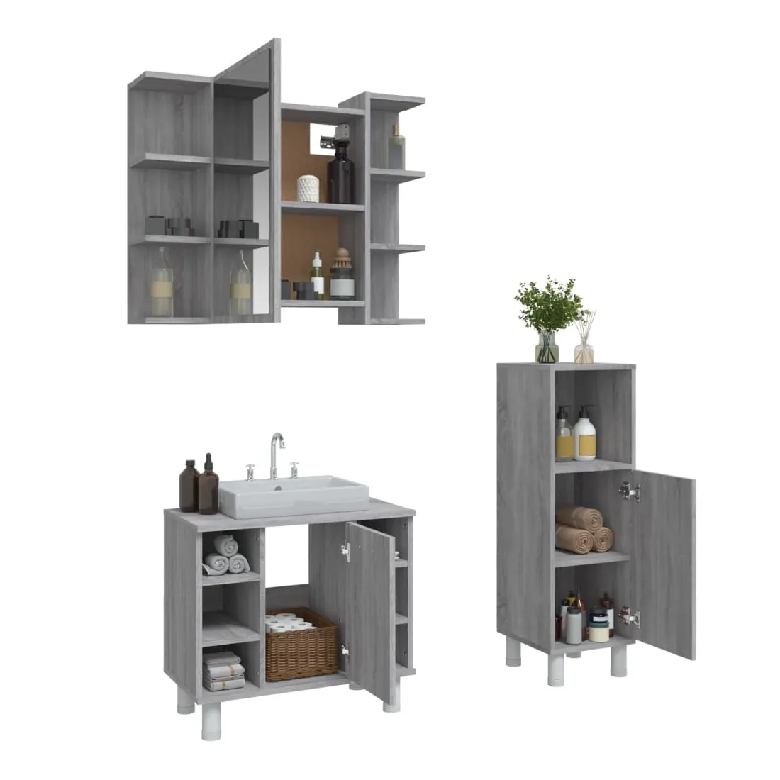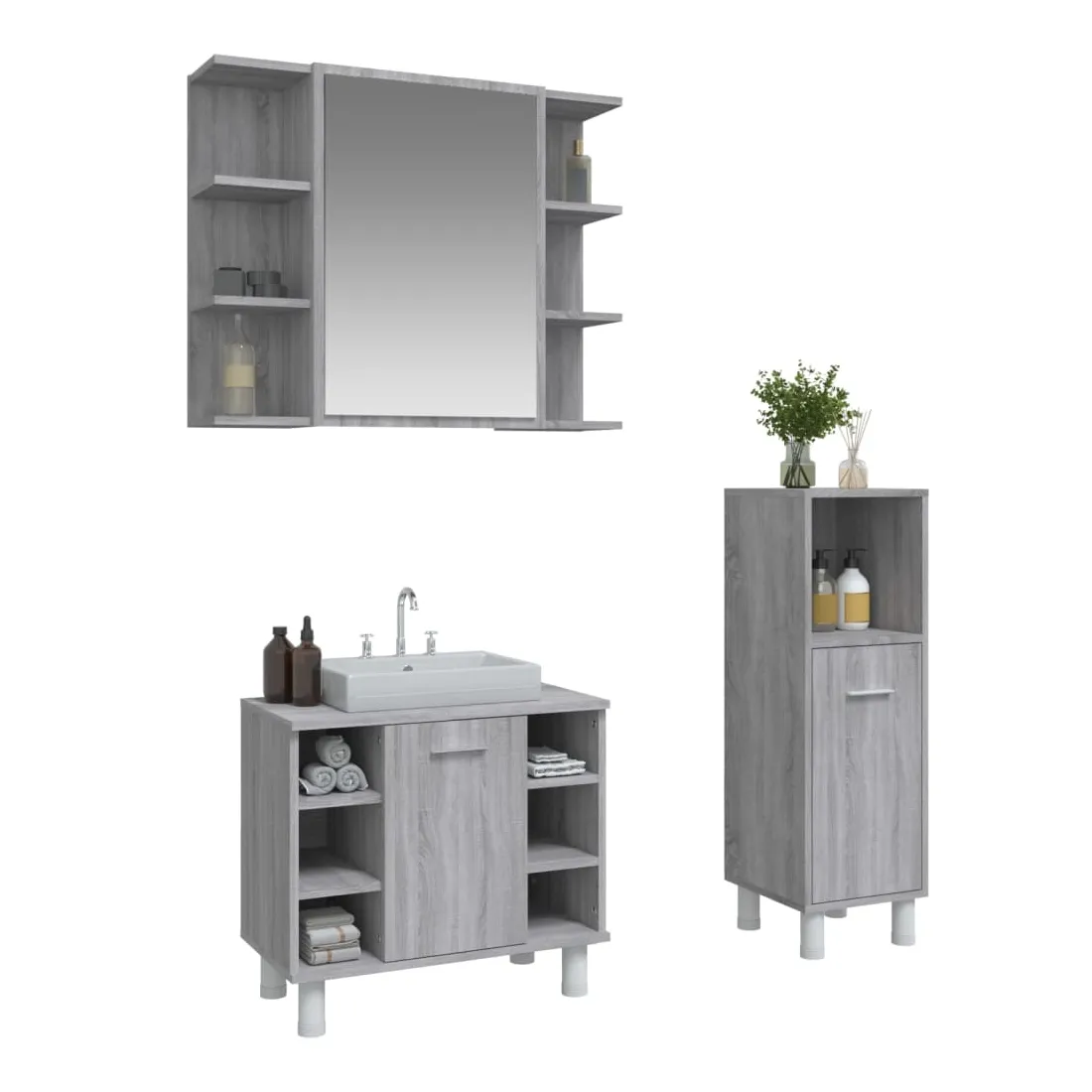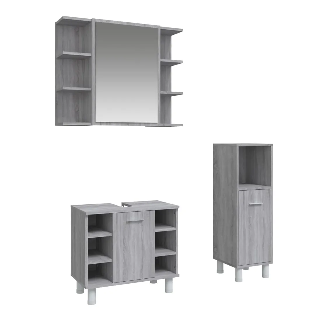 Cet ensemble d'armoires de salle de bain attrayant, avec un grand espace de rangement, présente un design élégant mais pratique. Matériau durable : le bois d'ingénierie est d'une qualité exceptionnelle avec une surface lisse et présente également résistance, stabilité et résistance à l'humidité.Grand espace de rangement : l'espace de rangement facilite l'organisation des articles dans ces meubles de salle de bain. Surface facile à nettoyer : l'ensemble de salle de bain est facile à nettoyer avec un chiffon humide.Design élégant : les lignes épurées et le design élégant se fondent parfaitement dans votre salle de bain. Attention :Pour éviter qu'il ne soit renversé, ce produit doit être utilisé avec le dispositif de fixation au mur fourni. Bon à savoir :Les vis et les chevilles pour l'intérieur du mur ne sont pas incluses. Nous vous conseillons de trouver et d'utiliser des vis et des chevilles adaptées spécifiquement à vos murs. Si vous n'êtes pas sûr, vous pouvez consulter un professionnel. Veuillez lire et suivre chaque étape des instructions. Pour faciliter au maximum le montage, chaque produit est livré avec des instructions.