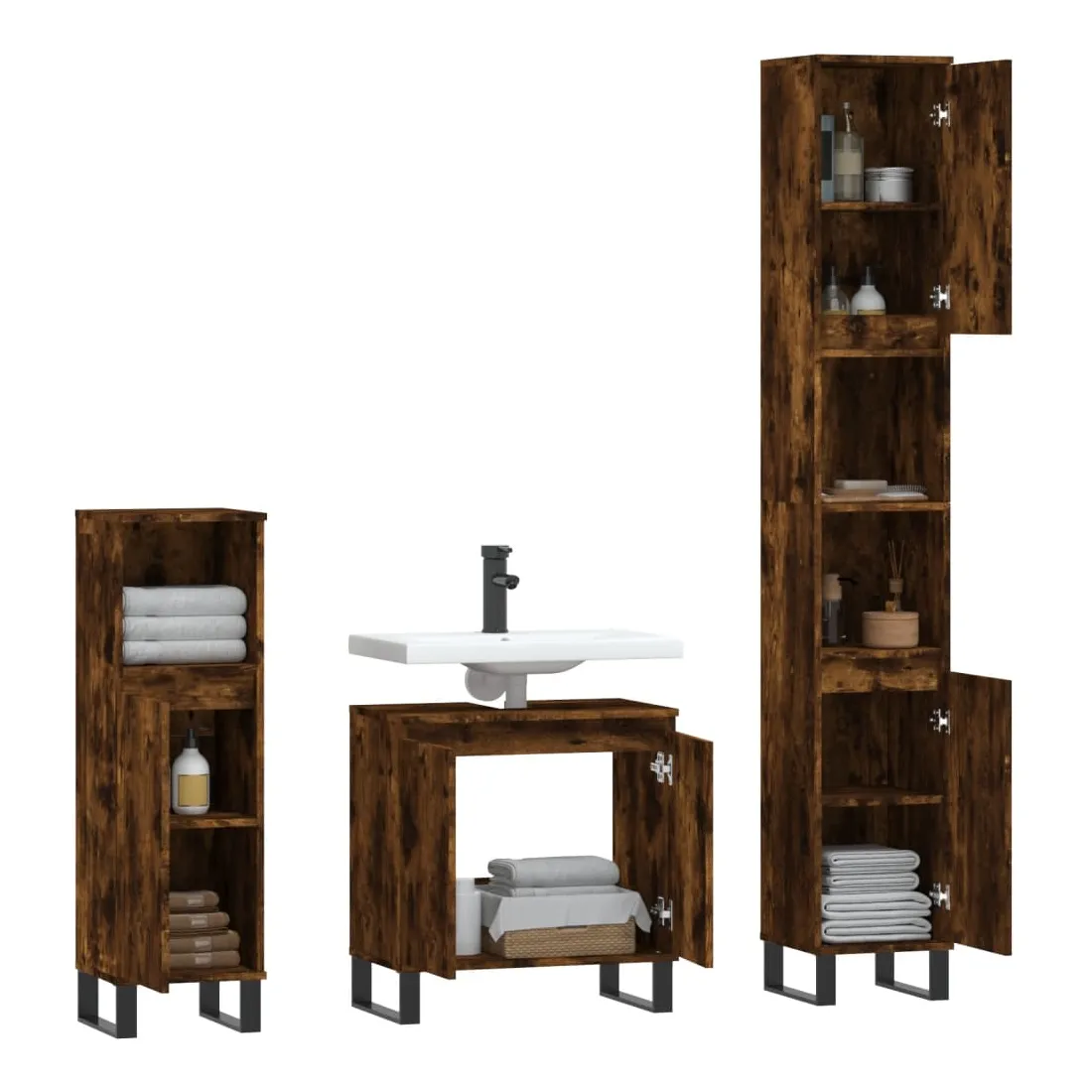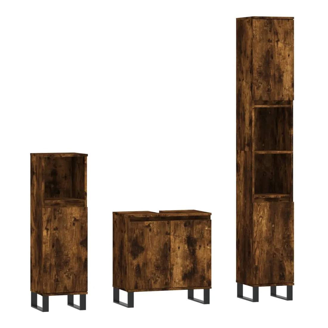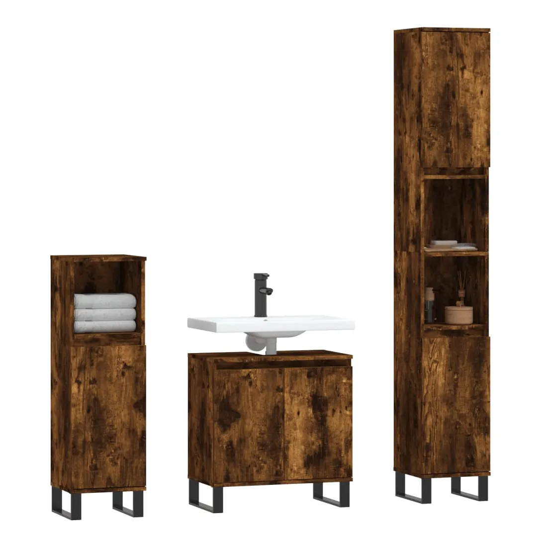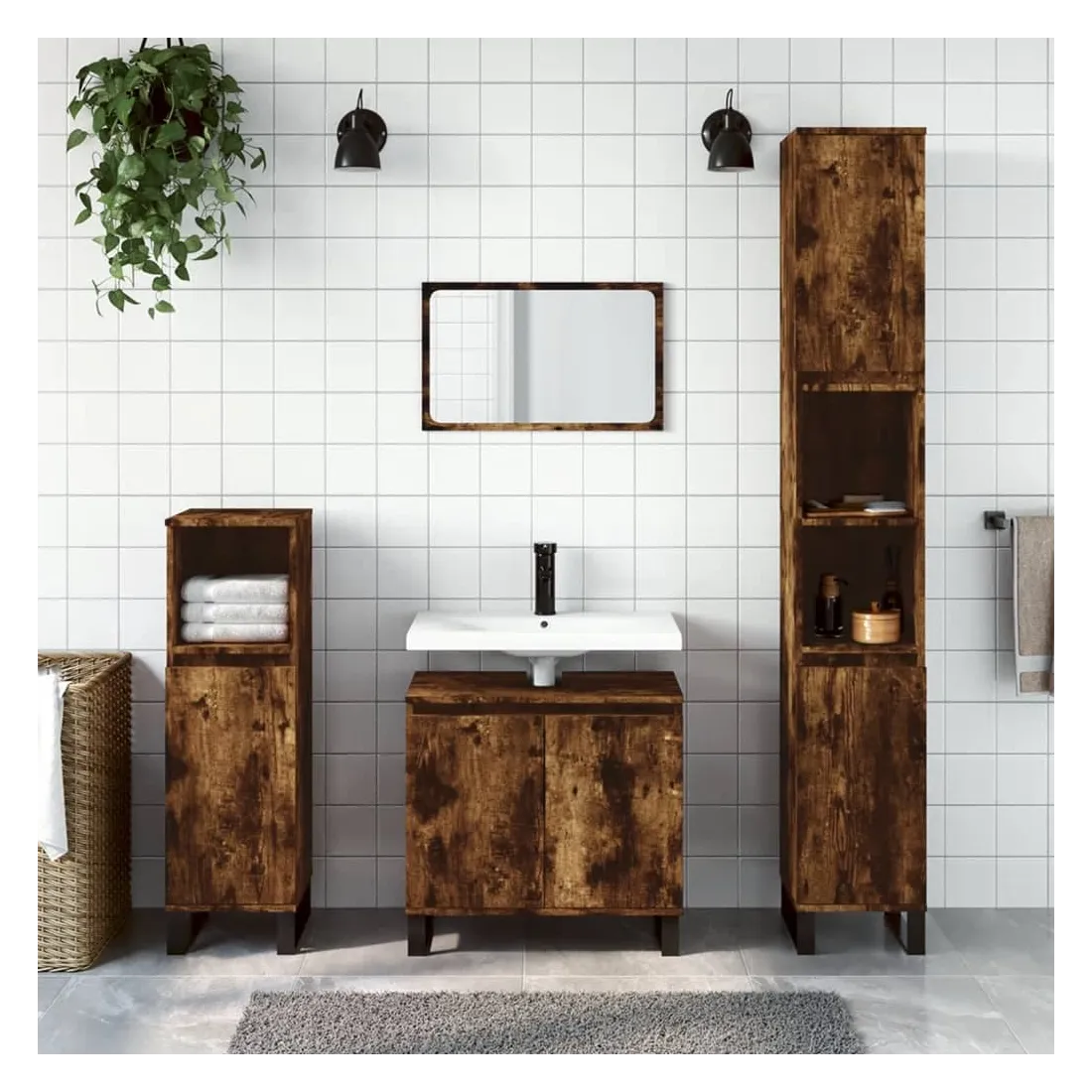 Cet ensemble d'armoires de salle de bain attrayant, avec un grand espace de rangement, présente un design élégant mais pratique. Matériau durable : le bois d'ingénierie est d'une qualité exceptionnelle avec une surface lisse et présente également résistance, stabilité et résistance à l'humidité. Grand espace de rangement : l'espace de rangement facilite l'organisation des articles dans ces meubles de salle de bain. Pieds en métal : les pieds en métal ajoutent un style moderne et calme à votre intérieur tout en assurant la stabilité.Surface facile à nettoyer : l'ensemble de salle de bain est facile à nettoyer avec un chiffon humide. Attention :Pour éviter qu'il ne soit renversé, ce produit doit être utilisé avec le dispositif de fixation au mur fourni. Bon à savoir :Les vis et les chevilles pour l'intérieur du mur ne sont pas incluses. Nous vous conseillons de trouver et d'utiliser des vis et des chevilles adaptées spécifiquement à vos murs. Si vous n'êtes pas sûr, vous pouvez consulter un professionnel. Veuillez lire et suivre chaque étape des instructions.Le lavabo n'est pas inclus dans la livraison.