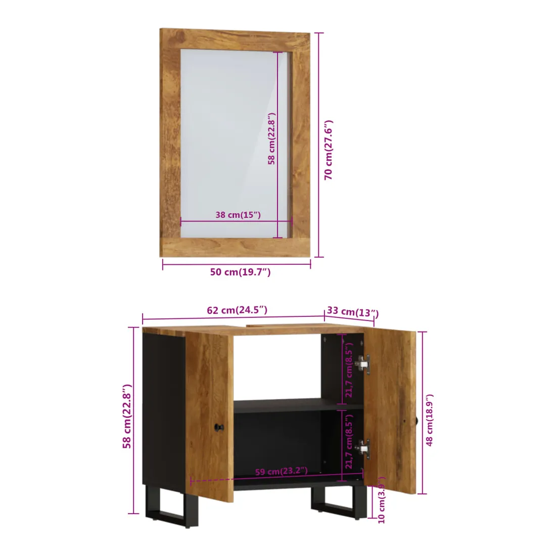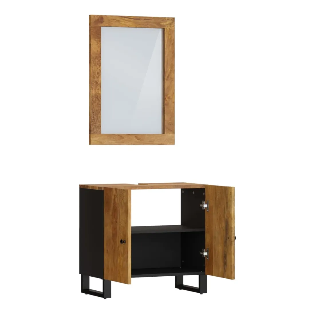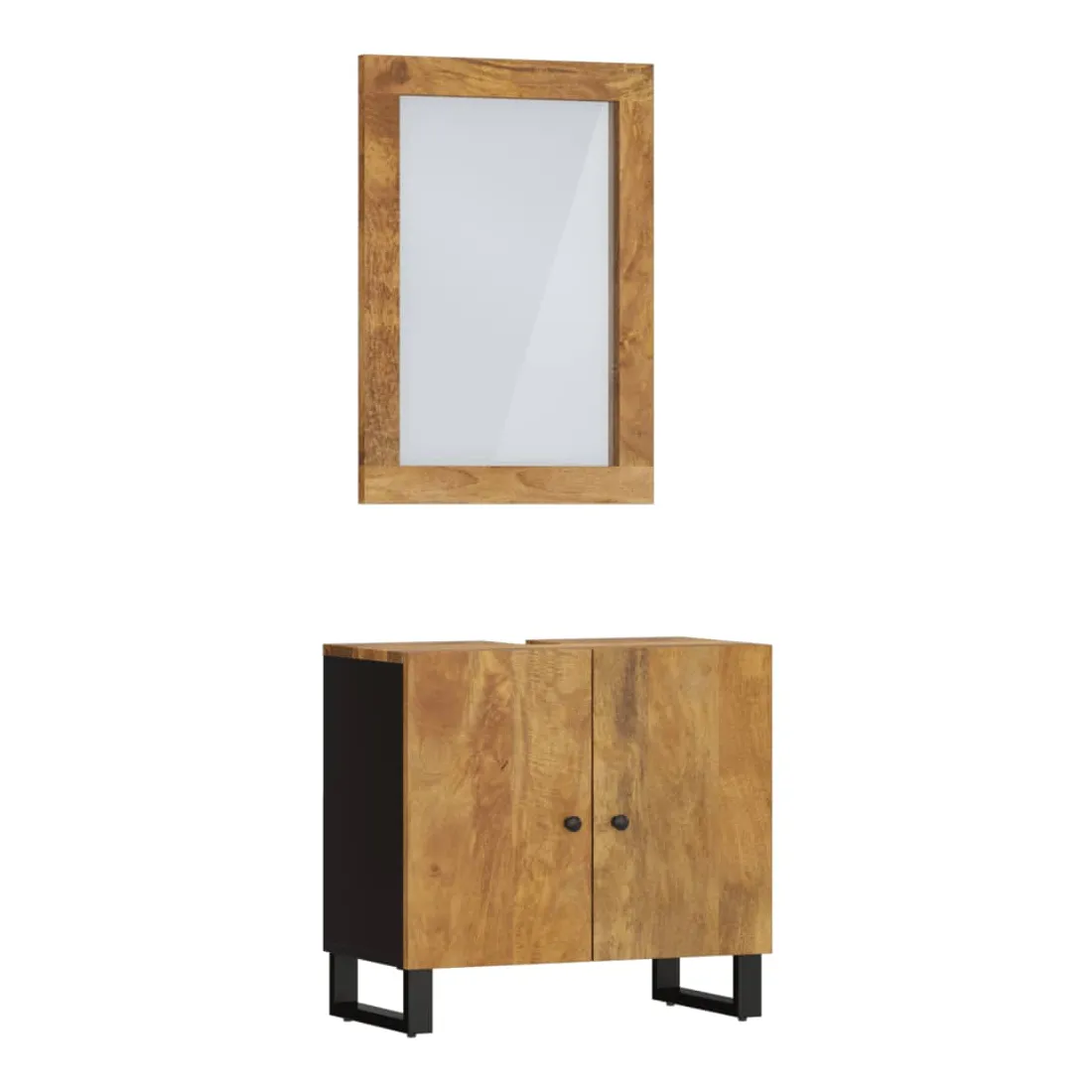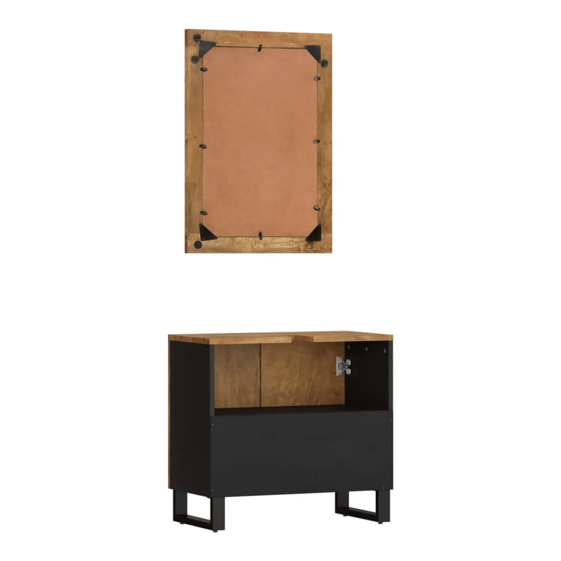 Cet ensemble de meubles de salle de bain pratique est un excellent supplément à votre salle de bain, ce qui lui donne une apparence ordonnée et saisissante ! Bois de manguier massif : l'armoire est fabriquée en bois de manguier massif combinée au bois d'ingénierie. Le bois de manguier massif est un bois dur tropical solide qui fait des meubles robustes. Ses beaux grains de bois rendent chaque meuble légèrement différent l'un de l'autre.Grand espace de rangement : le meuble de rangement de salle de bain dispose d'un tiroir, offrant un grand espace de rangement pour ranger des articles dans votre salle de bain.Pieds stables : les pieds en fer de l'armoire de salle de bain assurent sa robustesse et stabilité.Design pratique : le dessus du meuble-lavabo de salle de bain est idéal pour placer le lavabo.Image claire : la face du miroir en verre offre une image claire. Ainsi, vous pouvez profiter d'un reflet magnifique et naturel lorsque vous vous tenez devant. Attention :Pour éviter qu'il ne soit renversé, ce produit doit être utilisé avec le dispositif de fixation au mur fourni.Bon à savoir :Le lavabo n'est pas inclus dans la livraison.Les vis et les chevilles pour l'intérieur du mur ne sont pas incluses. Nous vous conseillons de trouver et d'utiliser des vis et des chevilles adaptées spécifiquement à vos murs. Si vous n'êtes pas sûr, vous pouvez consulter un professionnel. Veuillez lire et suivre chaque étape des instructions.Chaque article est unique, avec des variations de couleurs et de grains. La livraison est aléatoire, ce qui garantit l'exclusivité et l'individualité de votre produit.
