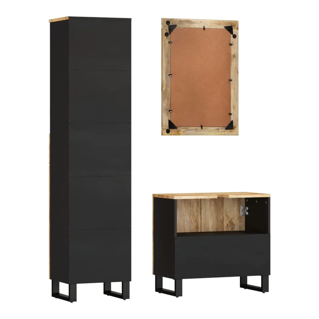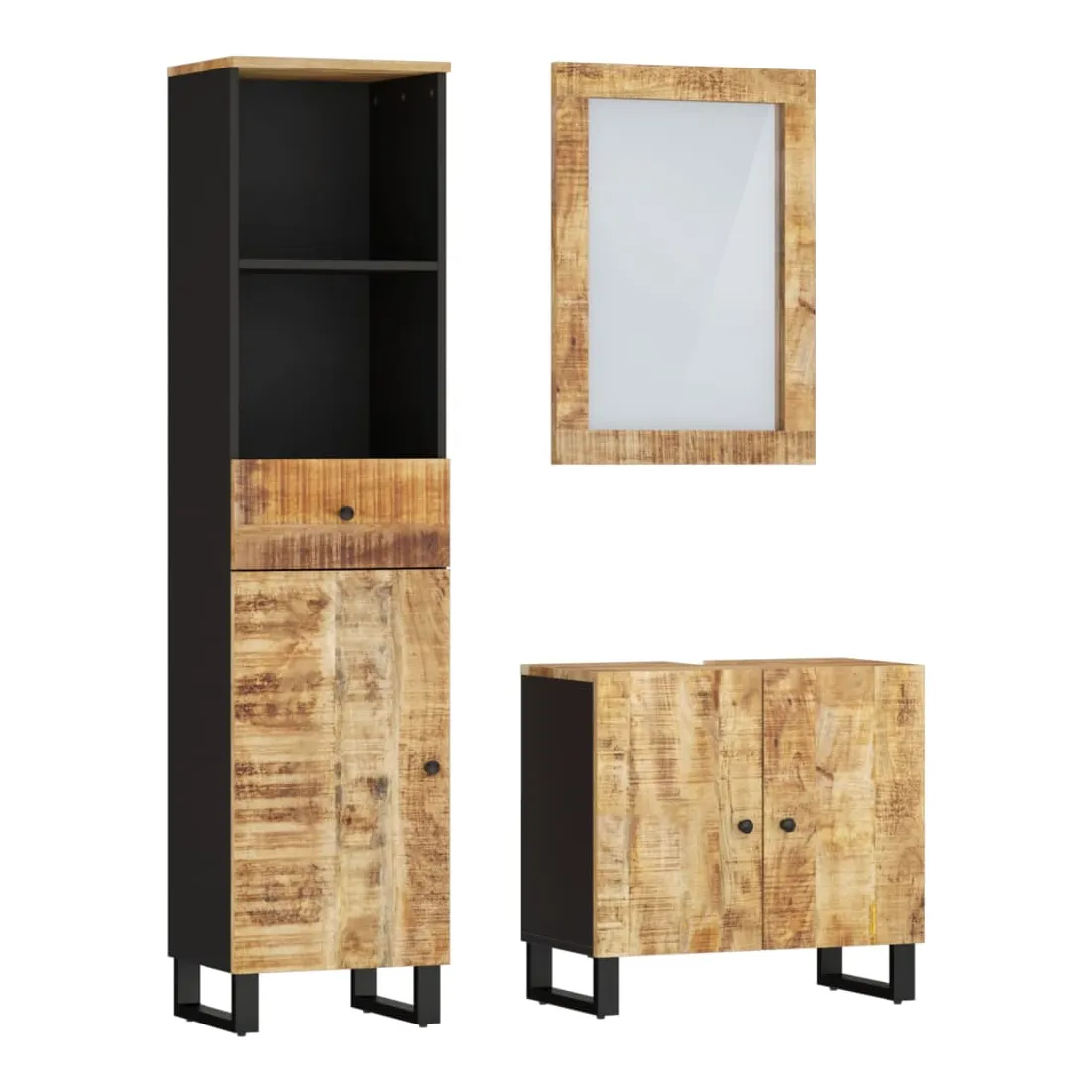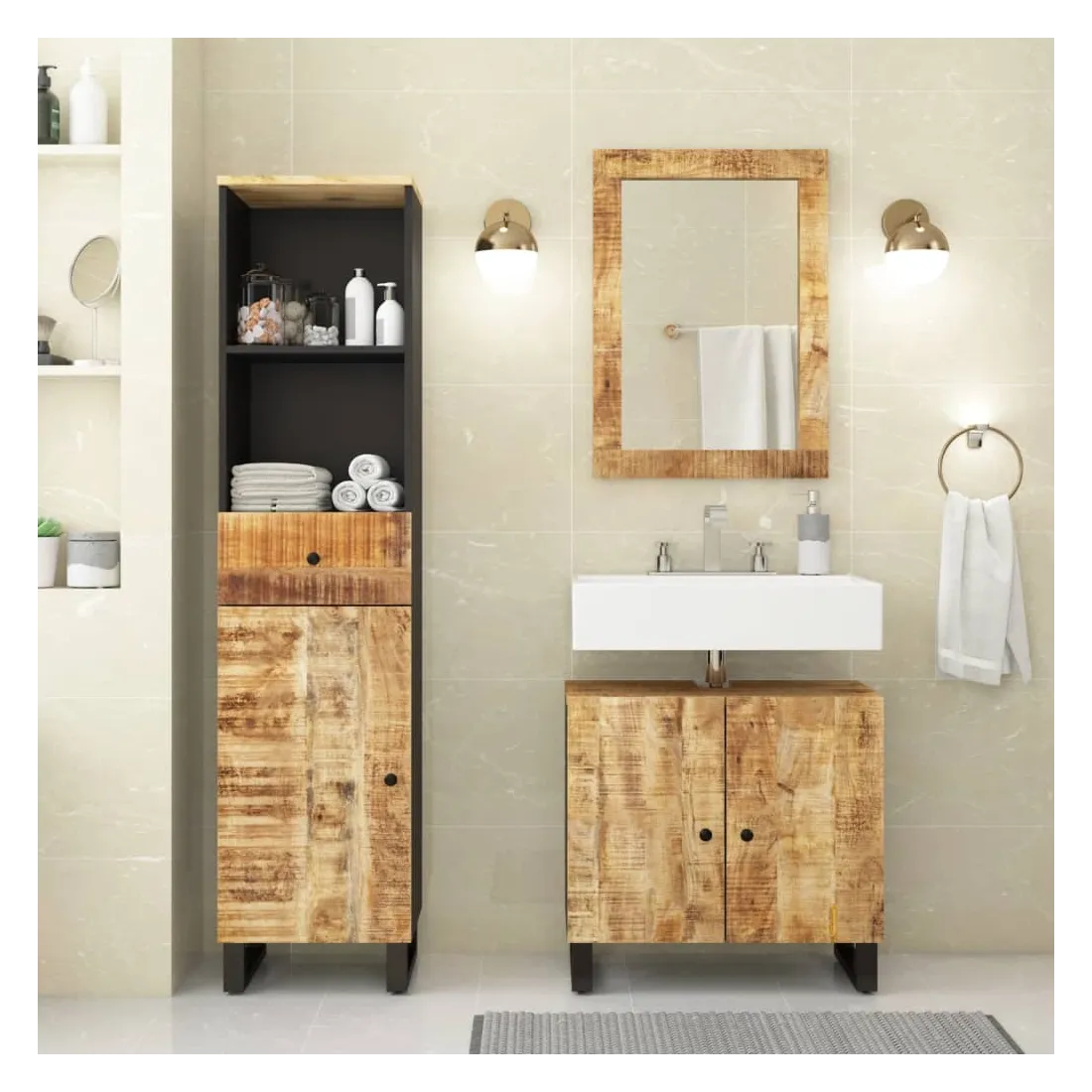 Cet ensemble de meubles de salle de bain pratique, avec un espace de rangement spacieux, est un excellent supplément à votre salle de bain, ce qui lui donne une apparence ordonnée et saisissante ! Bois de manguier massif : l'armoire est fabriquée en bois de manguier massif combinée au bois d'ingénierie. Le bois de manguier massif est un bois dur tropical solide qui fait des meubles robustes. Ses beaux grains de bois rendent chaque meuble légèrement différent l'un de l'autre.Grand espace de rangement : le meuble de rangement de salle de bain offre diverses options de rangement et un espace spacieux pour ranger des articles dans votre salle de bain.Pieds stables : les pieds en fer de l'armoire de salle de bain assurent sa robustesse et stabilité.Design pratique : le dessus du meuble-lavabo de salle de bain est idéal pour placer le lavabo.Image claire : la face du miroir en verre offre une image claire. Ainsi, vous pouvez profiter d'un reflet magnifique et naturel lorsque vous vous tenez devant. Attention :Pour éviter qu'il ne soit renversé, ce produit doit être utilisé avec le dispositif de fixation au mur fourni.Bon à savoir :Le lavabo n'est pas inclus dans la livraison.Les vis et les chevilles pour l'intérieur du mur ne sont pas incluses. Nous vous conseillons de trouver et d'utiliser des vis et des chevilles adaptées spécifiquement à vos murs. Si vous n'êtes pas sûr, vous pouvez consulter un professionnel. Veuillez lire et suivre chaque étape des instructions.Chaque article est unique, avec des variations de couleurs et de grains. La livraison est aléatoire, ce qui garantit l'exclusivité et l'individualité de votre produit.