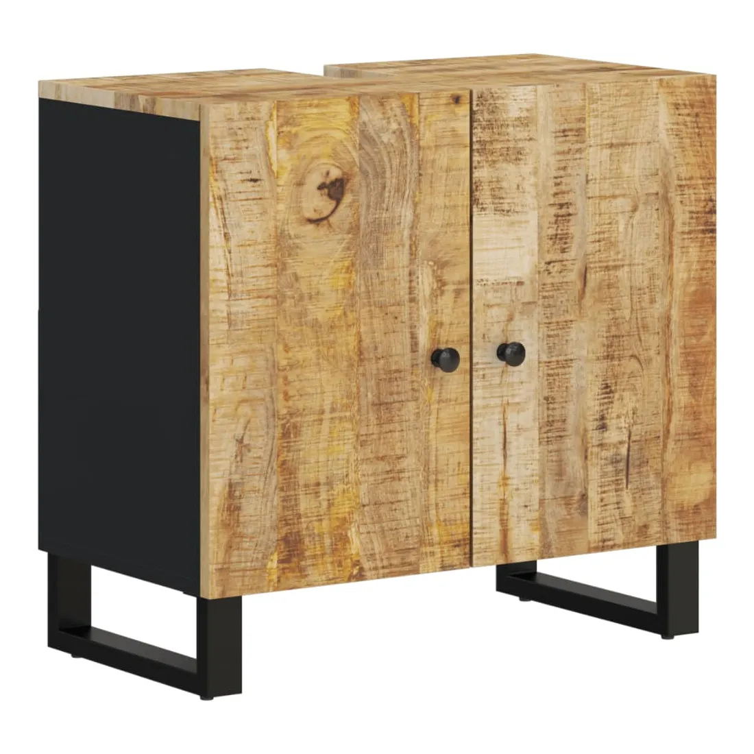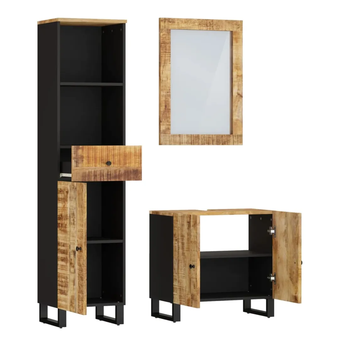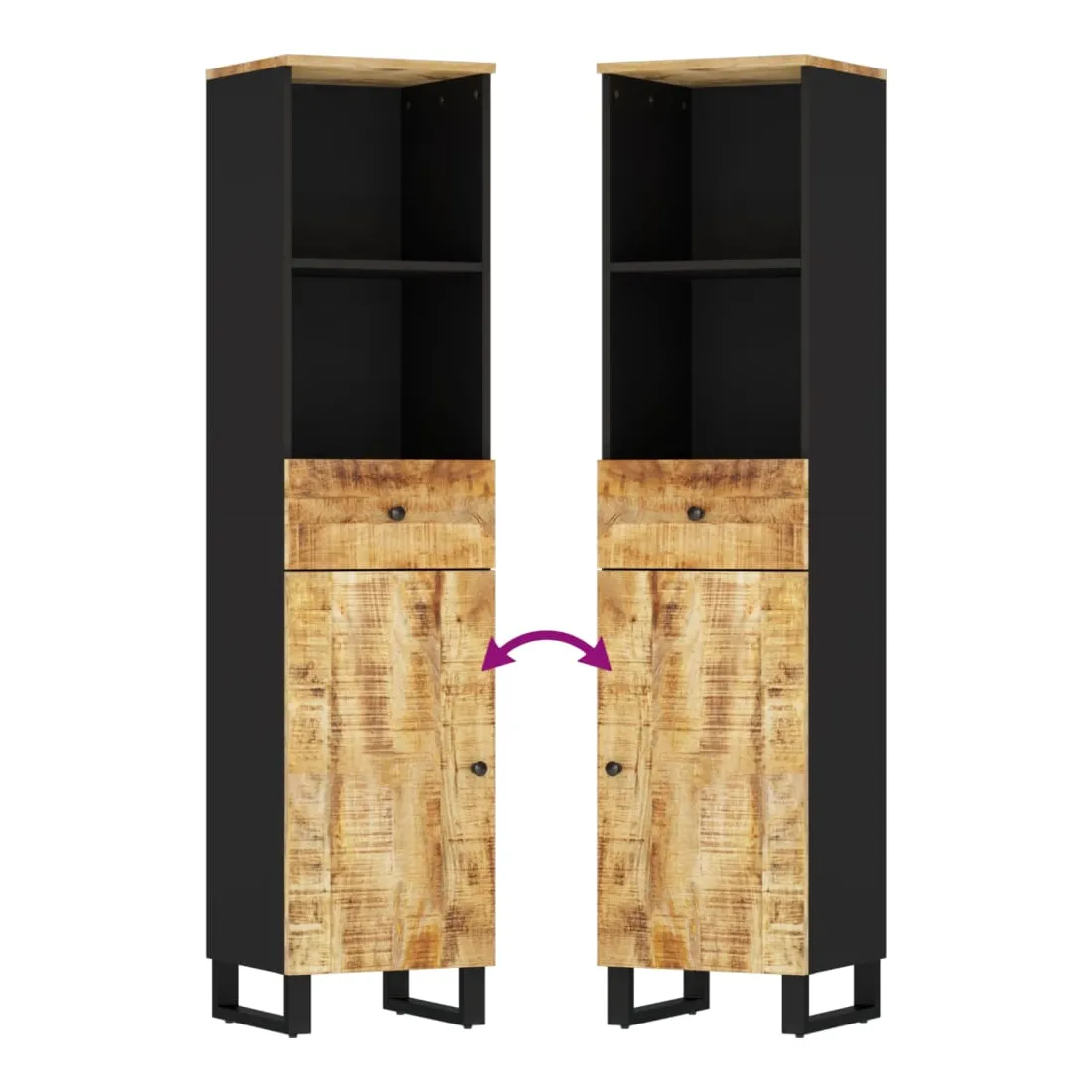 Cet ensemble de meubles de salle de bain pratique, avec un espace de rangement spacieux, est un excellent supplément à votre salle de bain, ce qui lui donne une apparence ordonnée et saisissante ! Bois de manguier massif : l'armoire est fabriquée en bois de manguier massif combinée au bois d'ingénierie. Le bois de manguier massif est un bois dur tropical solide qui fait des meubles robustes. Ses beaux grains de bois rendent chaque meuble légèrement différent l'un de l'autre.Grand espace de rangement : le meuble de rangement de salle de bain offre diverses options de rangement et un espace spacieux pour ranger des articles dans votre salle de bain.Pieds stables : les pieds en fer de l'armoire de salle de bain assurent sa robustesse et stabilité.Design pratique : le dessus du meuble-lavabo de salle de bain est idéal pour placer le lavabo.Image claire : la face du miroir en verre offre une image claire. Ainsi, vous pouvez profiter d'un reflet magnifique et naturel lorsque vous vous tenez devant. Attention :Pour éviter qu'il ne soit renversé, ce produit doit être utilisé avec le dispositif de fixation au mur fourni.Bon à savoir :Le lavabo n'est pas inclus dans la livraison.Les vis et les chevilles pour l'intérieur du mur ne sont pas incluses. Nous vous conseillons de trouver et d'utiliser des vis et des chevilles adaptées spécifiquement à vos murs. Si vous n'êtes pas sûr, vous pouvez consulter un professionnel. Veuillez lire et suivre chaque étape des instructions.Chaque article est unique, avec des variations de couleurs et de grains. La livraison est aléatoire, ce qui garantit l'exclusivité et l'individualité de votre produit.
