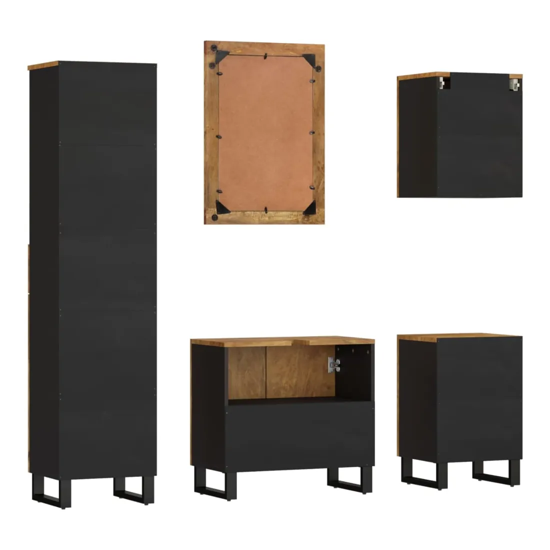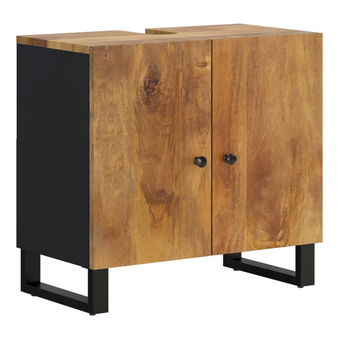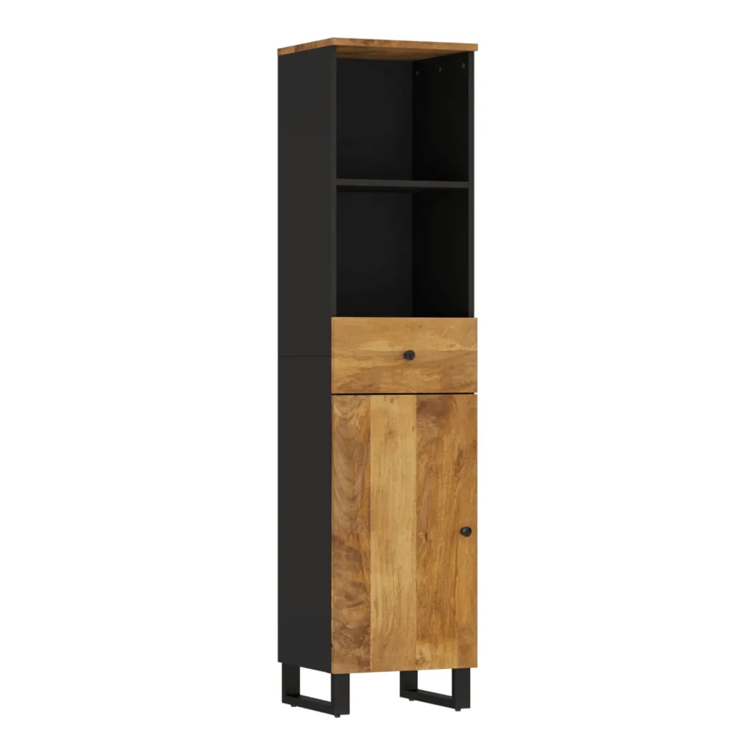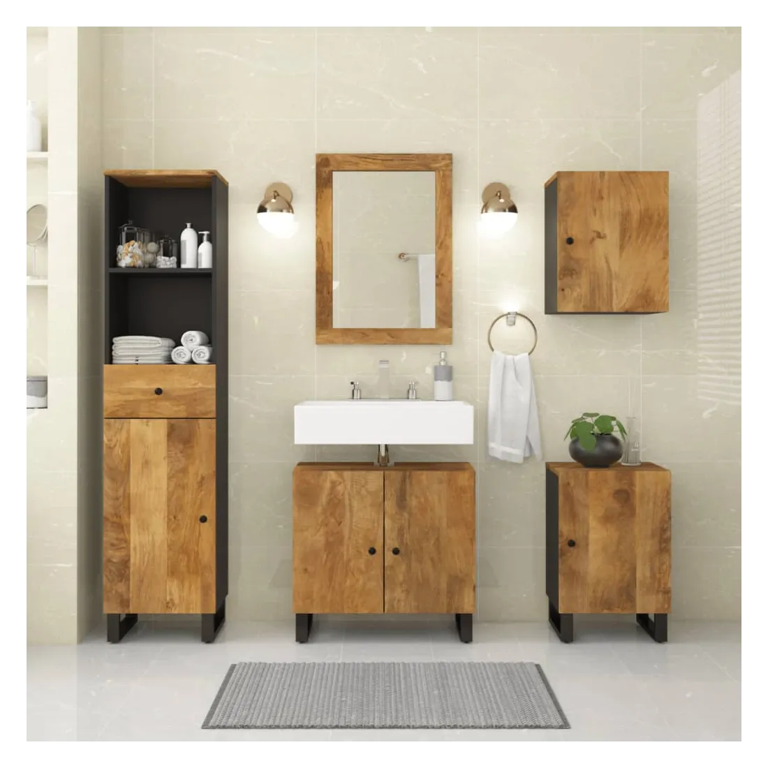 Cet ensemble de meubles de salle de bain pratique, avec un espace de rangement spacieux, est un excellent supplément à votre salle de bain, ce qui lui donne une apparence ordonnée et saisissante ! Bois de manguier massif : l'armoire est fabriquée en bois de manguier massif combinée au bois d'ingénierie. Le bois de manguier massif est un bois dur tropical solide qui fait des meubles robustes. Ses beaux grains de bois rendent chaque meuble légèrement différent l'un de l'autre.Grand espace de rangement : le meuble de rangement de salle de bain offre diverses options de rangement et un espace spacieux pour ranger des articles dans votre salle de bain.Fonction murale : l'armoire murale de salle de bain et le miroir de courtoisie peuvent être fixés au mur. De cette façon, vous pouvez maximiser votre espace au sol et garder la zone propre.Pieds stables : les pieds en fer de l'armoire de salle de bain assurent sa robustesse et stabilité.Design pratique : le dessus du meuble-lavabo de salle de bain est idéal pour placer le lavabo.Image claire : la face du miroir en verre offre une image claire. Ainsi, vous pouvez profiter d'un reflet magnifique et naturel lorsque vous vous tenez devant. Attention :Pour éviter qu'il ne soit renversé, ce produit doit être utilisé avec le dispositif de fixation au mur fourni.Bon à savoir :Le lavabo n'est pas inclus dans la livraison.Les vis et les chevilles pour l'intérieur du mur ne sont pas incluses. Nous vous conseillons de trouver et d'utiliser des vis et des chevilles adaptées spécifiquement à vos murs. Si vous n'êtes pas sûr, vous pouvez consulter un professionnel. Veuillez lire et suivre chaque étape des instructions.Chaque article est unique, avec des variations de couleurs et de grains. La livraison est aléatoire, ce qui garantit l'exclusivité et l'individualité de votre produit.