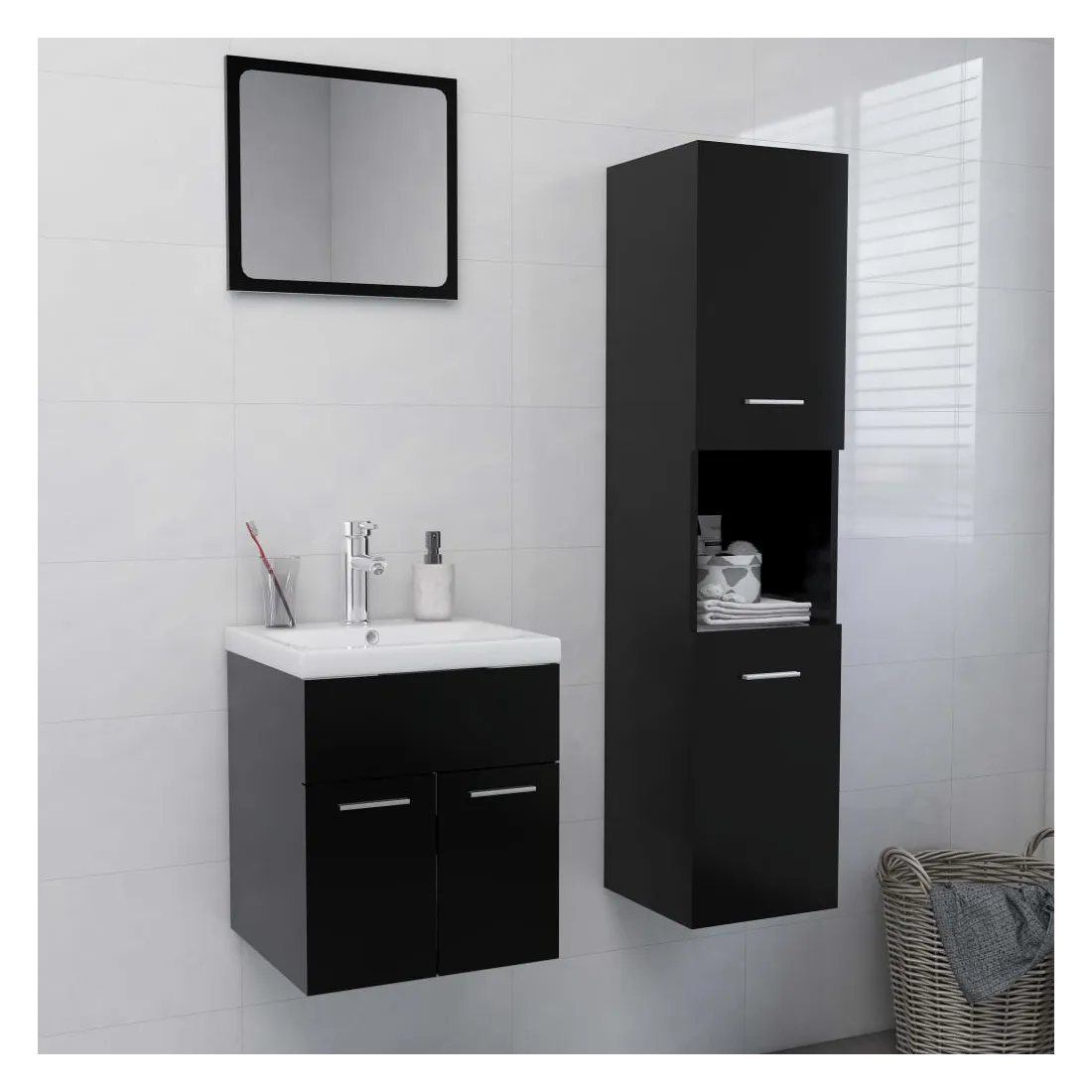 vidaXLAvec cet élégant ensemble de meubles de salle de bain, vous pouvez créer un espace de rangement supplémentaire pour votre salle de bain avec un aspect remarquable et bien rangé. Les lignes épurées et le design élégant s'intègrent parfaitement à votre salle de bain. L'ensemble de meubles comprend une armoire de lavabo avec lavabo, une armoire haute et un miroir. L’armoire de lavabo chic a 1 compartiment et s’adapte parfaitement sous votre évier, ce qui rend le rangement de votre salle de bain très pratique. Fabriqué en céramique, le lavabo peut non seulement servir de récipient pour une utilisation quotidienne, mais aussi une parure dans votre espace de vie. Grâce à son design tendance et contemporain, ce lavabo conviendra à tout décor. Un trop-plein est également équipé pour vidanger l’eau lorsqu'il est trop plein. L'armoire haute comporte un total de 5 compartiments et 2 portes, offrant ainsi un espace suffisant pour ranger les objets de votre salle de bain. Le miroir ajoute également une excellente apparence à votre décoration intérieure. De plus, cet ensemble de salle de bains est facile à nettoyer avec un chiffon humide. Veuillez noter que le robinet et le drain ne sont pas inclus dans la livraison.