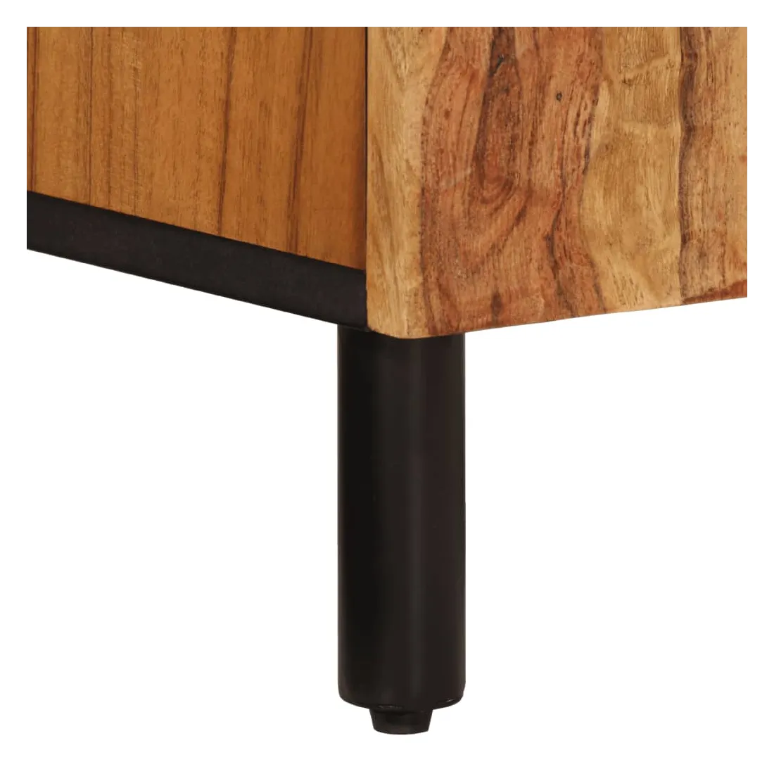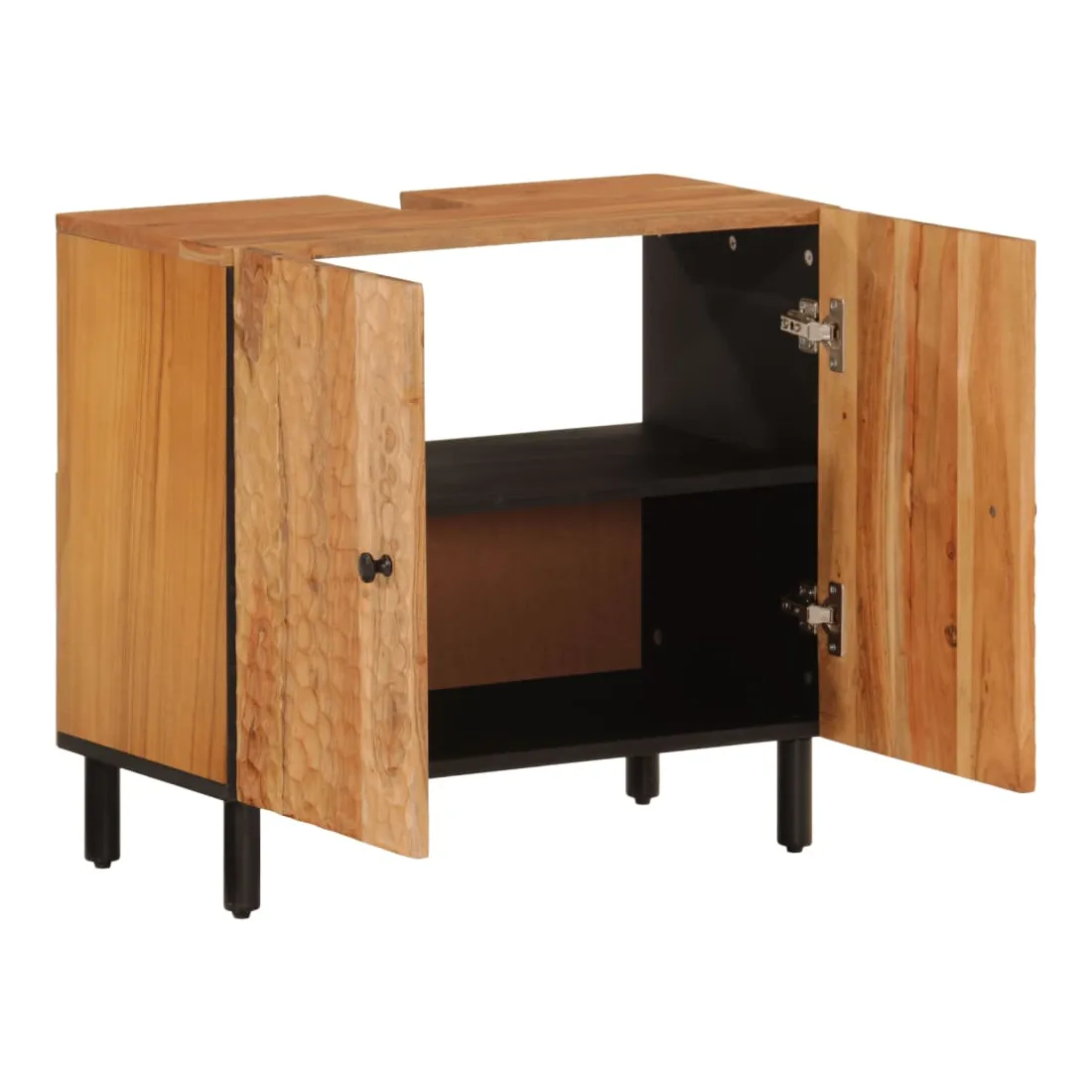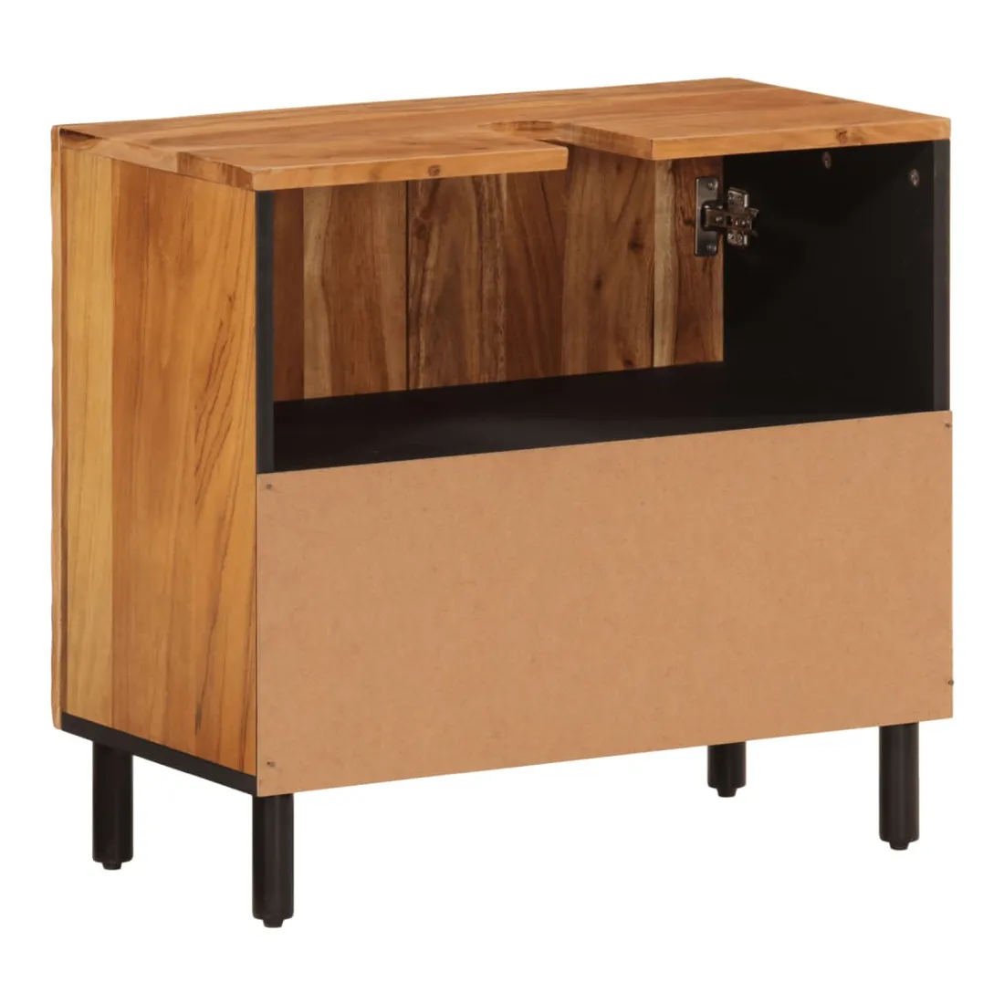 Cet ensemble d'armoires de salle de bain attrayant, avec un grand espace de rangement, présente un design élégant mais pratique. Bois d'acacia massif : le bois d'acacia massif est un matériau naturel magnifique. Le bois d'acacia un bois dur tropical, qui est dense, robuste et durable.Grand espace de rangement : ce meuble de salle de bain offre suffisamment d'espace de rangement pour garder vos essentiels bien organisés et à portée de main.Pieds robustes : les pieds en fer ajoutent de la robustesse et de la stabilité au meuble de salle de bain. Bon à savoir :Les vis et les chevilles pour l'intérieur du mur ne sont pas incluses. Nous vous conseillons de trouver et d'utiliser des vis et des chevilles adaptées spécifiquement à vos murs. Si vous n'êtes pas sûr, vous pouvez consulter un professionnel. Veuillez lire et suivre chaque étape des instructions. Attention :Pour éviter qu'il ne bascule, ce produit doit être utilisé avec le dispositif de fixation murale fourni.