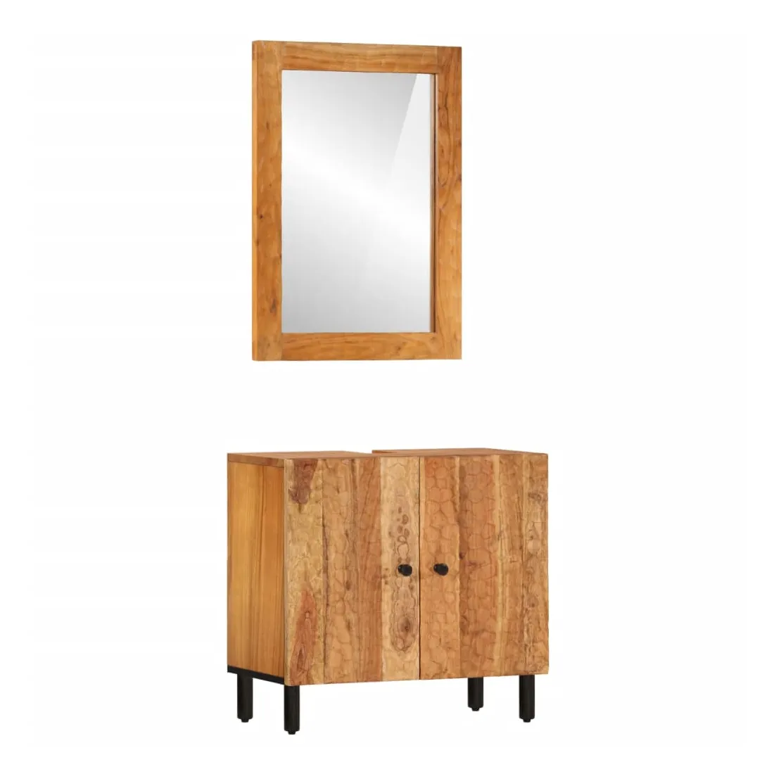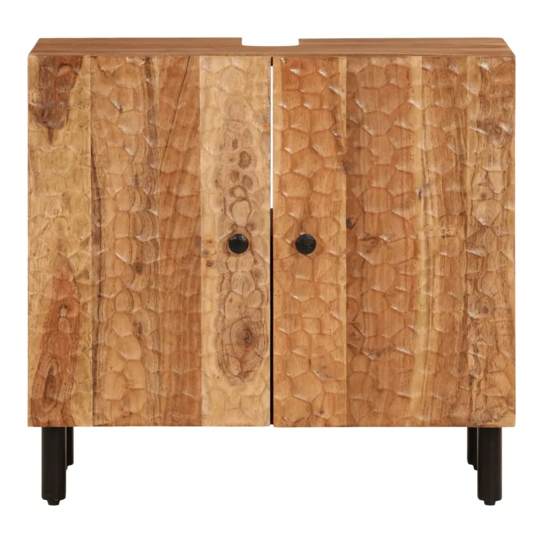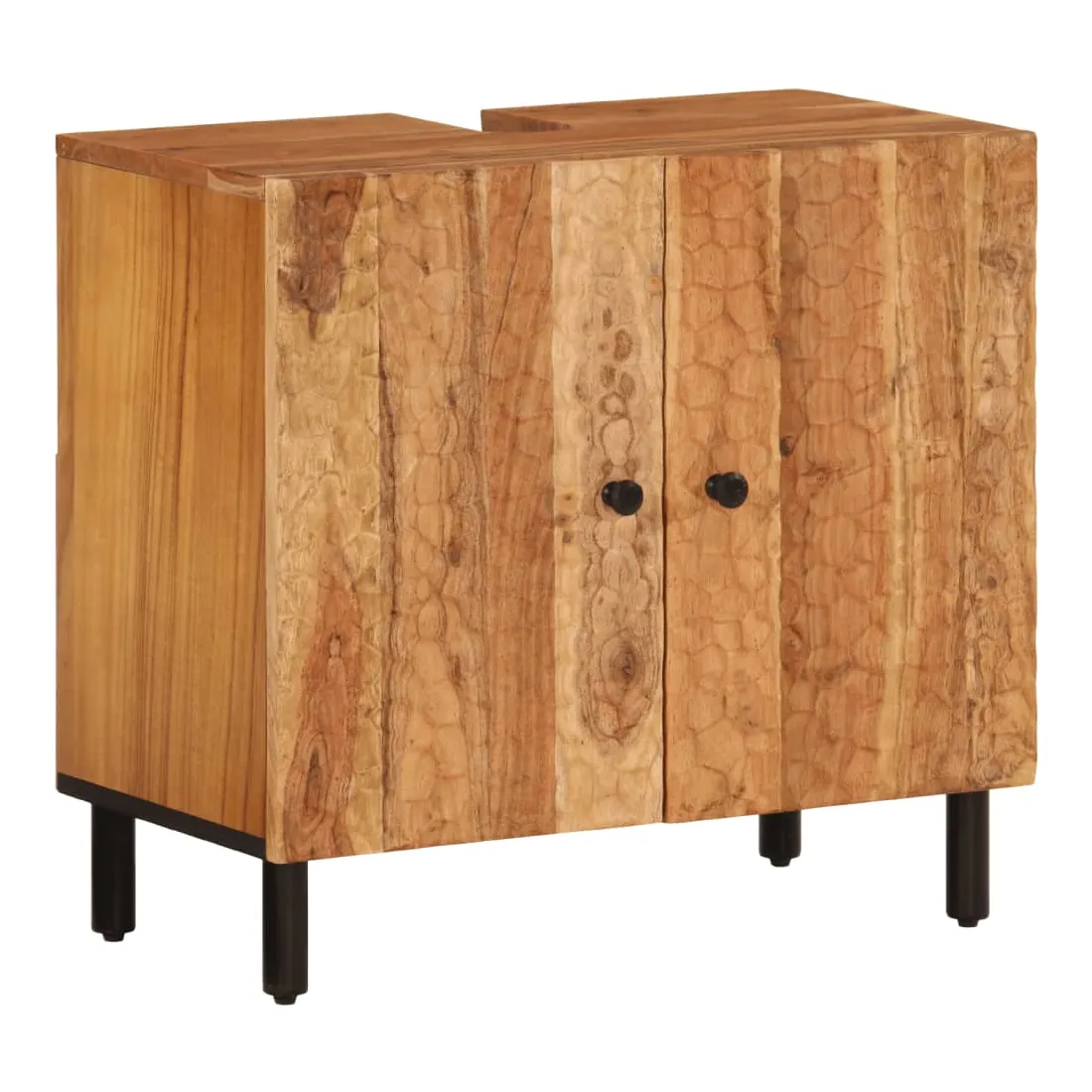 Cet ensemble d'armoires de salle de bain attrayant, avec un grand espace de rangement, présente un design élégant mais pratique. Bois d'acacia massif : le bois d'acacia massif est un matériau naturel magnifique. Le bois d'acacia un bois dur tropical, qui est dense, robuste et durable.Grand espace de rangement : ce meuble de salle de bain offre suffisamment d'espace de rangement pour garder vos essentiels bien organisés et à portée de main.Pieds robustes : les pieds en fer ajoutent de la robustesse et de la stabilité au meuble de salle de bain. Bon à savoir :Les vis et les chevilles pour l'intérieur du mur ne sont pas incluses. Nous vous conseillons de trouver et d'utiliser des vis et des chevilles adaptées spécifiquement à vos murs. Si vous n'êtes pas sûr, vous pouvez consulter un professionnel. Veuillez lire et suivre chaque étape des instructions. Attention :Pour éviter qu'il ne bascule, ce produit doit être utilisé avec le dispositif de fixation murale fourni.