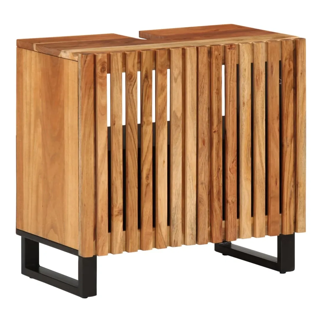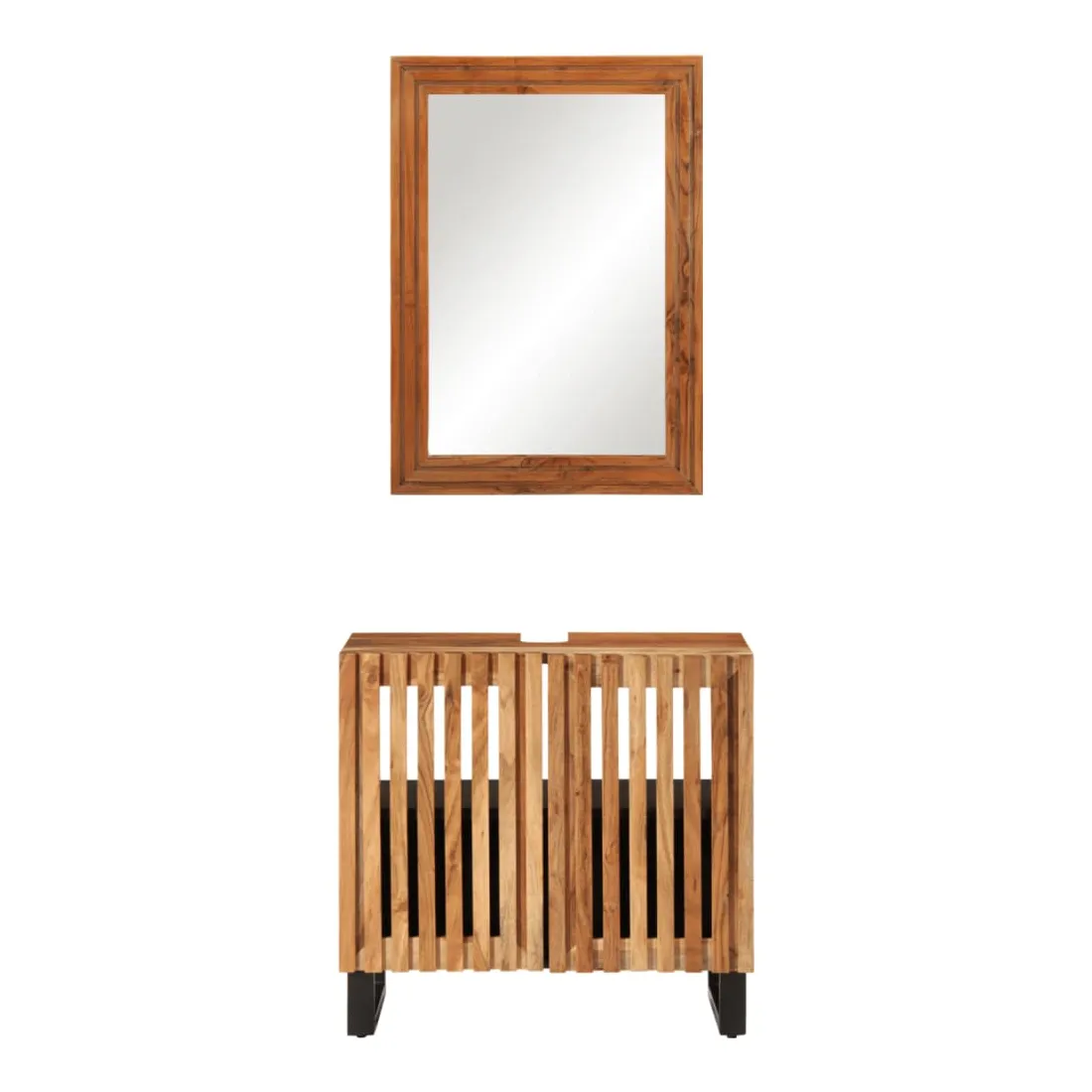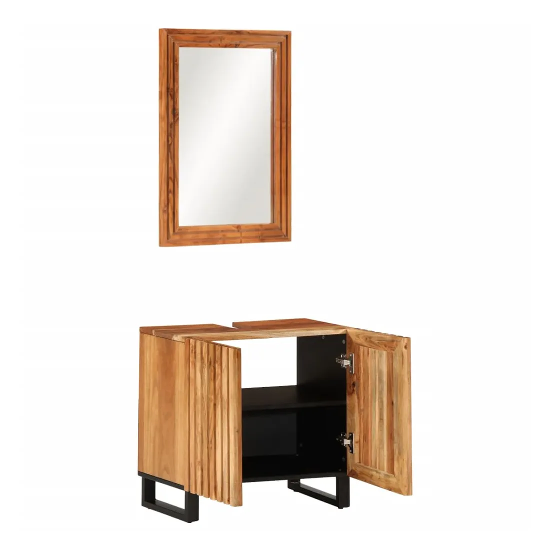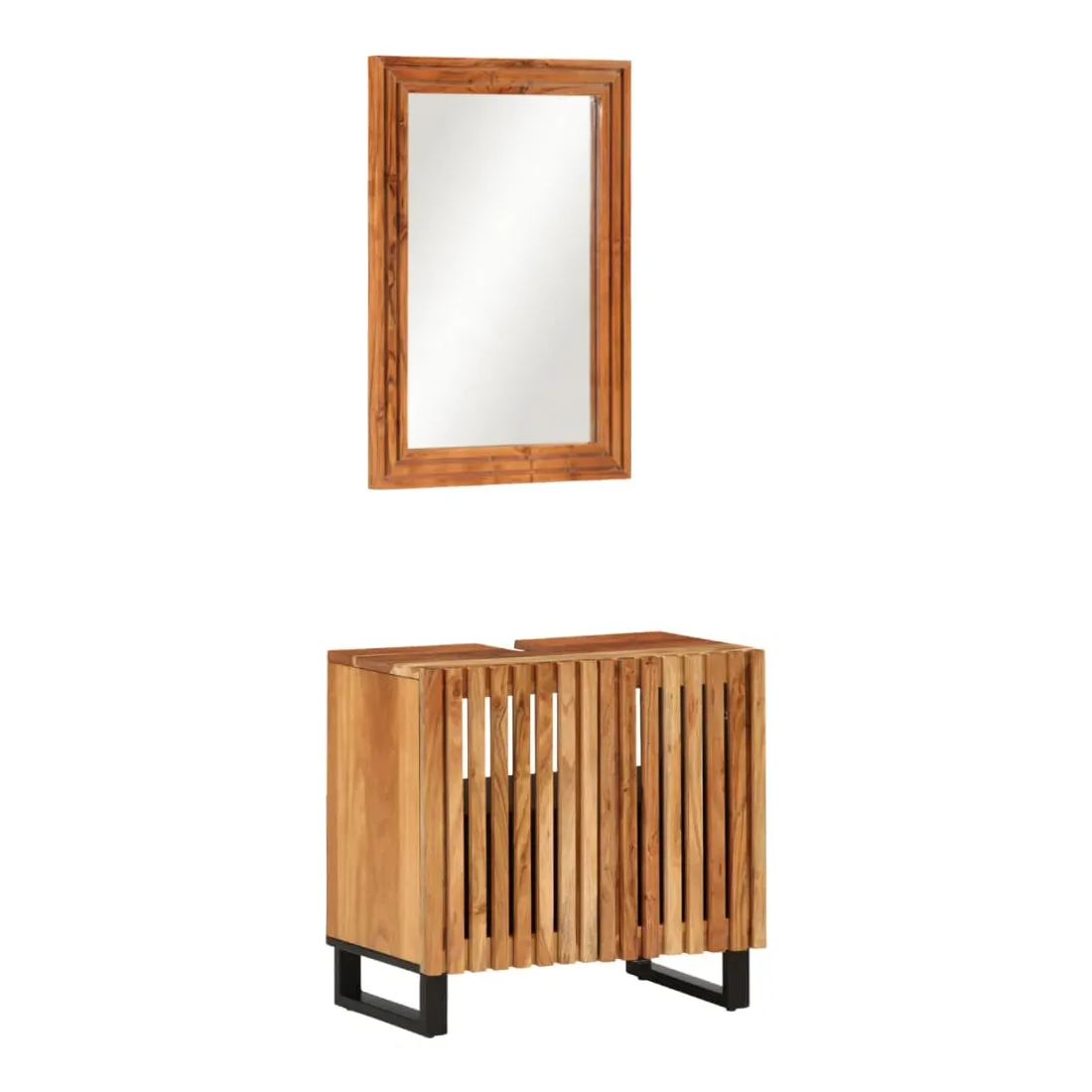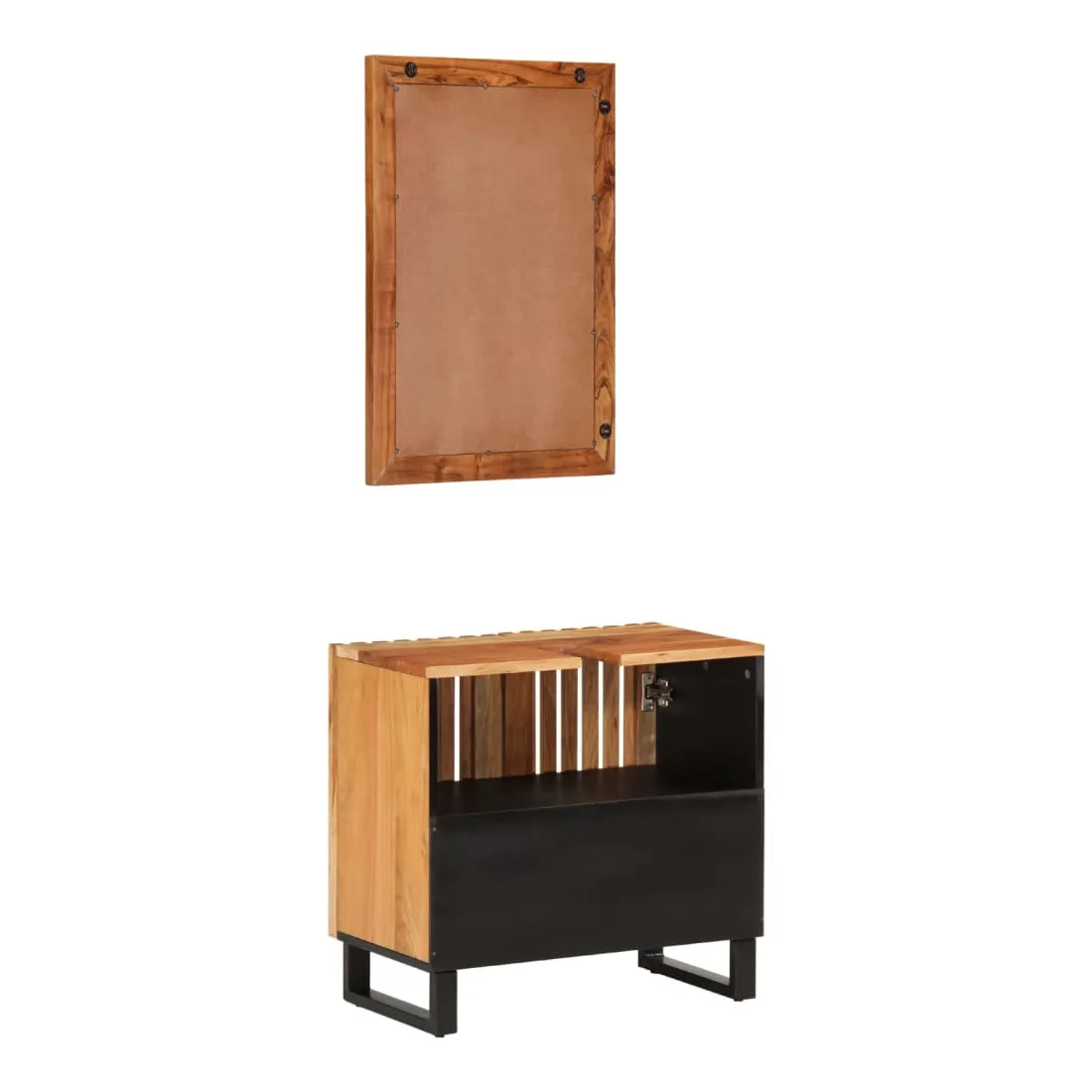 Cet ensemble de meubles de salle de bain en bois est un excellent supplément à votre salle de bain, ce qui lui donne une apparence ordonnée et saisissante !Bois d'acacia massif : l'armoire est fabriqué en bois d'acacia massif combiné avec du bois d'ingénierie. Le bois d'acacia massif est un beau matériau naturel. Le bois d'acacia est un bois dur tropical, dense, robuste et durable.Grand espace de rangement : le meuble de rangement de salle de bain offre diverses options de rangement et un espace spacieux pour ranger des articles dans votre salle de bain.Pieds robustes : les pieds en fer de l'armoire de salle de bain assurent sa robustesse et sa stabilité.Design pratique : le dessus du meuble-lavabo de salle de bain est idéal pour placer le lavabo.Image claire : la face du miroir en verre offre une image claire. Ainsi, vous pouvez profiter d'un reflet magnifique et naturel lorsque vous vous tenez devant. Attention :Pour éviter qu'il ne bascule, ce produit doit être utilisé avec le dispositif de fixation murale fourni.Bon à savoir :Le lavabo n'est pas inclus dans la livraison.Les vis et les chevilles pour l'intérieur du mur ne sont pas incluses. Nous vous conseillons de trouver et d'utiliser des vis et des chevilles adaptées spécifiquement à vos murs. Si vous n'êtes pas sûr, vous pouvez consulter un professionnel. Veuillez lire et suivre chaque étape des instructions.Chaque article est unique, avec des variations de couleurs et de grains. La livraison est aléatoire, ce qui garantit l'exclusivité et l'individualité de votre produit.