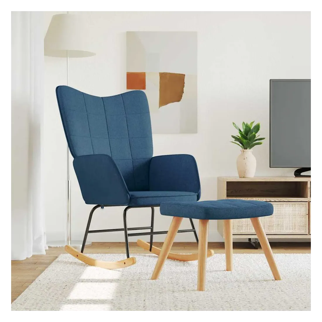 Cette chaise à bascule avec tabouret, au design chic et élégant, apportera une touche de modernité à votre décoration. Dotée de quelques blocs, cette chaise de relaxation est esthétique. Grâce à sa mousse rembourrée recouverte d'un tissu doux au toucher, vous pourrez profiter d'un confort optimal pendant votre temps d'assise. Avec la conception de longs rails à bascule, le fauteuil ne basculera pas facilement. De plus, soutenue par un cadre et des pieds en acier, ainsi que par des rails à bascule en bois, la chaise de salon avec tabouret est stable et durable.