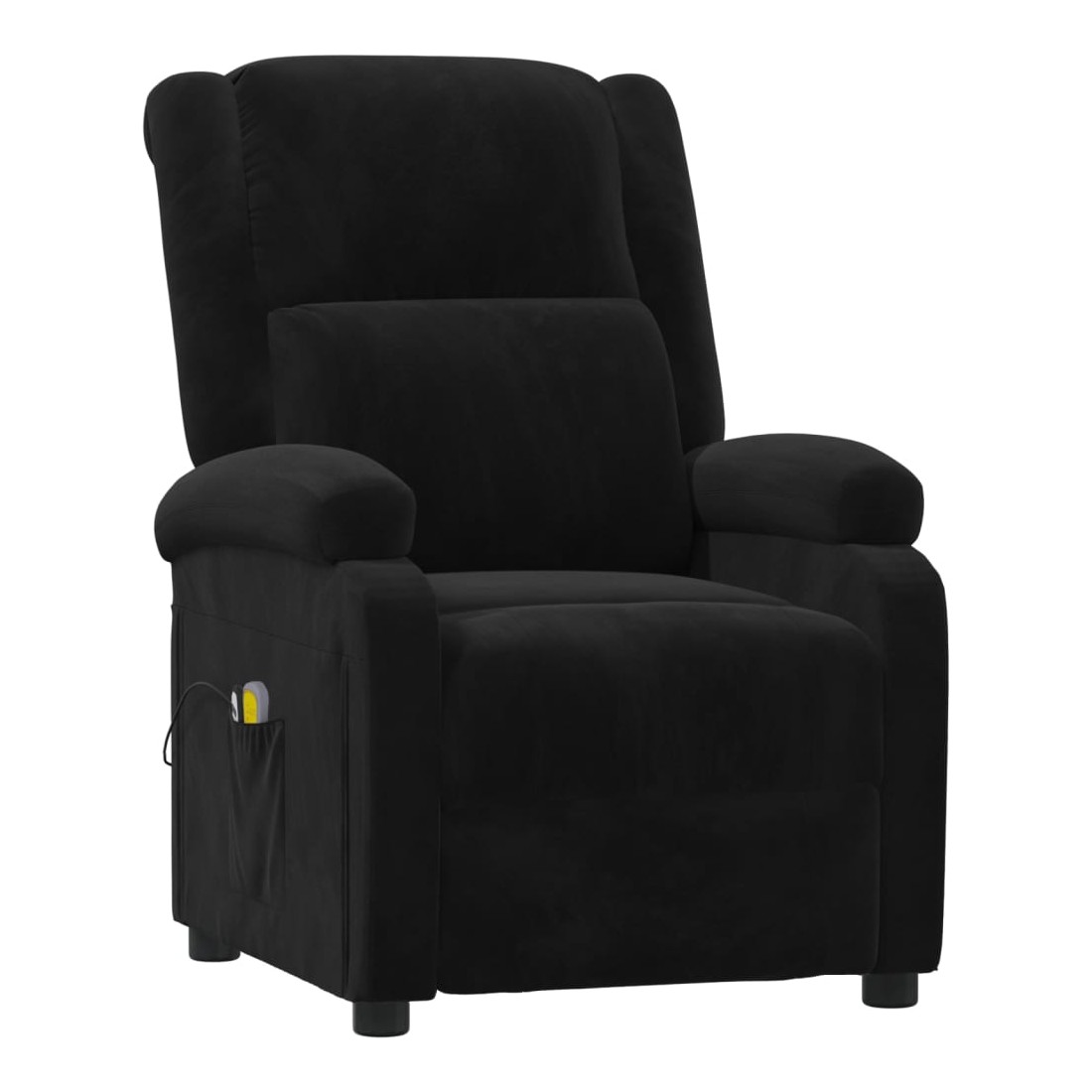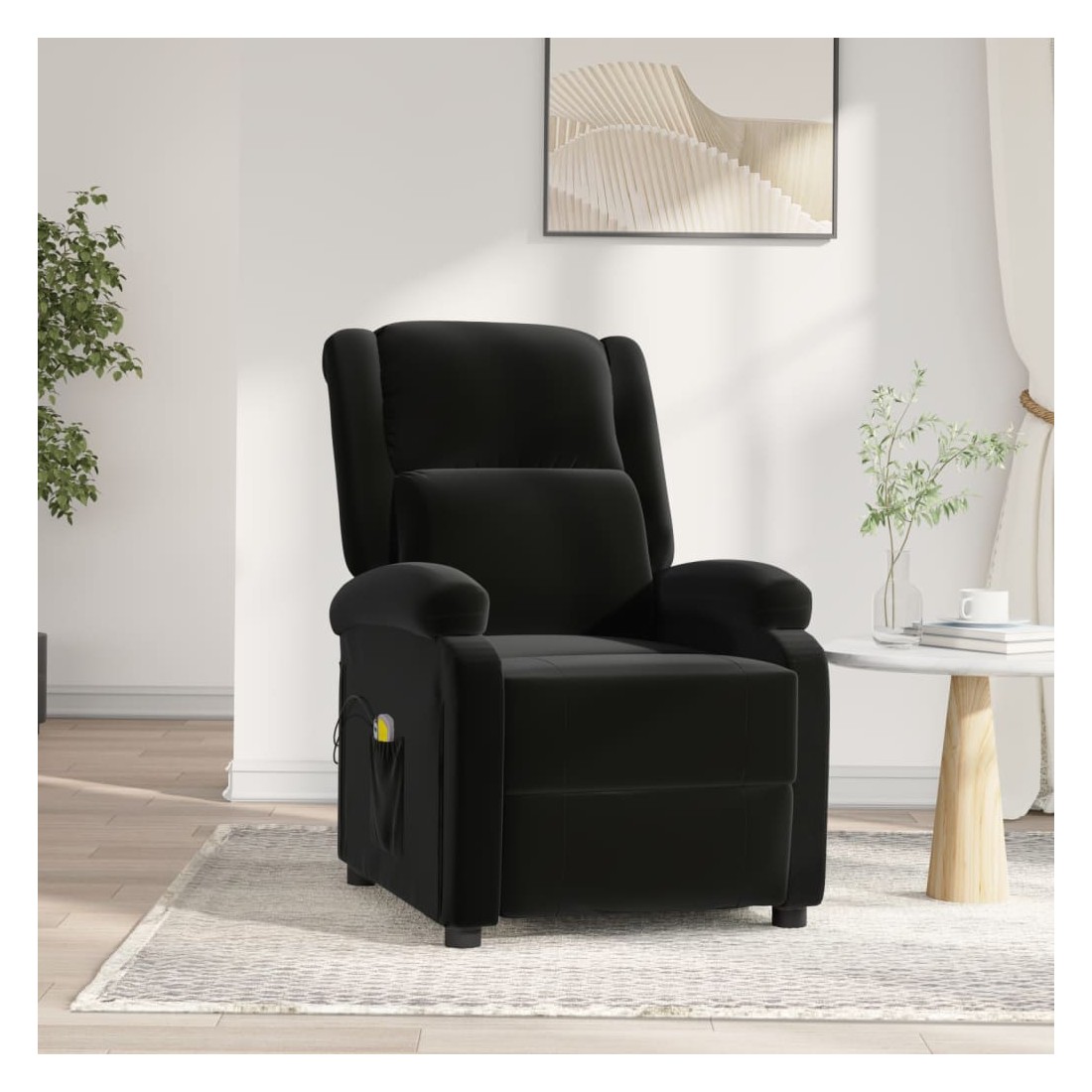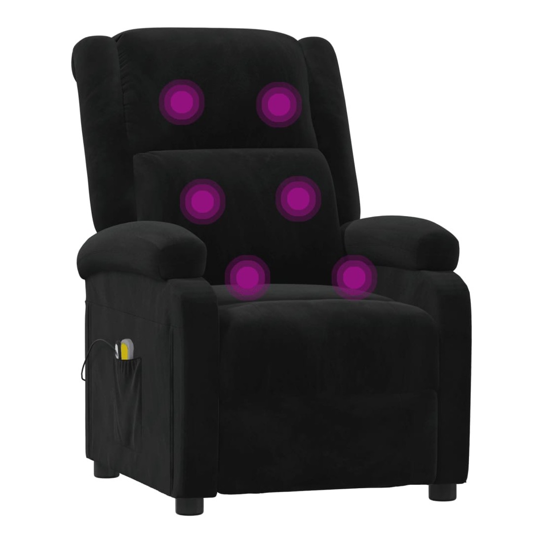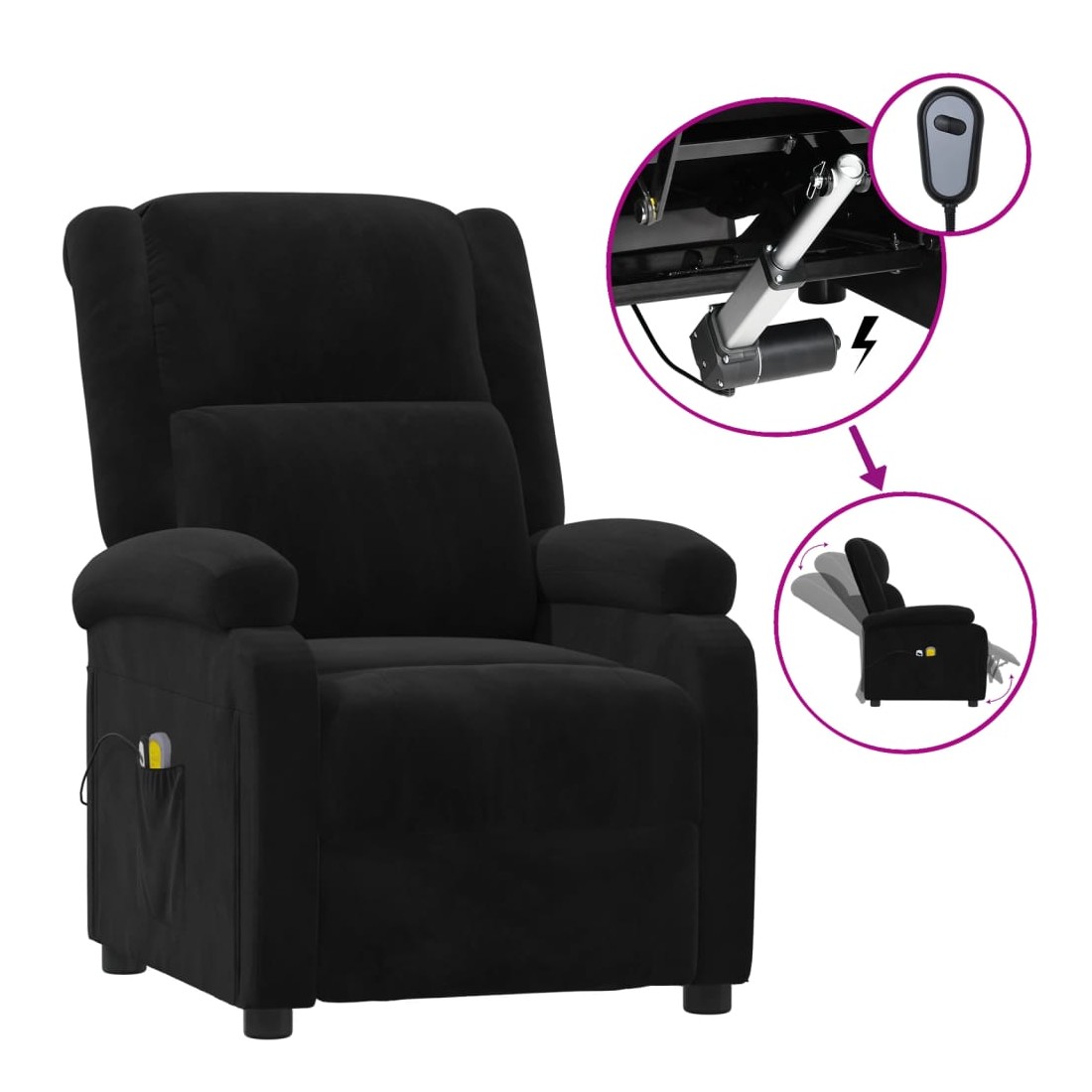 Asseyez-vous et détendez-vous dans ce fauteuil de massage électrique très confortable ! Fonction d'inclinaison électrique : le fauteuil inclinable est équipé d'un moteur électrique pour la fonction d'inclinaison. Il offre 3 positions d'inclinaison et vous pouvez facilement régler le dossier et le repose-pied à l'aide de la commande manuelle à 2 boutons incluse, en fonction de votre confort.Fonction de vibration : les 6 points de massage vous permettent de faire l'expérience d'un massage mieux ciblé. De plus, la télécommande incluse vous permet de choisir différents programmes de massage. La fonction de massage est alimentée par le connecteur USB, mais la source d'alimentation USB 5V certifiée n'est pas incluse.Expérience d'assise confortable : le siège, le dossier et les larges accoudoirs rembourrés épais recouverts de velours procurent une sensation confortable et chaleureuse, vous faisant vous sentir enlacé lorsque vous êtes assis. Le velours est un tissu doux et confortable qui est agréable sur la peau.Cadre solide et stable : le cadre en bois et en métal offre une structure solide et une grande stabilité. Ce fauteuil inclinable est confortable et durable.