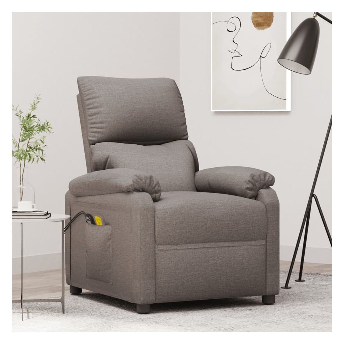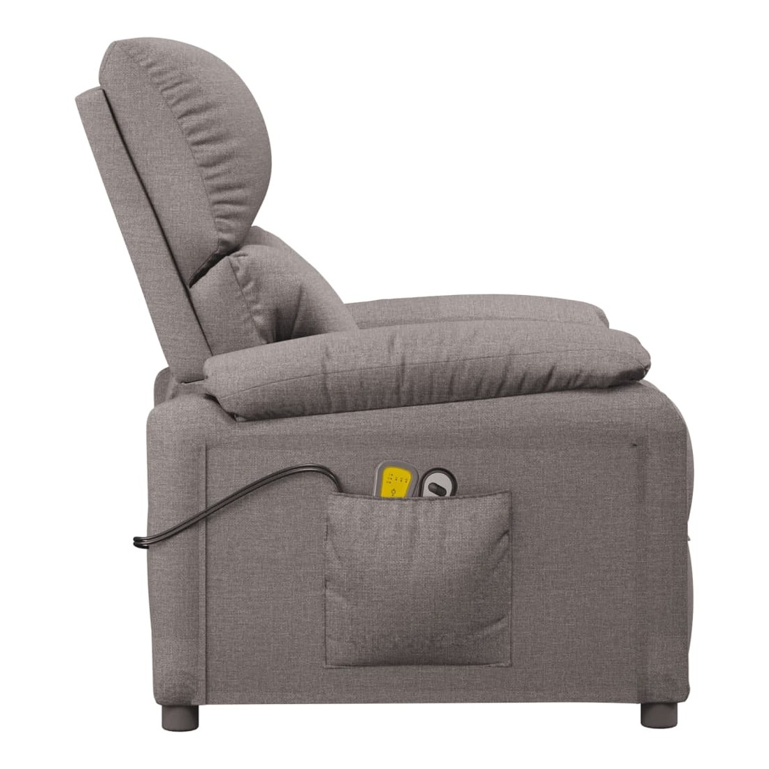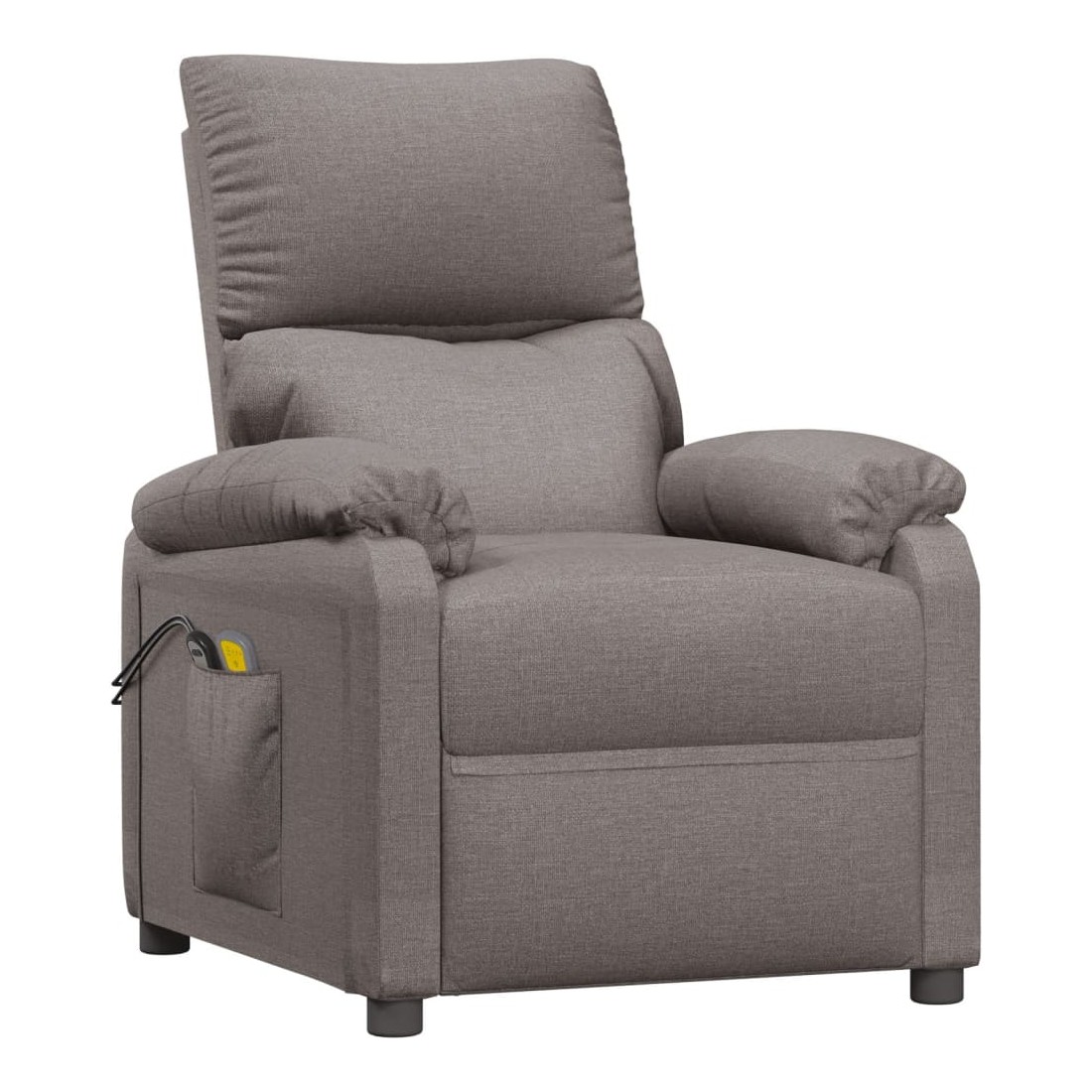 Asseyez-vous et détendez-vous dans ce fauteuil de massage électrique très confortable ! Fonction d'inclinaison électrique : le fauteuil inclinable est équipé d'un moteur électrique pour la fonction d'inclinaison. Il offre 3 positions d'inclinaison et vous pouvez facilement régler le dossier et le repose-pied à l'aide de la commande manuelle à 2 boutons incluse, en fonction de votre confort.Fonction de vibration : les 6 points de massage vous permettent de faire l'expérience d'un massage mieux ciblé. De plus, la télécommande incluse vous permet de choisir différents programmes de massage. La fonction de massage est alimentée par le connecteur USB, mais la source d'alimentation USB 5V certifiée n'est pas incluse.Expérience d'assise confortable : le siège, le dossier et les larges accoudoirs rembourrés épais recouverts de tissu procurent une sensation confortable et chaleureuse, vous permettant de vous sentir enveloppé lorsque vous êtes assis. Le tissu présente un aspect simple et épuré, et est respirant et durable.Cadre solide et stable : le cadre en bois et en métal offre une structure solide et une grande stabilité. Ce fauteuil inclinable est confortable et durable.