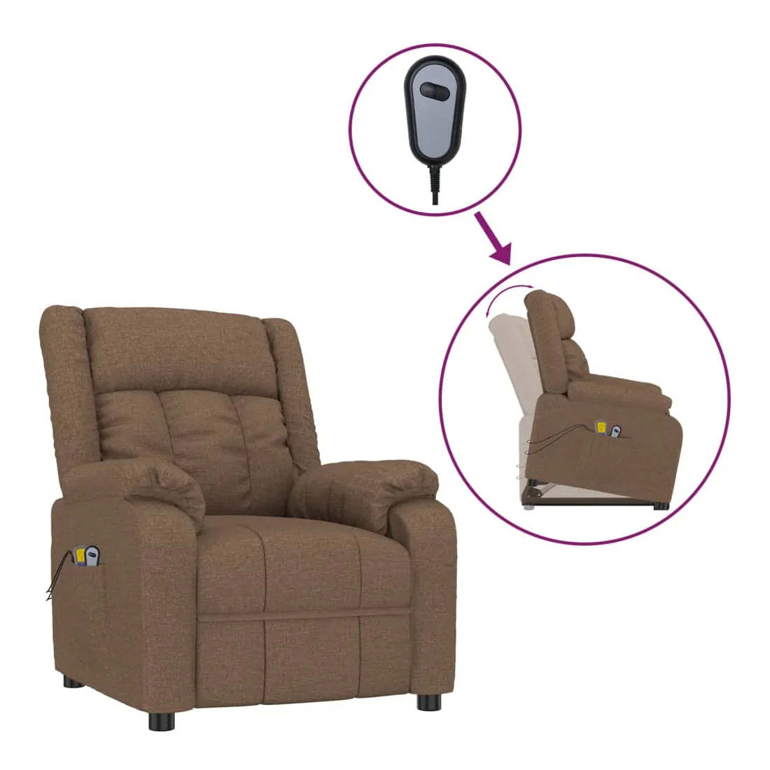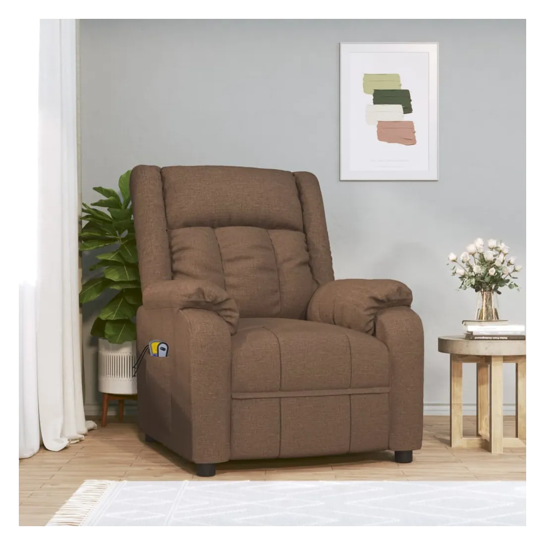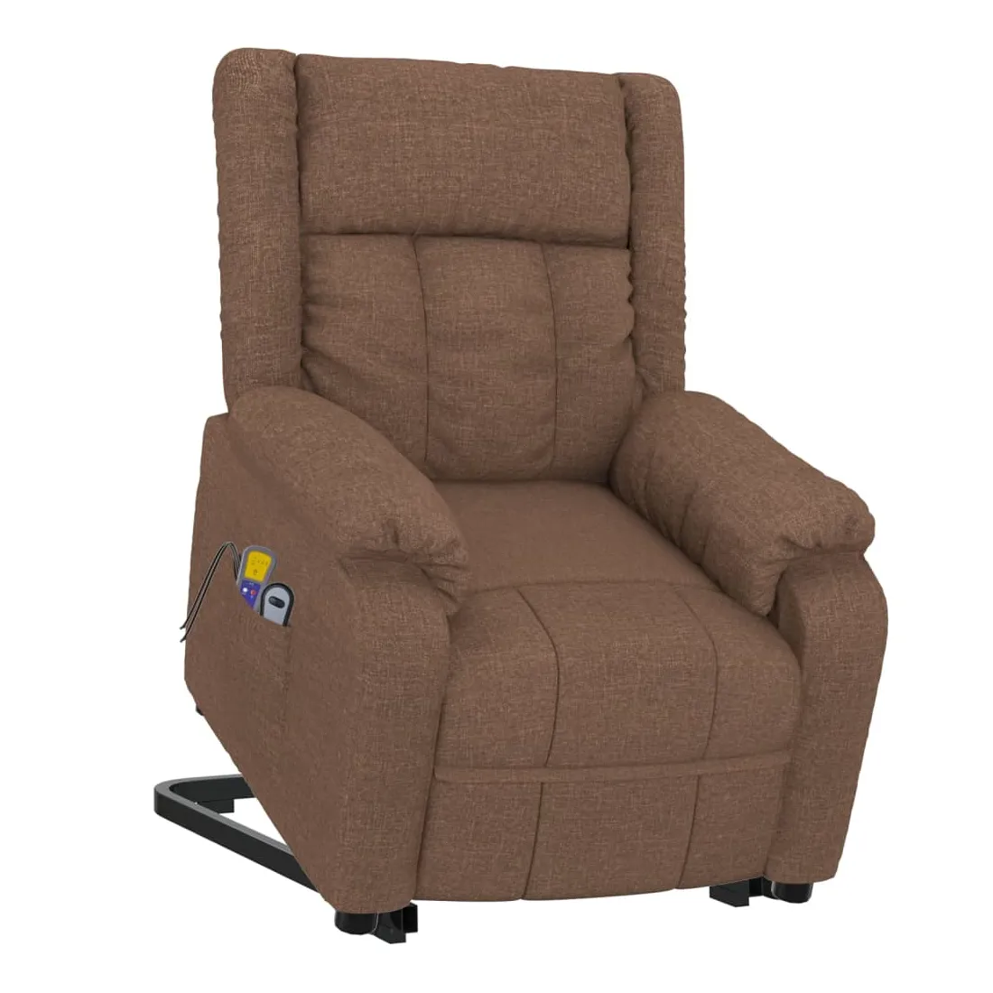 Asseyez-vous et détendez-vous dans ce fauteuil de massage très confortable ! Fonction d'inclinaison manuelle : le fauteuil inclinable est spécialement conçu avec 3 positions d'inclinaison afin que vous puissiez régler manuellement le dossier et le repose-pieds selon votre confort.Fonction de levage électrique : ce fauteuil inclinable pour personnes âgées est équipé d'un moteur électrique pour la fonction de levage. Grâce à la fonction qui pousse toute la chaise vers le haut, vous pouvez facilement vous tenir debout sans stresser votre dos et vos genoux grâce à la commande manuelle à 2 boutons.Fonction de vibration : les 6 points de massage vous permettent de faire l'expérience d'un massage mieux ciblé. De plus, la télécommande incluse vous permet de choisir différents programmes de massage. La fonction de massage est alimentée par le connecteur USB, mais la source d'alimentation USB 5V certifiée n'est pas incluse.Expérience d'assise confortable : le siège, le dossier et les larges accoudoirs rembourrés épais recouverts de tissu procurent une sensation confortable et chaleureuse, vous permettant de vous sentir enveloppé lorsque vous êtes assis. Le tissu présente un aspect simple et épuré, et est respirant et durable.Cadre solide et stable : le cadre en bois et en métal offre une structure solide et une grande stabilité. Ce fauteuil inclinable est confortable et durable.