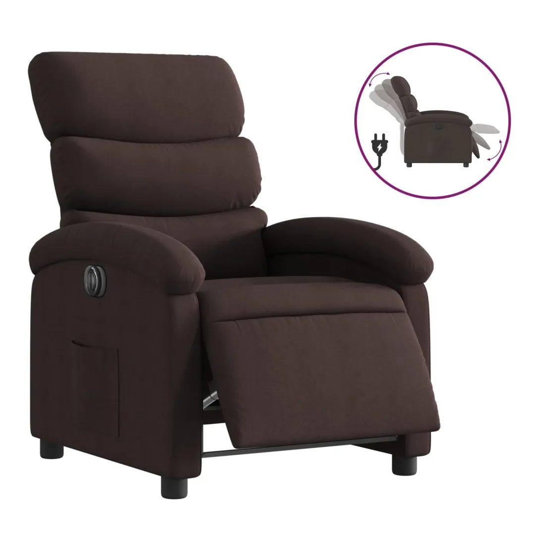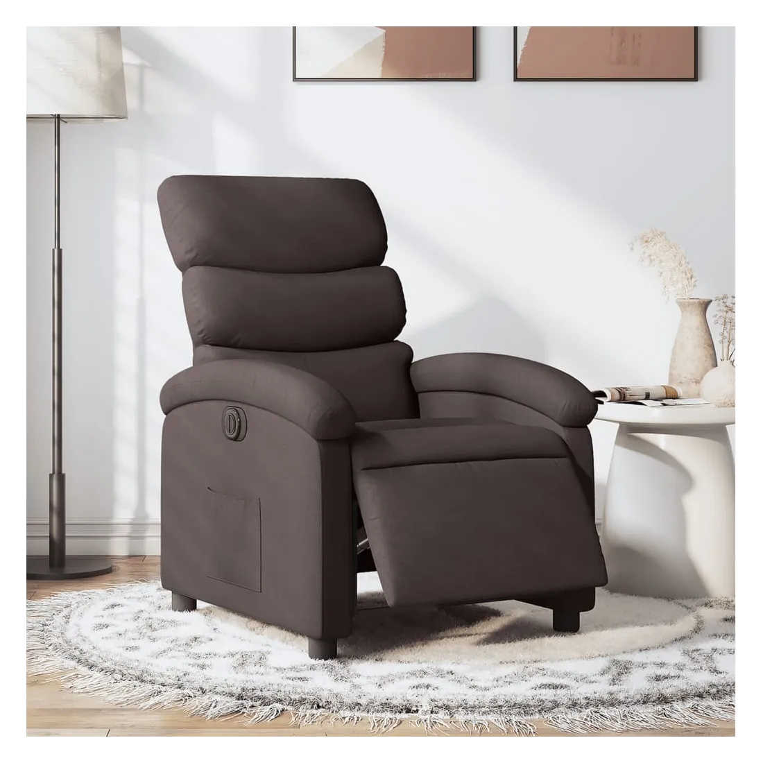 Asseyez-vous et détendez-vous dans ce fauteuil inclinable électrique très confortable ! Fonction d'inclinaison électrique : ce fauteuil inclinable est équipé d'un moteur électrique qui permet de régler automatiquement le repose-pied et le dossier dans n'importe quelle position, selon votre confort, en appuyant simplement sur le bouton situé sur le côté du fauteuil. Cette fonction permet une inclinaison maximale de 135 degrés. En outre, le dossier peut revenir automatiquement à sa position d'origine par une simple pression sur le bouton.Expérience d'assise confortable : le siège, le dossier et les larges accoudoirs bien rembourrés recouverts de tissu procurent une sensation confortable et chaleureuse, vous permettant de vous sentir enveloppé lorsque vous êtes assis. Le tissu présente un aspect simple et épuré et est respirant et durable.Poche latérale pratique : ce fauteuil est doté d'une poche latérale pour vous permettre de garder vos objets essentiels à portée de main.Cadre solide et stable : le cadre en bois et en métal offre une structure solide et une grande stabilité. Ce fauteuil inclinable est confortable et durable.
