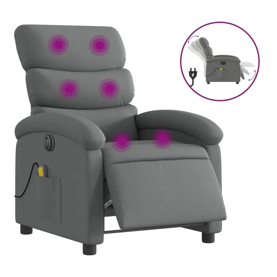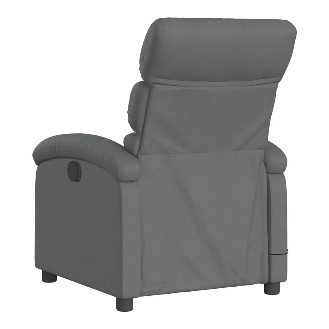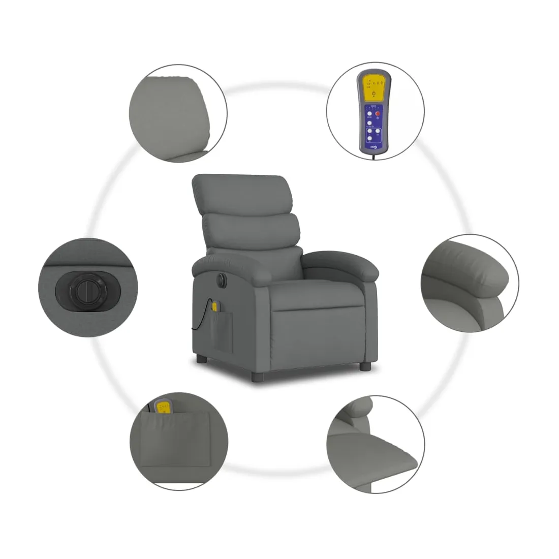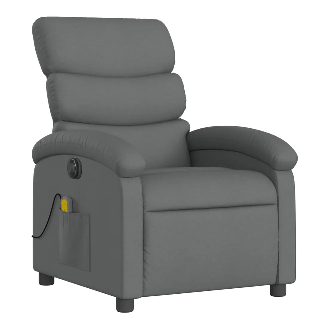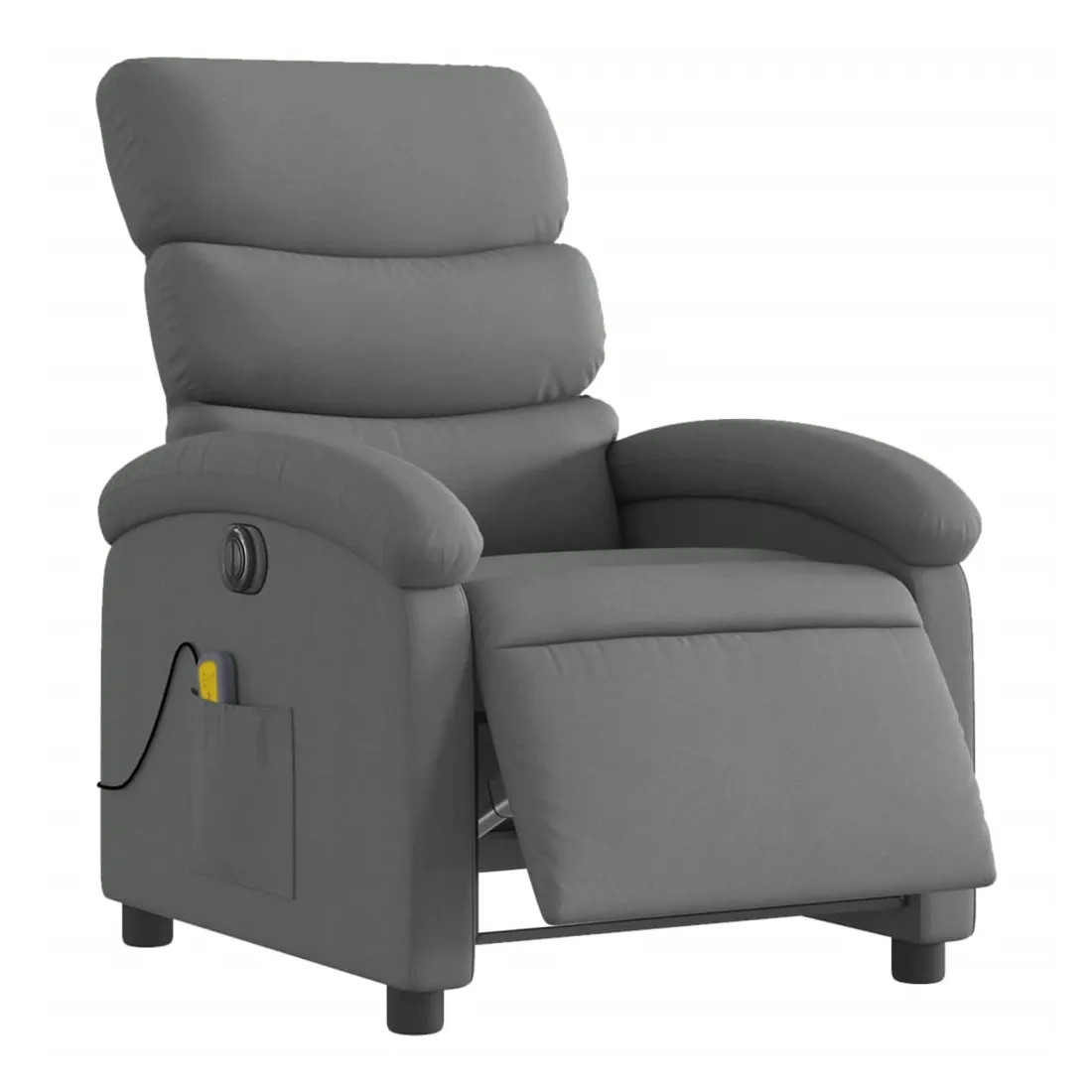 Asseyez-vous et détendez-vous dans ce fauteuil inclinable de massage électrique très confortable ! Fonction d'inclinaison électrique : ce fauteuil inclinable est équipé d'un moteur électrique qui permet de régler automatiquement le repose-pied et le dossier dans n'importe quelle position, selon votre confort, en appuyant simplement sur le bouton situé sur le côté du fauteuil. Cette fonction permet une inclinaison maximale de 135 degrés. En outre, le dossier peut revenir automatiquement à sa position d'origine par une simple pression sur le bouton.Fonction de vibration : les 6 points de massage vous permettent de faire l'expérience d'un massage mieux ciblé. De plus, la télécommande incluse vous permet de choisir différents programmes de massage. La fonction de massage est alimentée par le connecteur USB qui nécessite une source d'alimentation USB certifiée de 5 V (non fournie).Expérience d'assise confortable : le siège, le dossier et les larges accoudoirs bien rembourrés recouverts de tissu procurent une sensation confortable et chaleureuse, vous permettant de vous sentir enveloppé lorsque vous êtes assis. Le tissu présente un aspect simple et épuré et est respirant et durable.Poche latérale pratique : ce fauteuil est doté d'une poche latérale pour ranger votre télécommande ou garder vos objets essentiels à portée de main.Cadre solide et stable : le cadre en bois et en métal offre une structure solide et une grande stabilité. Ce fauteuil inclinable est confortable et durable.