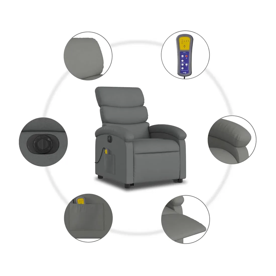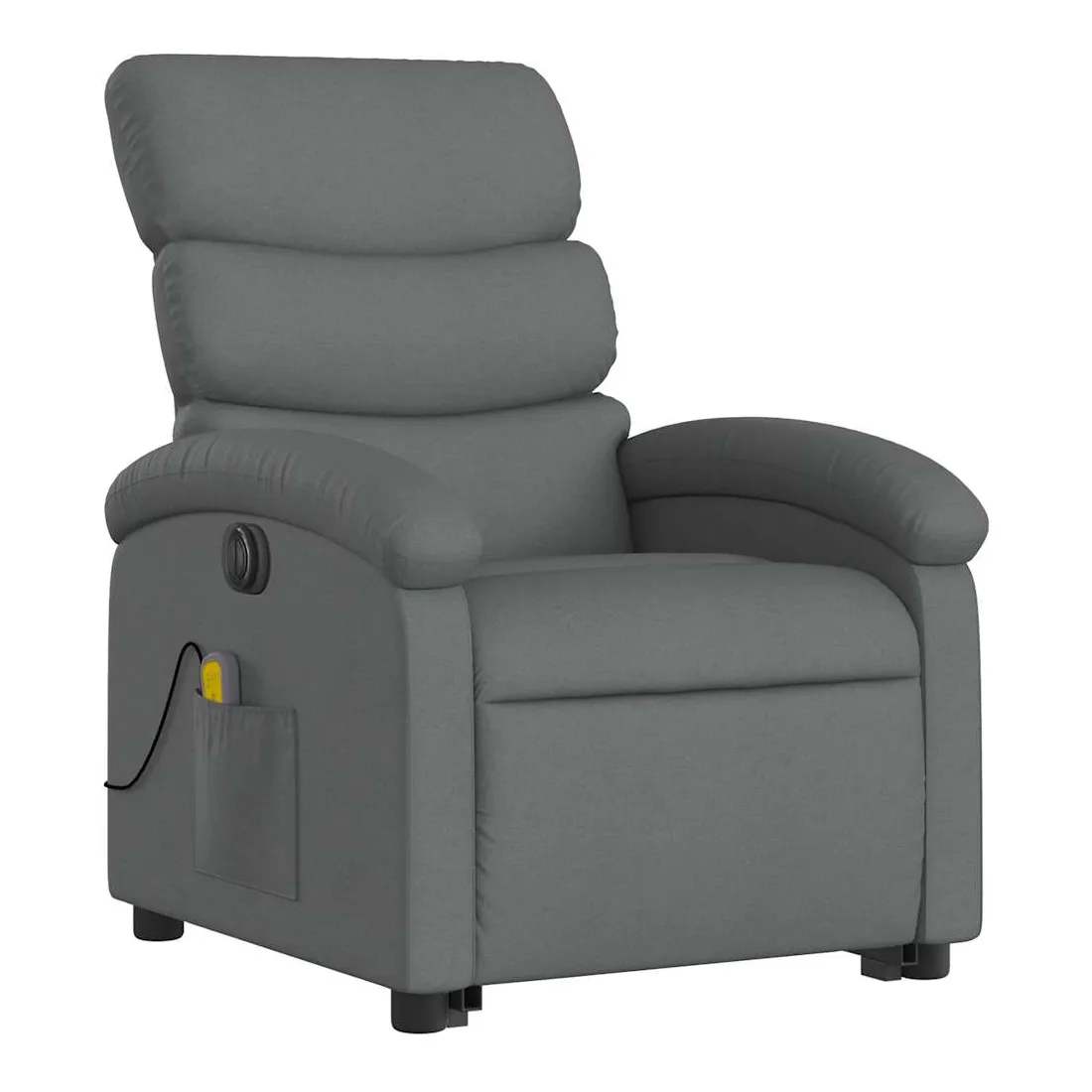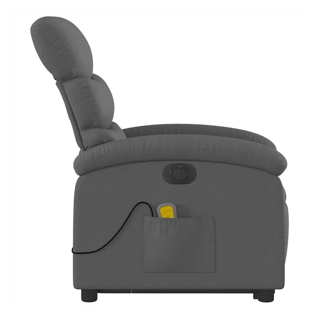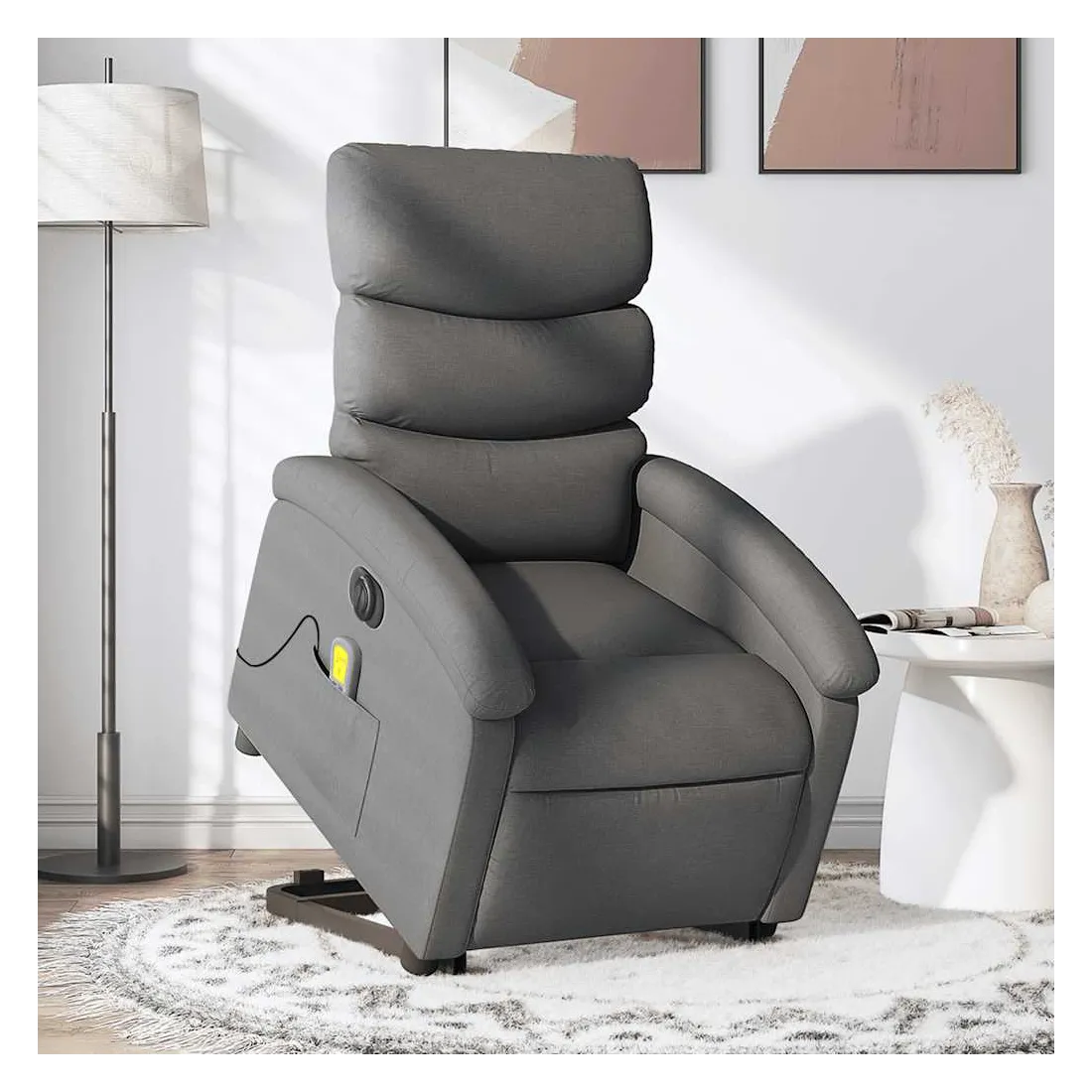 Asseyez-vous et détendez-vous dans ce fauteuil inclinable de massage électrique très confortable ! Fonction de levage électrique : ce fauteuil inclinable pour personnes âgées est équipé d'un moteur électrique pour la fonction de levage. Grâce à la fonction qui pousse toute la chaise vers le haut, vous pouvez facilement vous tenir debout sans stresser votre dos et vos genoux en appuyant simplement sur le bouton.Fonction d'inclinaison électrique : ce fauteuil inclinable est également équipé d'un moteur électrique qui permet de régler automatiquement le repose-pied et le dossier dans n'importe quelle position, selon votre confort, en appuyant simplement sur le bouton situé sur le côté du fauteuil. Cette fonction permet une inclinaison maximale de 135 degrés. En outre, le dossier peut revenir automatiquement à sa position d'origine par une simple pression sur le bouton.Fonction de vibration : les 6 points de massage vous permettent de faire l'expérience d'un massage mieux ciblé. De plus, la télécommande incluse vous permet de choisir différents programmes de massage. La fonction de massage est alimentée par le connecteur USB qui nécessite une source d'alimentation USB certifiée de 5 V (non fournie).Expérience d'assise confortable : le siège, le dossier et les larges accoudoirs bien rembourrés recouverts de tissu procurent une sensation confortable et chaleureuse, vous permettant de vous sentir enveloppé lorsque vous êtes assis. Le tissu présente un aspect simple et épuré et est respirant et durable.Poche latérale pratique : ce fauteuil est doté d'une poche latérale pour ranger votre télécommande ou garder vos objets essentiels à portée de main.Cadre solide et stable : le cadre en bois et en métal offre une structure solide et une grande stabilité. Ce fauteuil inclinable est confortable et durable.