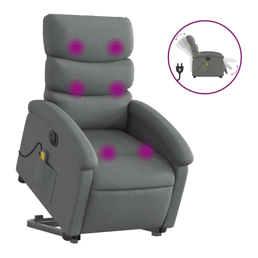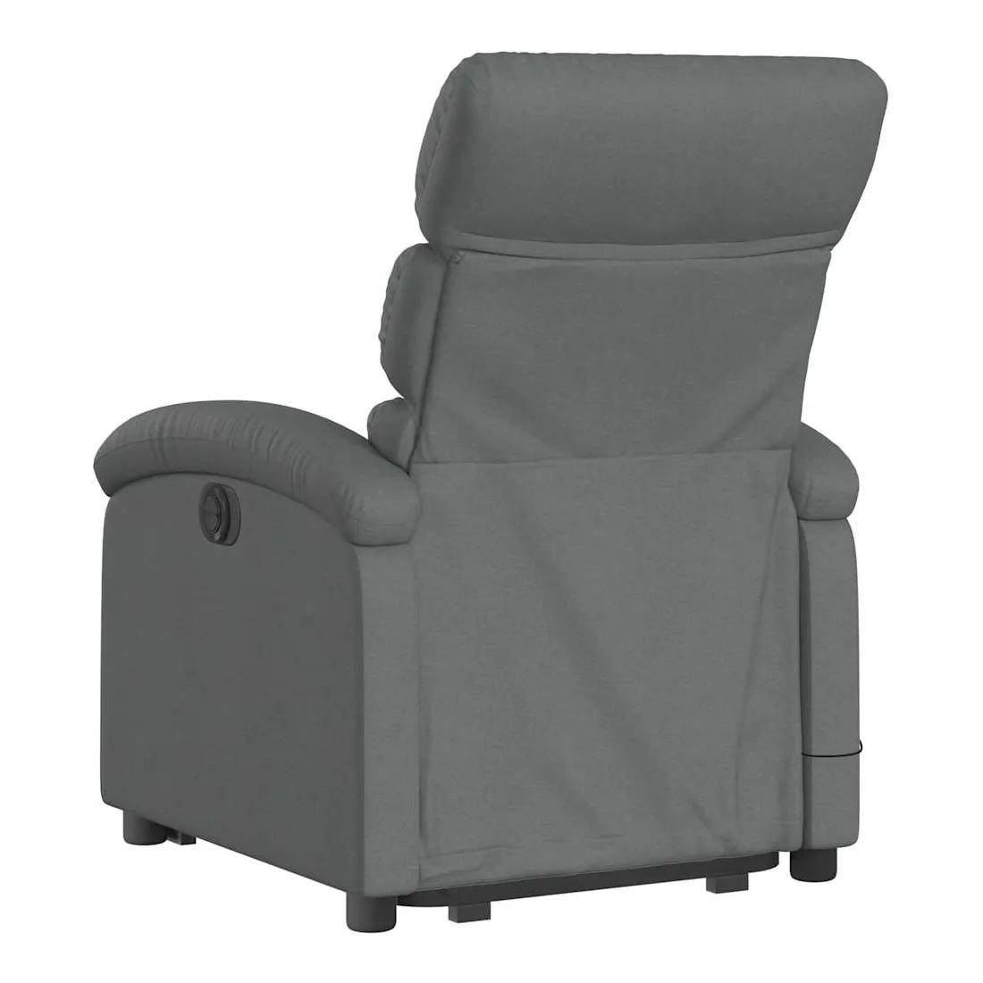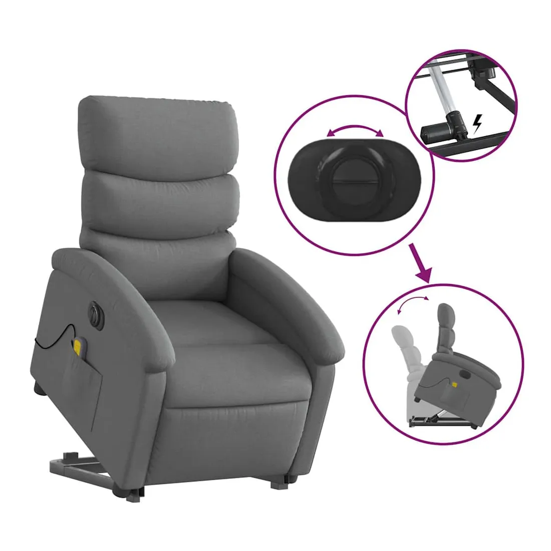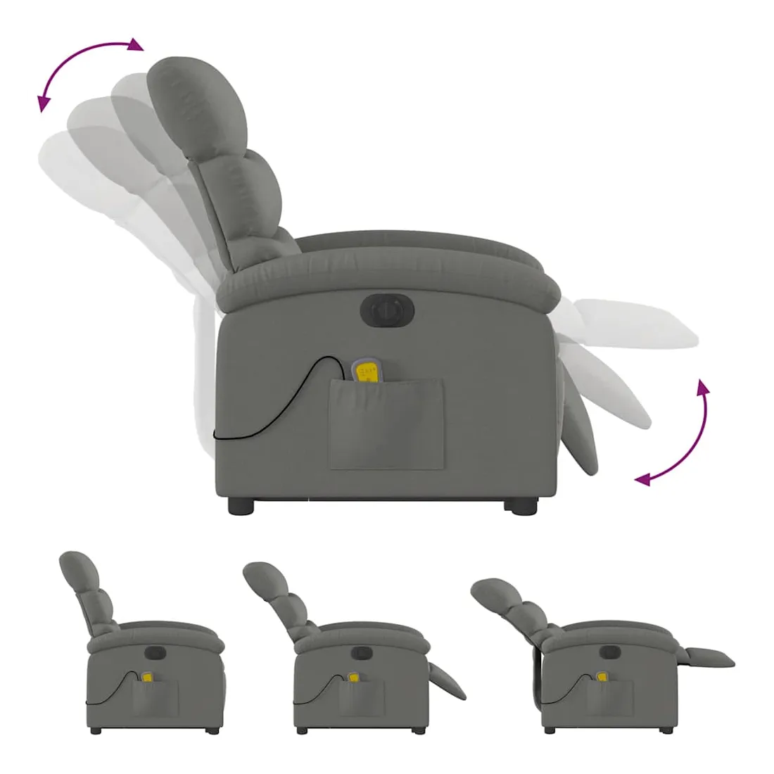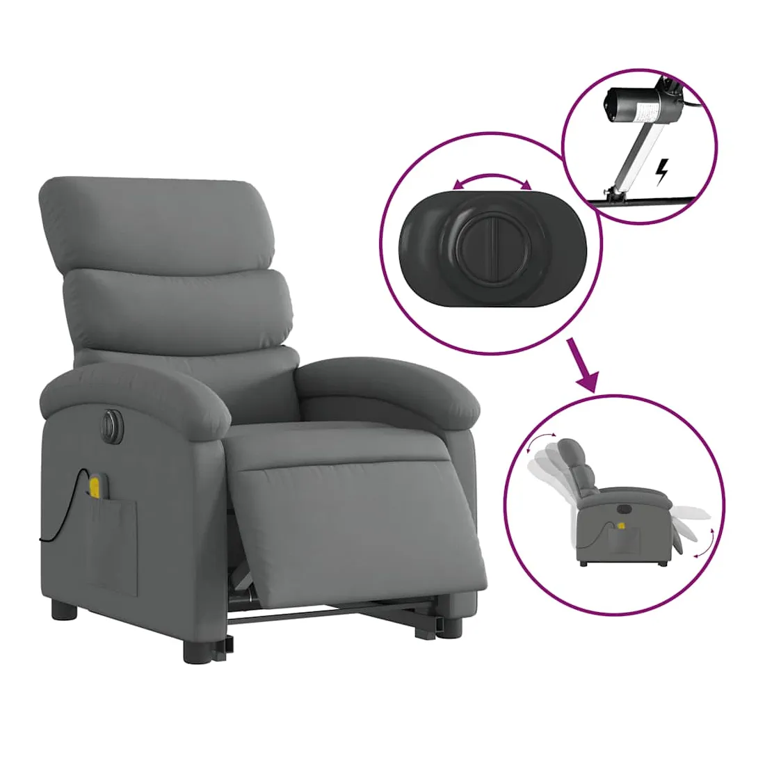 Asseyez-vous et détendez-vous dans ce fauteuil inclinable de massage électrique très confortable ! Fonction de levage électrique : ce fauteuil inclinable pour personnes âgées est équipé d'un moteur électrique pour la fonction de levage. Grâce à la fonction qui pousse toute la chaise vers le haut, vous pouvez facilement vous tenir debout sans stresser votre dos et vos genoux en appuyant simplement sur le bouton.Fonction d'inclinaison électrique : ce fauteuil inclinable est également équipé d'un moteur électrique qui permet de régler automatiquement le repose-pied et le dossier dans n'importe quelle position, selon votre confort, en appuyant simplement sur le bouton situé sur le côté du fauteuil. Cette fonction permet une inclinaison maximale de 135 degrés. En outre, le dossier peut revenir automatiquement à sa position d'origine par une simple pression sur le bouton.Fonction de vibration : les 6 points de massage vous permettent de faire l'expérience d'un massage mieux ciblé. De plus, la télécommande incluse vous permet de choisir différents programmes de massage. La fonction de massage est alimentée par le connecteur USB qui nécessite une source d'alimentation USB certifiée de 5 V (non fournie).Expérience d'assise confortable : le siège, le dossier et les larges accoudoirs bien rembourrés recouverts de tissu procurent une sensation confortable et chaleureuse, vous permettant de vous sentir enveloppé lorsque vous êtes assis. Le tissu présente un aspect simple et épuré et est respirant et durable.Poche latérale pratique : ce fauteuil est doté d'une poche latérale pour ranger votre télécommande ou garder vos objets essentiels à portée de main.Cadre solide et stable : le cadre en bois et en métal offre une structure solide et une grande stabilité. Ce fauteuil inclinable est confortable et durable.