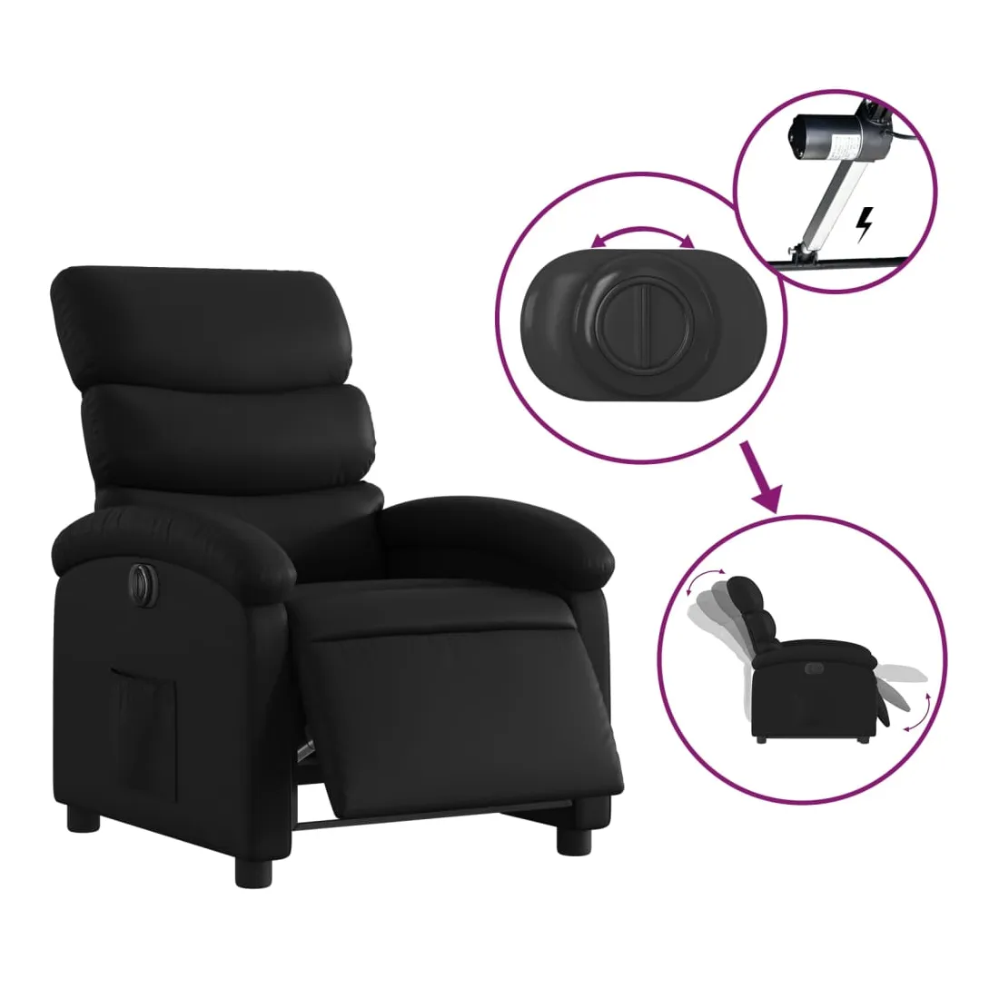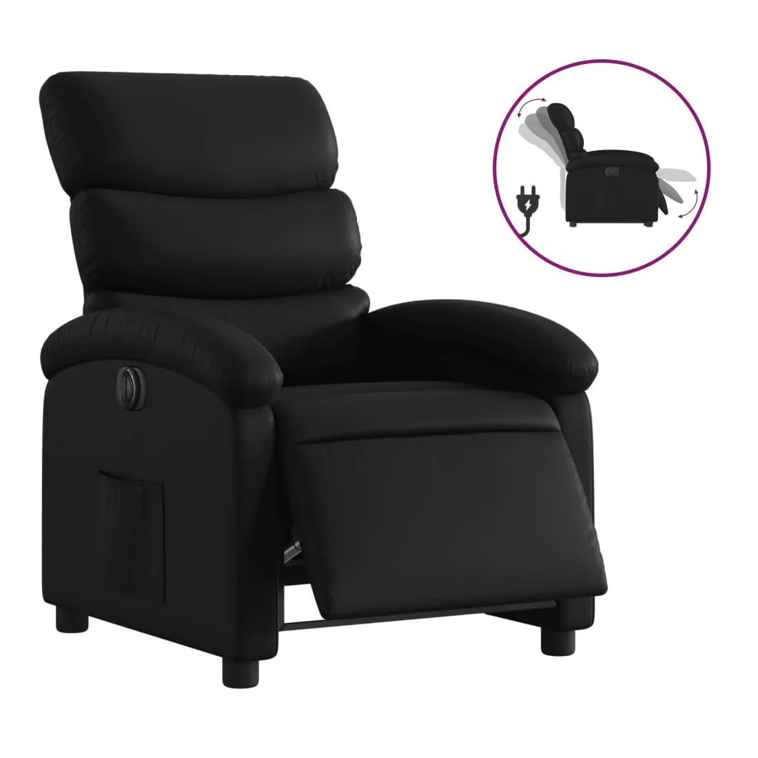 Asseyez-vous et détendez-vous dans ce fauteuil inclinable électrique très confortable ! Fonction d'inclinaison électrique : ce fauteuil inclinable est équipé d'un moteur électrique qui permet de régler automatiquement le repose-pied et le dossier dans n'importe quelle position, selon votre confort, en appuyant simplement sur le bouton situé sur le côté du fauteuil. Cette fonction permet une inclinaison maximale de 135 degrés. En outre, le dossier peut revenir automatiquement à sa position d'origine par une simple pression sur le bouton.Expérience de siège confortable : le siège, le dossier et les larges accoudoirs rembourrés épais recouverts de similicuir procurent une sensation confortable, vous faisant vous sentir enlacé lorsque vous êtes assis. Le similicuir est un matériau très résistant. Il est résistant aux taches, ce qui le rend facile à nettoyer avec un chiffon humide. La surface lisse donne également un aspect luxueux et la beauté du cuir véritable.Poche latérale pratique : ce fauteuil est doté d'une poche latérale pour vous permettre de garder vos objets essentiels à portée de main.Cadre solide et stable : le cadre en bois et en métal offre une structure solide et une grande stabilité. Ce fauteuil inclinable est confortable et durable.