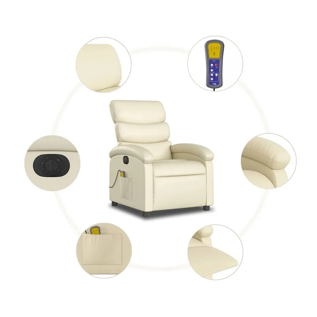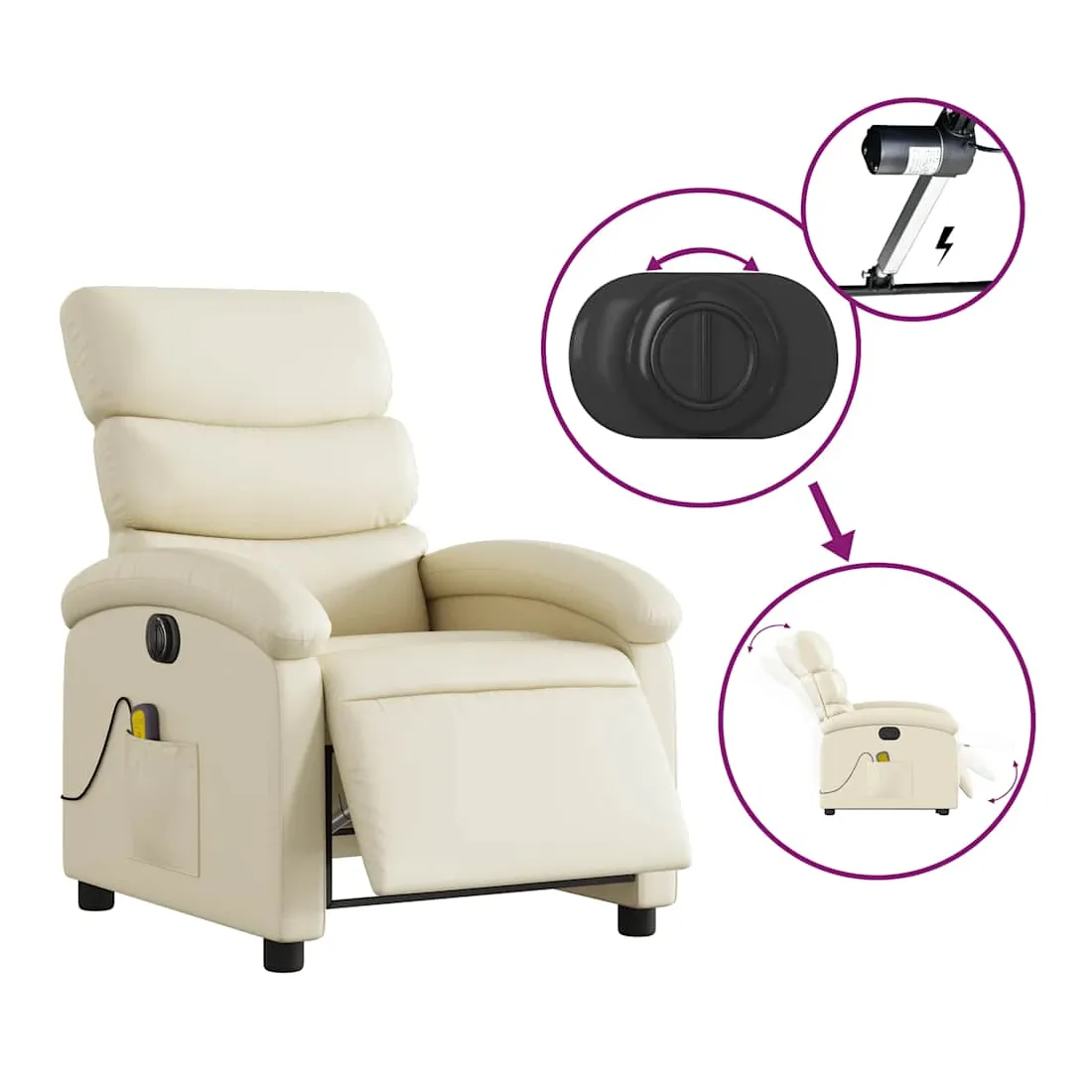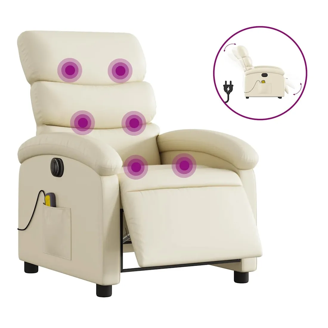 Asseyez-vous et détendez-vous dans ce fauteuil inclinable de massage électrique très confortable ! Fonction d'inclinaison électrique : ce fauteuil inclinable est équipé d'un moteur électrique qui permet de régler automatiquement le repose-pied et le dossier dans n'importe quelle position, selon votre confort, en appuyant simplement sur le bouton situé sur le côté du fauteuil. Cette fonction permet une inclinaison maximale de 135 degrés. En outre, le dossier peut revenir automatiquement à sa position d'origine par une simple pression sur le bouton.Fonction de vibration : les 6 points de massage vous permettent de faire l'expérience d'un massage mieux ciblé. De plus, la télécommande incluse vous permet de choisir différents programmes de massage. La fonction de massage est alimentée par le connecteur USB qui nécessite une source d'alimentation USB certifiée de 5 V (non fournie).Expérience de siège confortable : le siège, le dossier et les larges accoudoirs rembourrés épais recouverts de similicuir procurent une sensation confortable, vous faisant vous sentir enlacé lorsque vous êtes assis. Le similicuir est un matériau très résistant. Il est résistant aux taches, ce qui le rend facile à nettoyer avec un chiffon humide. La surface lisse donne également un aspect luxueux et la beauté du cuir véritable.Poche latérale pratique : ce fauteuil est doté d'une poche latérale pour ranger votre télécommande ou garder vos objets essentiels à portée de main.Cadre solide et stable : le cadre en bois et en métal offre une structure solide et une grande stabilité. Ce fauteuil inclinable est confortable et durable.