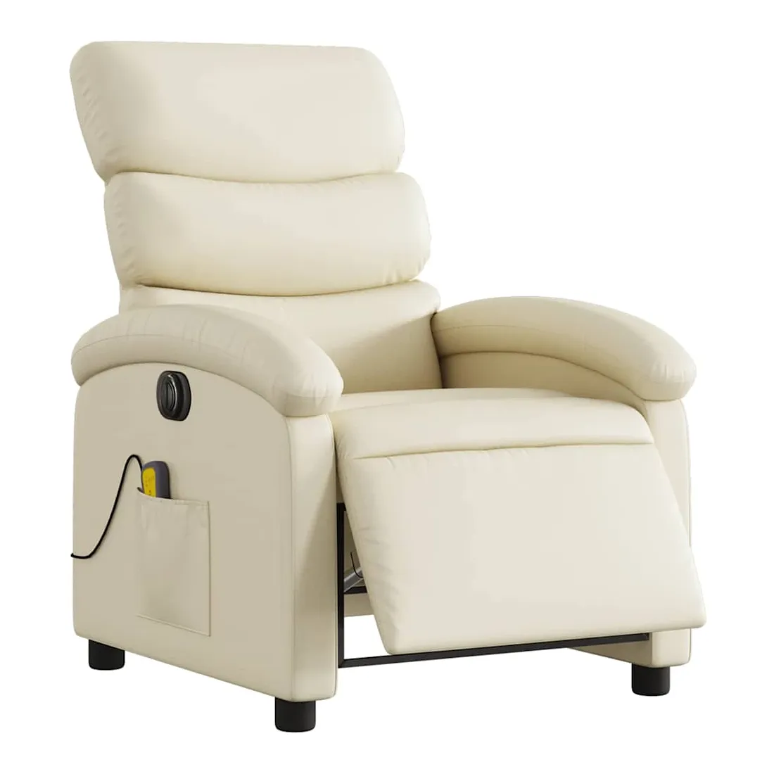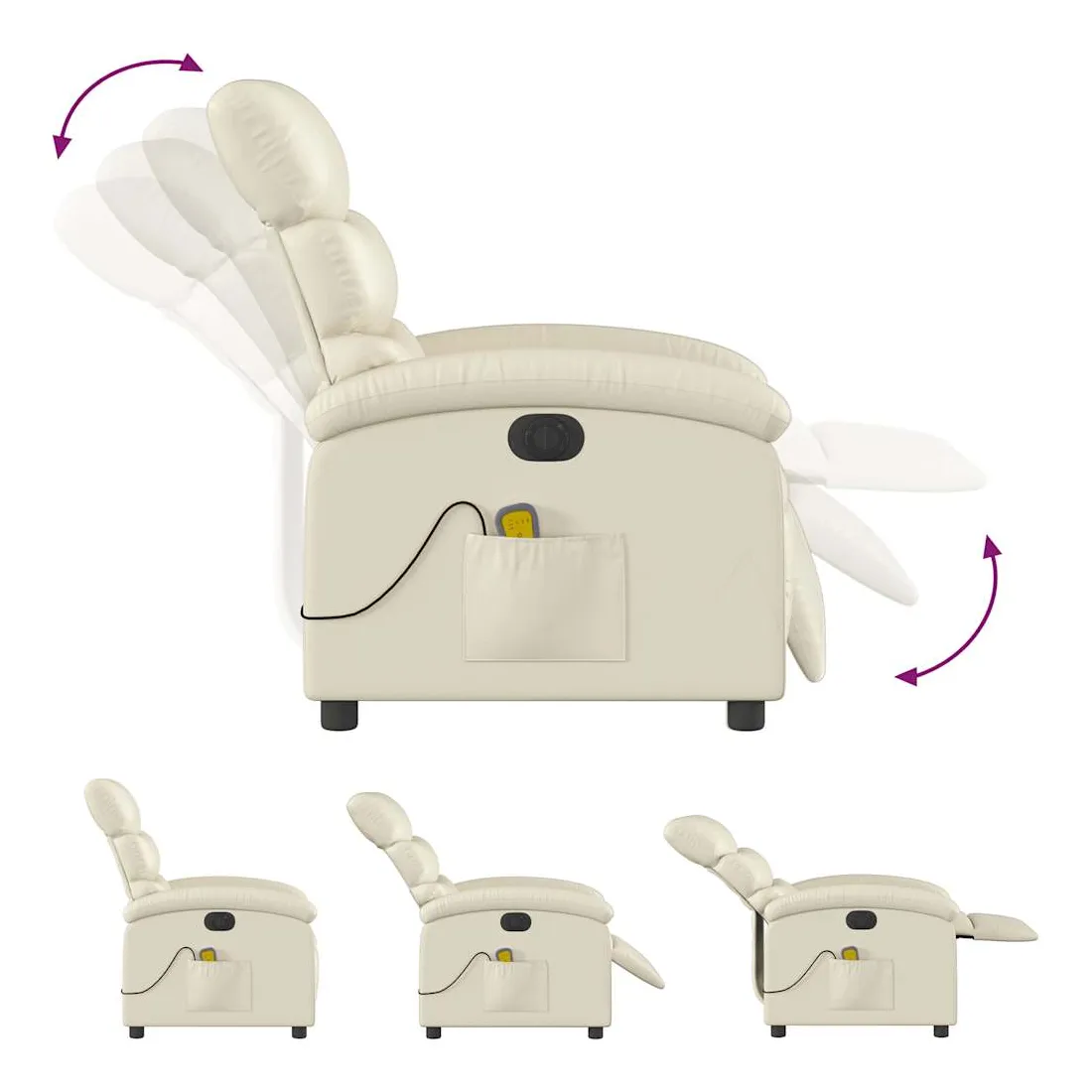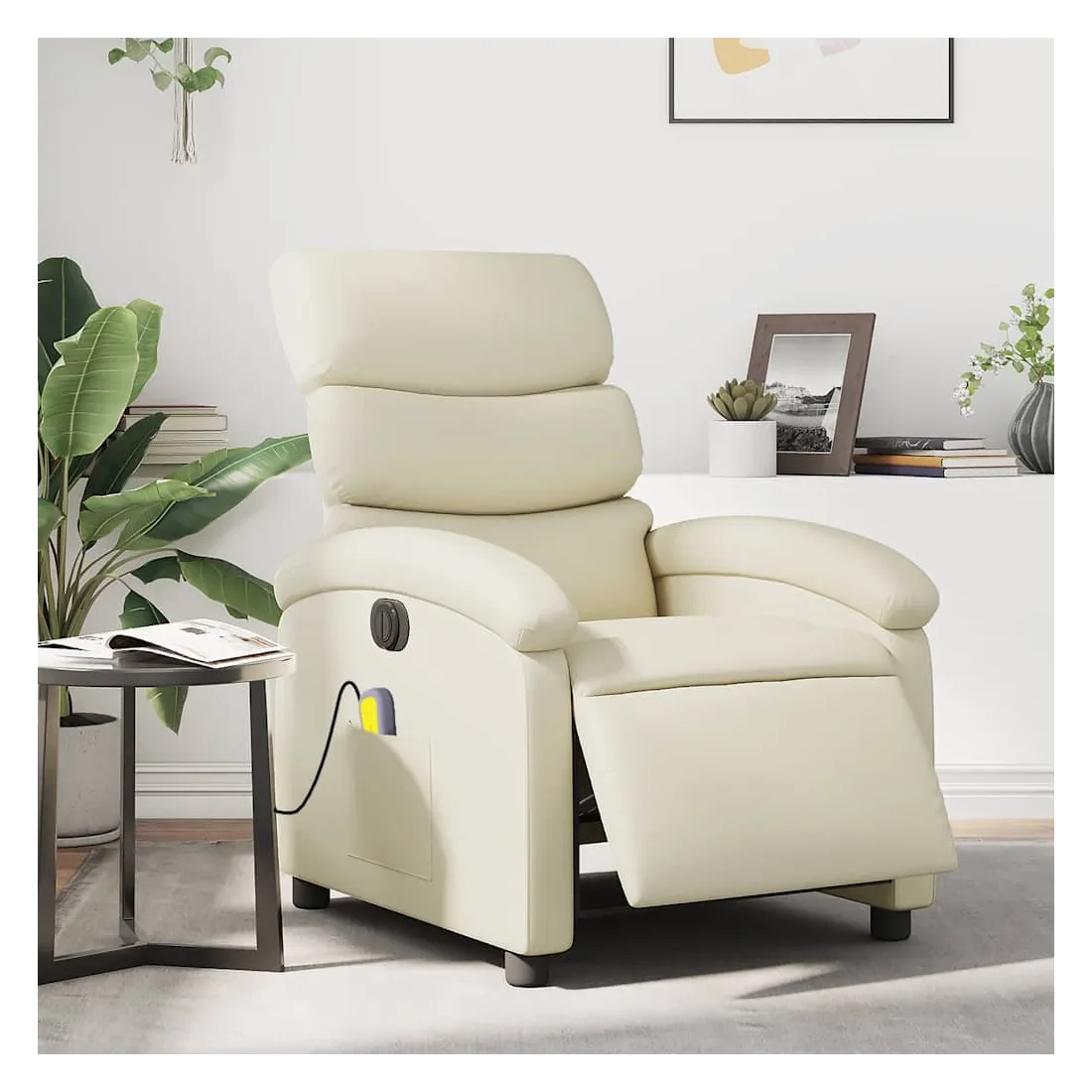 Asseyez-vous et détendez-vous dans ce fauteuil inclinable de massage électrique très confortable ! Fonction d'inclinaison électrique : ce fauteuil inclinable est équipé d'un moteur électrique qui permet de régler automatiquement le repose-pied et le dossier dans n'importe quelle position, selon votre confort, en appuyant simplement sur le bouton situé sur le côté du fauteuil. Cette fonction permet une inclinaison maximale de 135 degrés. En outre, le dossier peut revenir automatiquement à sa position d'origine par une simple pression sur le bouton.Fonction de vibration : les 6 points de massage vous permettent de faire l'expérience d'un massage mieux ciblé. De plus, la télécommande incluse vous permet de choisir différents programmes de massage. La fonction de massage est alimentée par le connecteur USB qui nécessite une source d'alimentation USB certifiée de 5 V (non fournie).Expérience de siège confortable : le siège, le dossier et les larges accoudoirs rembourrés épais recouverts de similicuir procurent une sensation confortable, vous faisant vous sentir enlacé lorsque vous êtes assis. Le similicuir est un matériau très résistant. Il est résistant aux taches, ce qui le rend facile à nettoyer avec un chiffon humide. La surface lisse donne également un aspect luxueux et la beauté du cuir véritable.Poche latérale pratique : ce fauteuil est doté d'une poche latérale pour ranger votre télécommande ou garder vos objets essentiels à portée de main.Cadre solide et stable : le cadre en bois et en métal offre une structure solide et une grande stabilité. Ce fauteuil inclinable est confortable et durable.