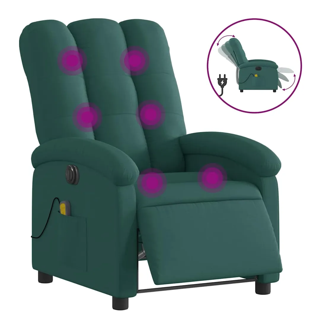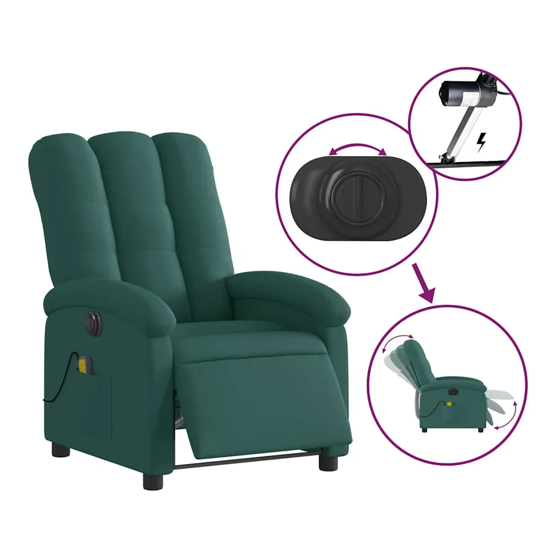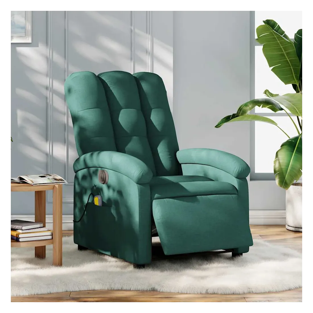 Asseyez-vous et détendez-vous dans ce fauteuil inclinable de massage électrique très confortable ! Fonction d'inclinaison électrique : ce fauteuil inclinable est équipé d'un moteur électrique qui permet de régler automatiquement le repose-pied et le dossier dans n'importe quelle position, selon votre confort, en appuyant simplement sur le bouton situé sur le côté du fauteuil. Cette fonction permet une inclinaison maximale de 135 degrés. En outre, le dossier peut revenir automatiquement à sa position d'origine par une simple pression sur le bouton.Fonction de vibration : les 6 points de massage vous permettent de faire l'expérience d'un massage mieux ciblé. De plus, la télécommande incluse vous permet de choisir différents programmes de massage. La fonction de massage est alimentée par le connecteur USB qui nécessite une source d'alimentation USB certifiée de 5 V (non fournie).Expérience d'assise confortable : le siège, le dossier et les larges accoudoirs bien rembourrés recouverts de tissu procurent une sensation confortable et chaleureuse, vous permettant de vous sentir enveloppé lorsque vous êtes assis. Le tissu présente un aspect simple et épuré et est respirant et durable.Poche latérale pratique : ce fauteuil est doté d'une poche latérale pour ranger votre télécommande ou garder vos objets essentiels à portée de main.Cadre solide et stable : le cadre en bois et en métal offre une structure solide et une grande stabilité. Ce fauteuil inclinable est confortable et durable.