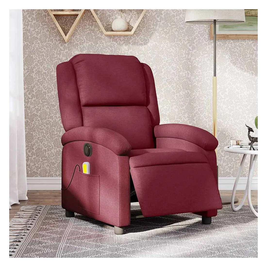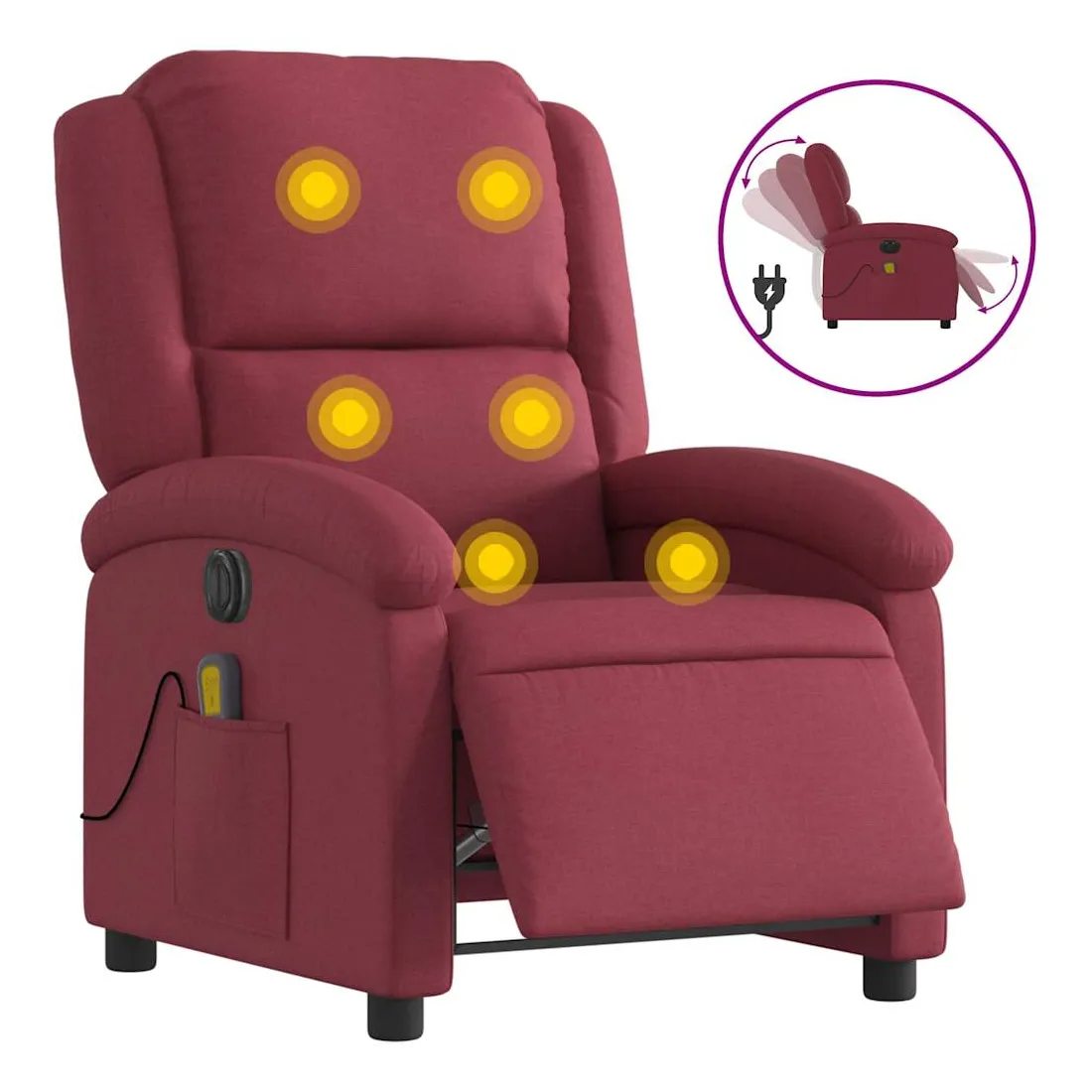 Asseyez-vous et détendez-vous dans ce fauteuil inclinable de massage électrique très confortable ! Fonction d'inclinaison électrique : ce fauteuil inclinable est équipé d'un moteur électrique qui permet de régler automatiquement le repose-pied et le dossier dans n'importe quelle position, selon votre confort, en appuyant simplement sur le bouton situé sur le côté du fauteuil. Cette fonction permet une inclinaison maximale de 135 degrés. En outre, le dossier peut revenir automatiquement à sa position d'origine par une simple pression sur le bouton.Fonction de vibration : les 6 points de massage vous permettent de faire l'expérience d'un massage mieux ciblé. De plus, la télécommande incluse vous permet de choisir différents programmes de massage. La fonction de massage est alimentée par le connecteur USB qui nécessite une source d'alimentation USB certifiée de 5 V (non fournie).Expérience d'assise confortable : le siège, le dossier et les larges accoudoirs bien rembourrés recouverts de tissu procurent une sensation confortable et chaleureuse, vous permettant de vous sentir enveloppé lorsque vous êtes assis. Le tissu présente un aspect simple et épuré et est respirant et durable.Poche latérale pratique : ce fauteuil est doté d'une poche latérale pour ranger votre télécommande ou garder vos objets essentiels à portée de main.Cadre solide et stable : le cadre en bois et en métal offre une structure solide et une grande stabilité. Ce fauteuil inclinable est confortable et durable.