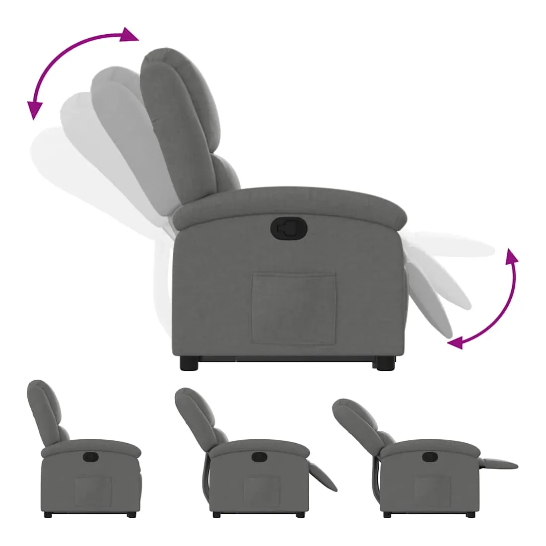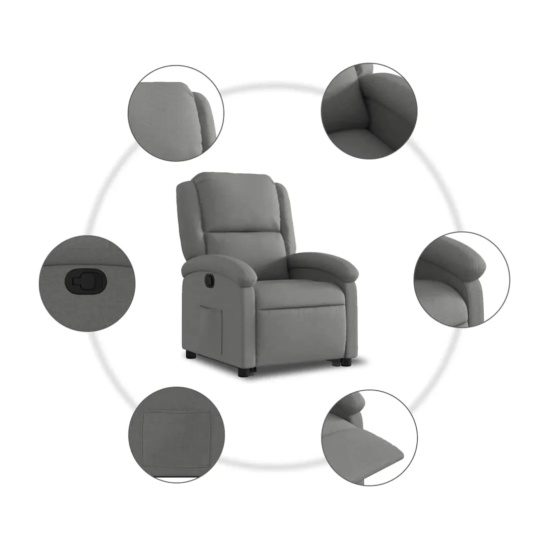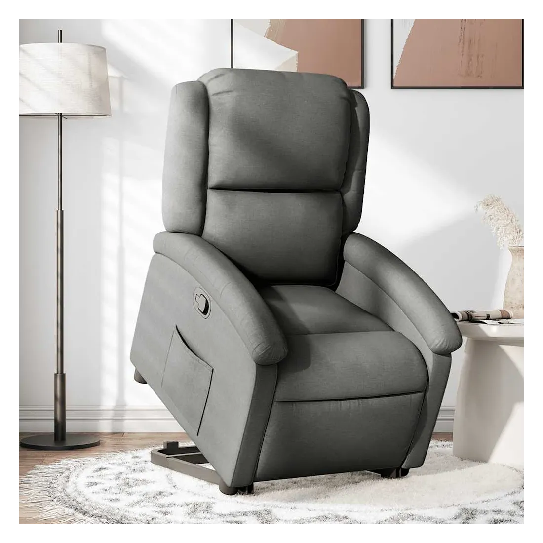 Asseyez-vous et détendez-vous dans ce fauteuil inclinable très confortable ! Fonction de levage électrique : ce fauteuil inclinable pour personnes âgées est équipé d'un moteur électrique pour la fonction de levage. Grâce à la fonction qui pousse toute la chaise vers le haut, vous pouvez facilement vous tenir debout sans stresser votre dos et vos genoux en appuyant simplement sur le bouton.Fonction d'inclinaison manuelle : ce fauteuil inclinable est doté d'une poignée du côté droit. Vous pouvez régler manuellement le repose-pieds et le dossier dans n'importe quelle position selon votre confort en tirant simplement sur la poignée. Cette fonction permet une inclinaison maximale de 135 degrés. De plus, le dossier peut revenir rapidement à sa position d'origine en tirant simplement sur la poignée.Expérience d'assise confortable : le siège, le dossier et les larges accoudoirs bien rembourrés recouverts de tissu procurent une sensation confortable et chaleureuse, vous permettant de vous sentir enveloppé lorsque vous êtes assis. Le tissu présente un aspect simple et épuré et est respirant et durable.Poche latérale pratique : ce fauteuil est doté d'une poche latérale pour vous permettre de garder vos objets essentiels à portée de main.Cadre solide et stable : le cadre en bois et en métal offre une structure solide et une grande stabilité. Ce fauteuil inclinable est confortable et durable.